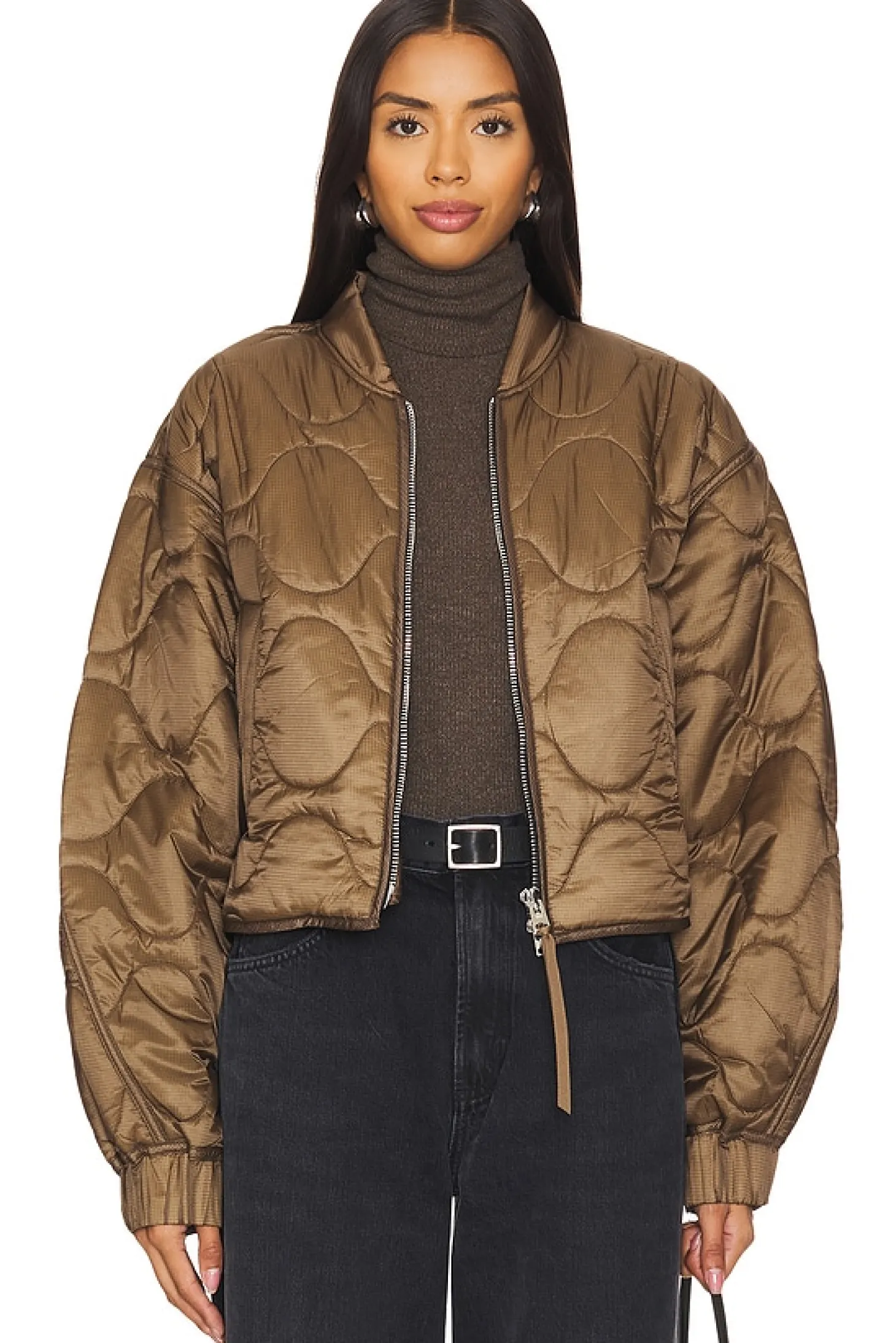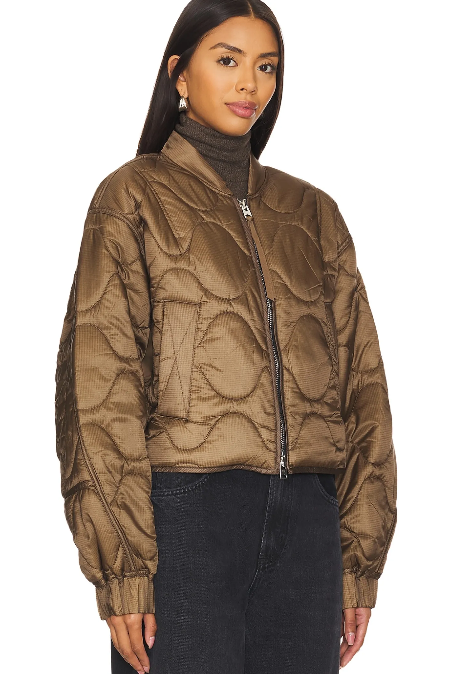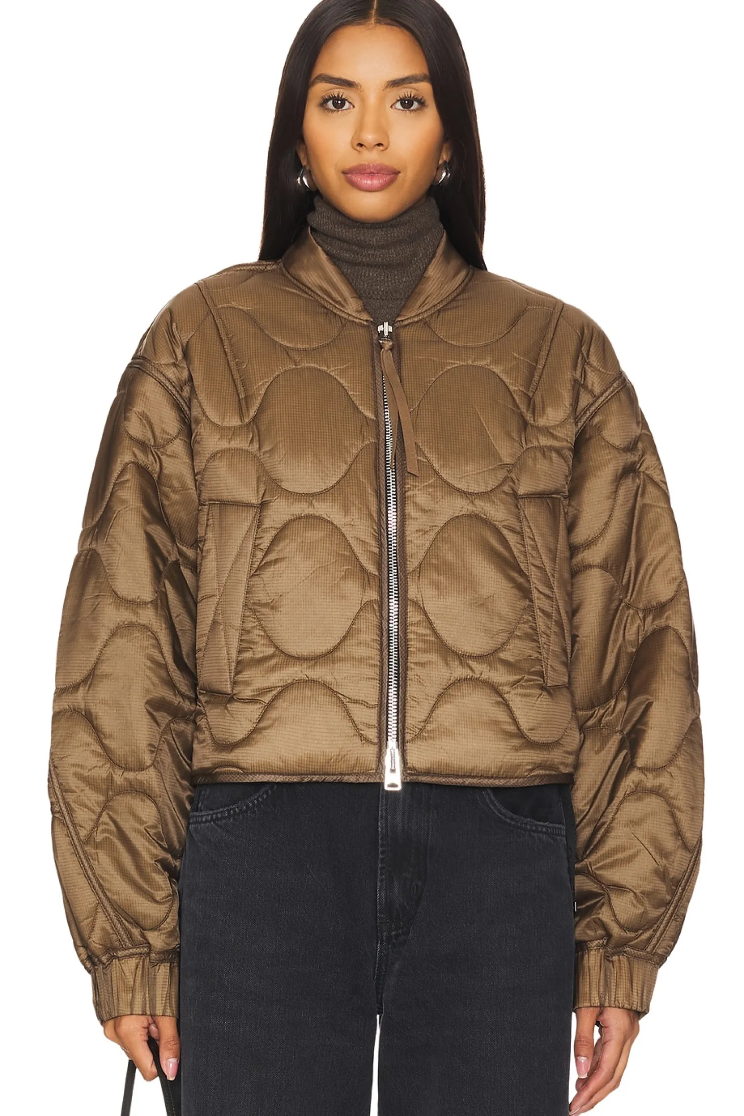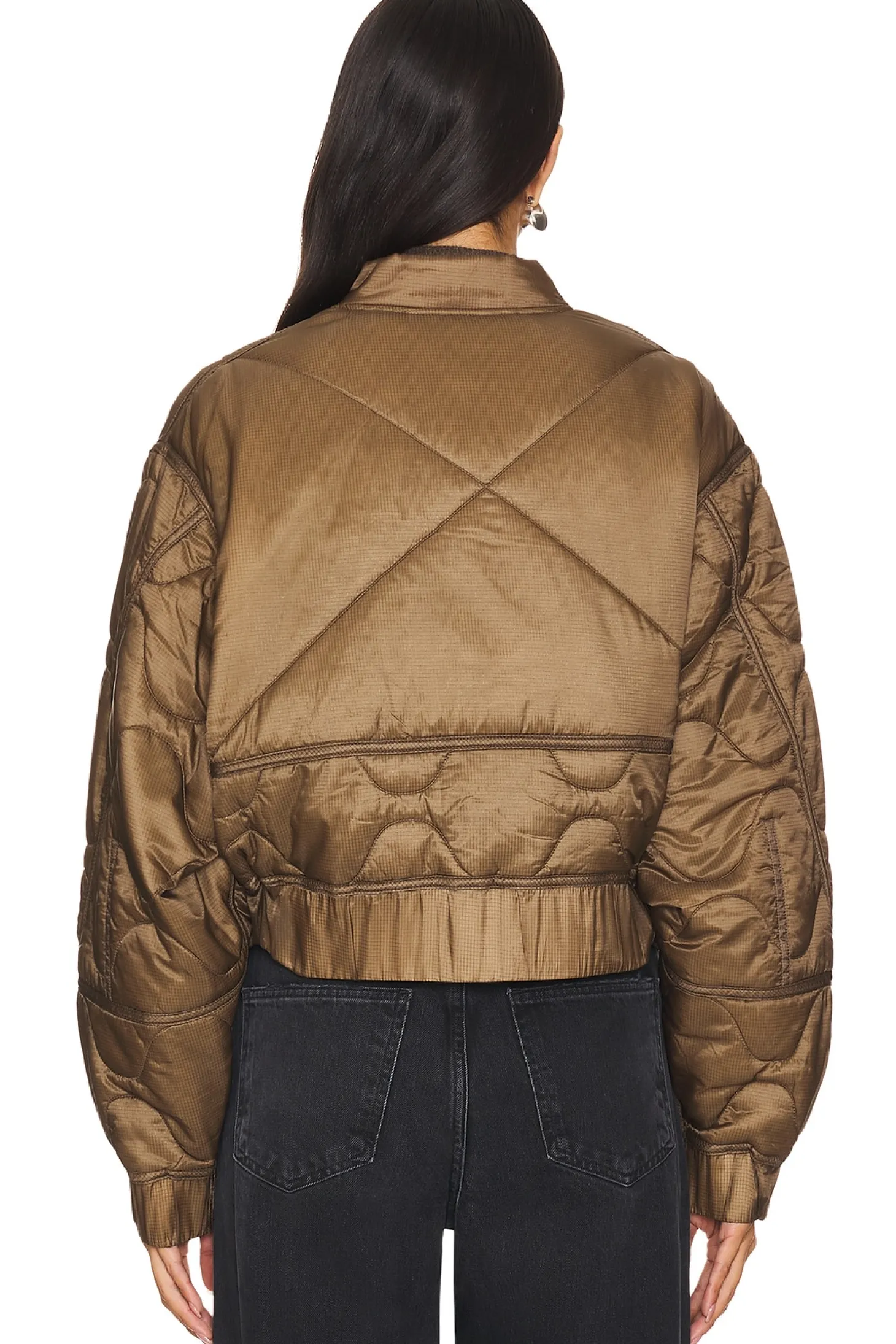 100% polyamide.Made in Vietnam.Dry clean only.Two-way front zipper closure with pull tab Elastic hem.Front welt pockets.Dolman sleeve with tonal panel at underarm Elastic cuff.Attached backpack straps at lining.Quilted design