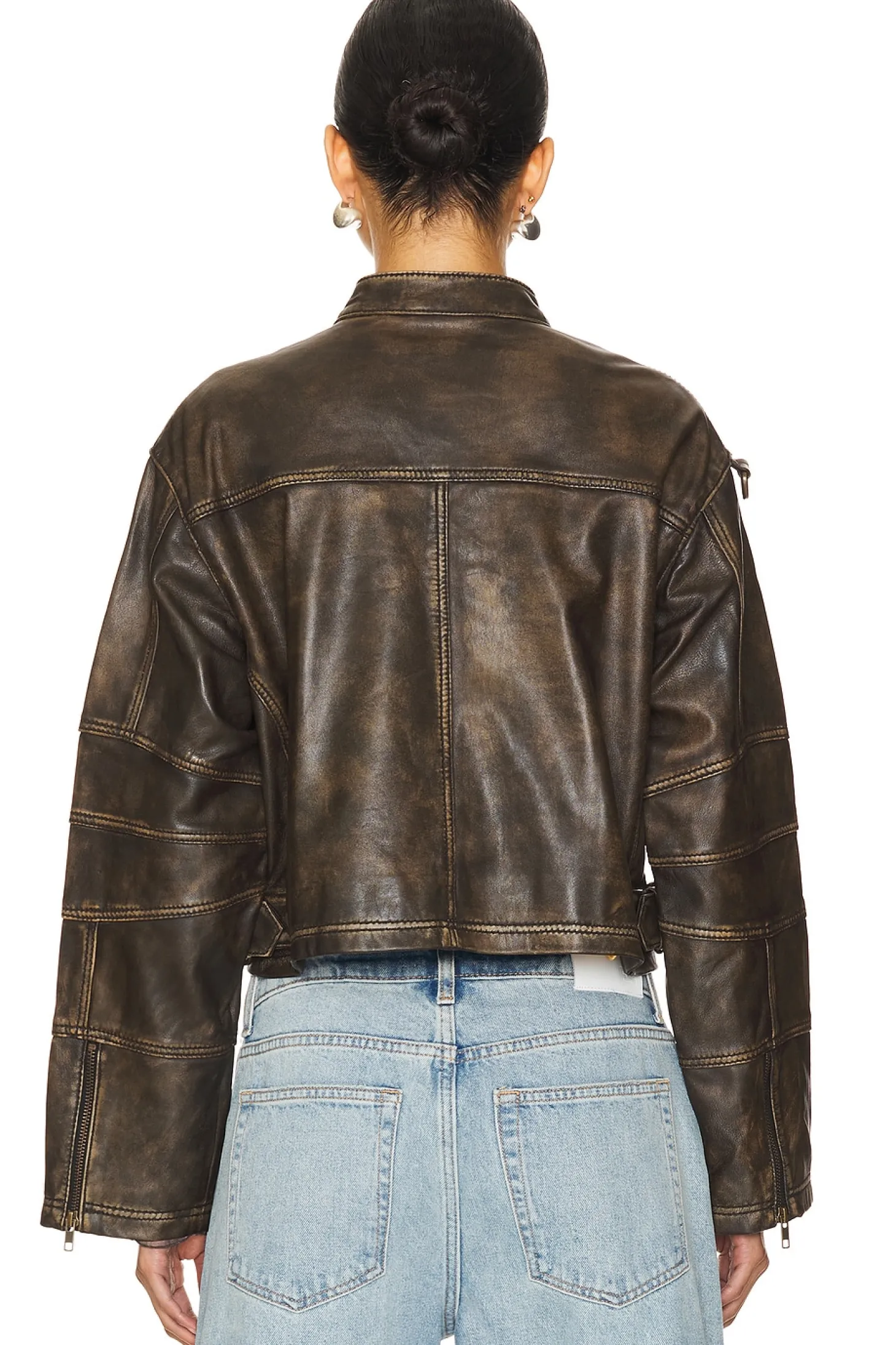Self: 100% sheep leather Lining 1: 100% polyester Lining 2: 100% cotton.Made in India.Professional leather clean only.Hidden front zip closure.Front cargo pockets and breast pocket with zip closure.Zip cuffs.Side buckle accents.Genuine leather