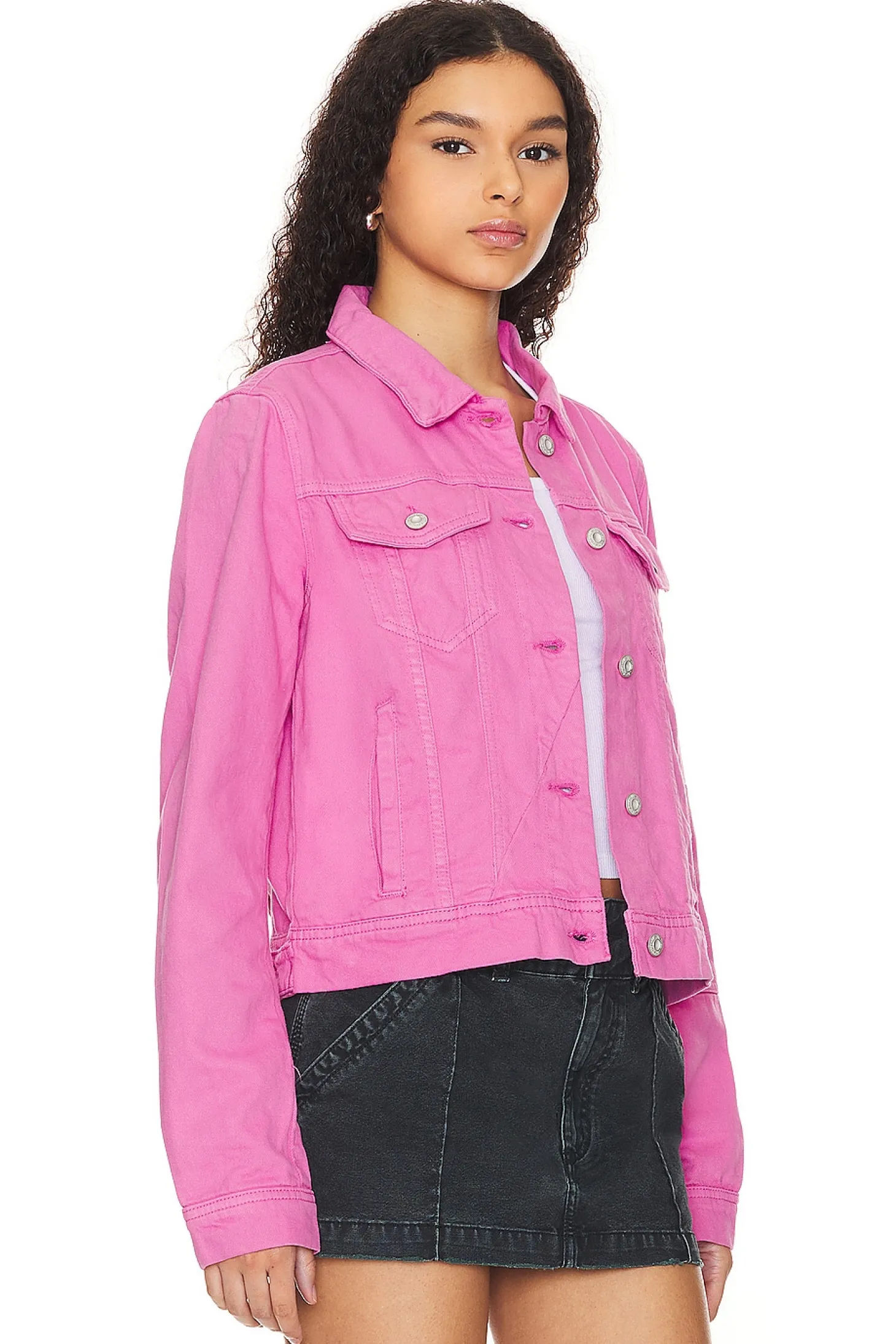 Introducing the Free People Rumors Denim Jacket in the delightful Sugar Magnolia shade. This springtime essential adds a pop of color to your wardrobe, making every outfit blossom with vibrancy..100% cotton.Made in Morocco.Machine wash.Front button closure with button cuffs.Breast button pockets.Side seam pockets.Rigid denim fabric