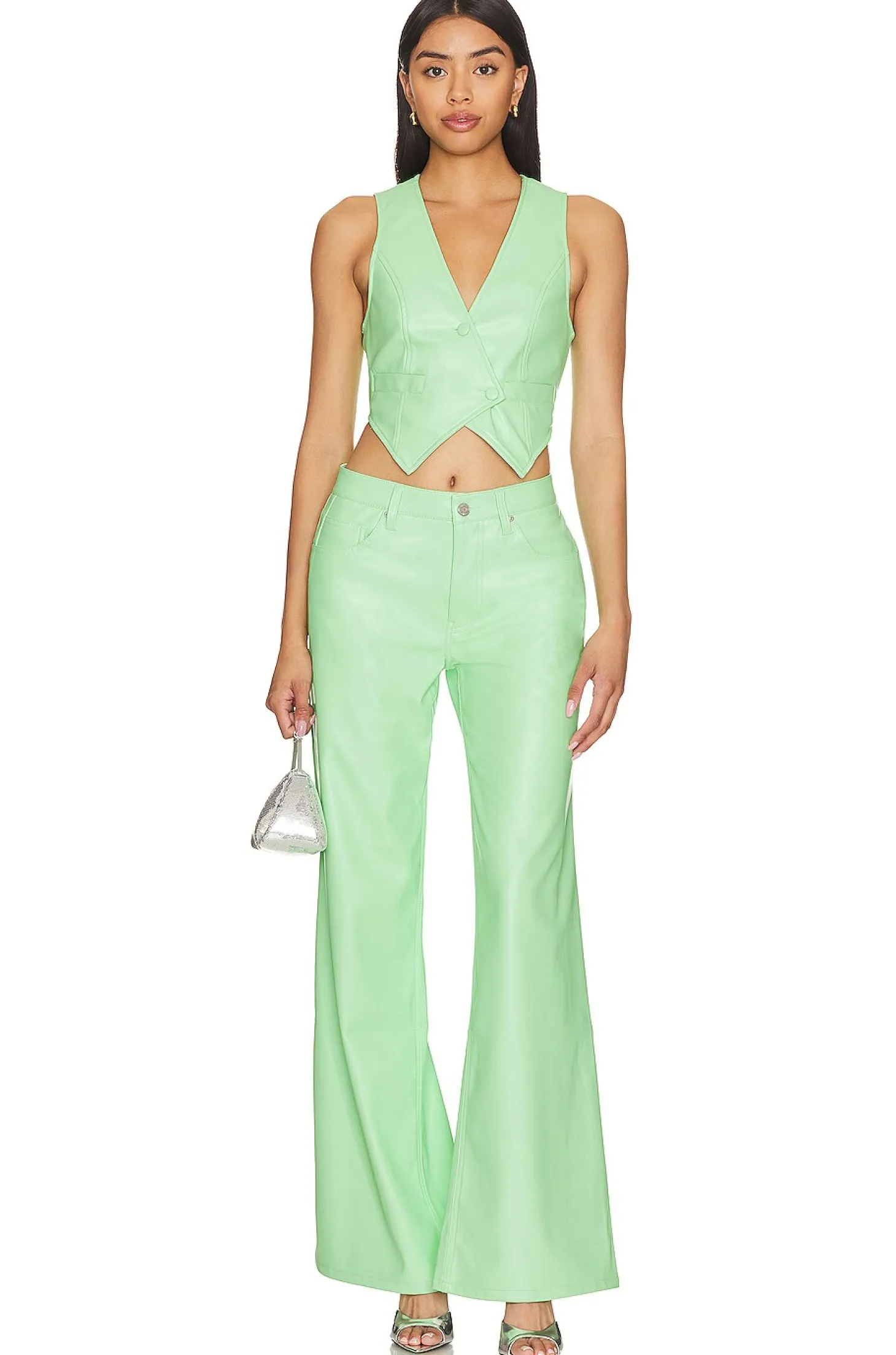 Self: 100% polyurethane Base:100% polyester.Made in China.Machine wash.Zip fly with button closure.5-pocket styling.Faux leather fabric.Item not sold as a set.20" at the knee breaks to 23" at the leg opening