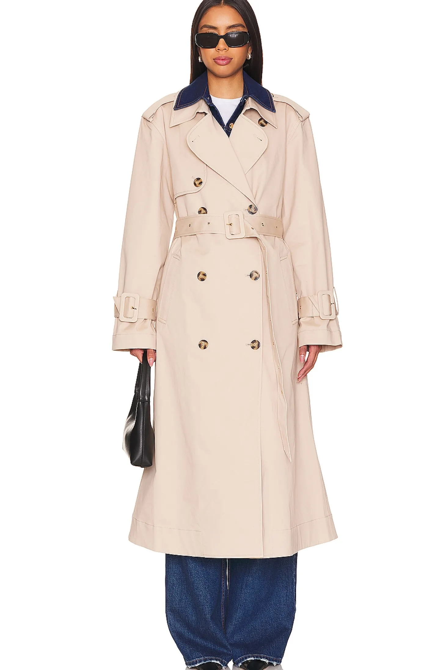 Self 98% cotton 2% spandex Contrast Fabric: 100% cotton.Made in China.Machine wash.Dual-breast front button closure.Side seam pockets.Strap buckle cuffs.Gabardine fabric with detachable gabardine belt and detachable denim lining