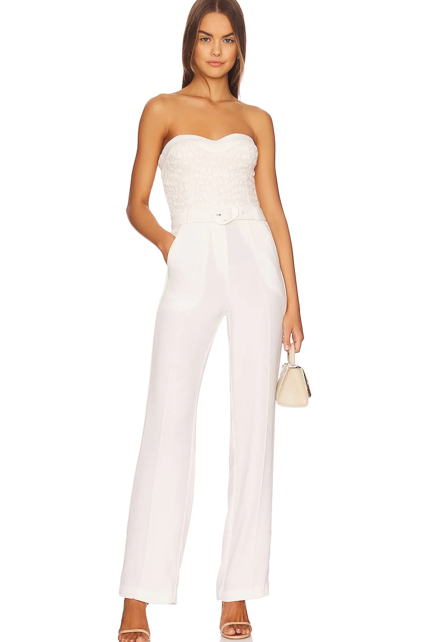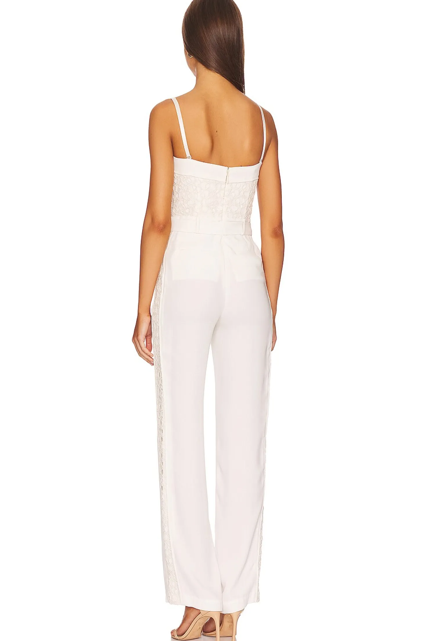 Self: 75% cotton 25% polyamide Contrast Fabric: 71% acetate 29% polyester Lining: 100% polyester.Made in China.Dry clean only.Hidden back zipper closure Detachable belt.Detachable and adjustable shoulder straps.Boned bodice with crochet knit overlay.Front and back pockets Lightweight crepe fabric with pintuck and crochet knit trim.Neckline to hem measures approx 53" in length 18" at the knee and 18" at the leg opening