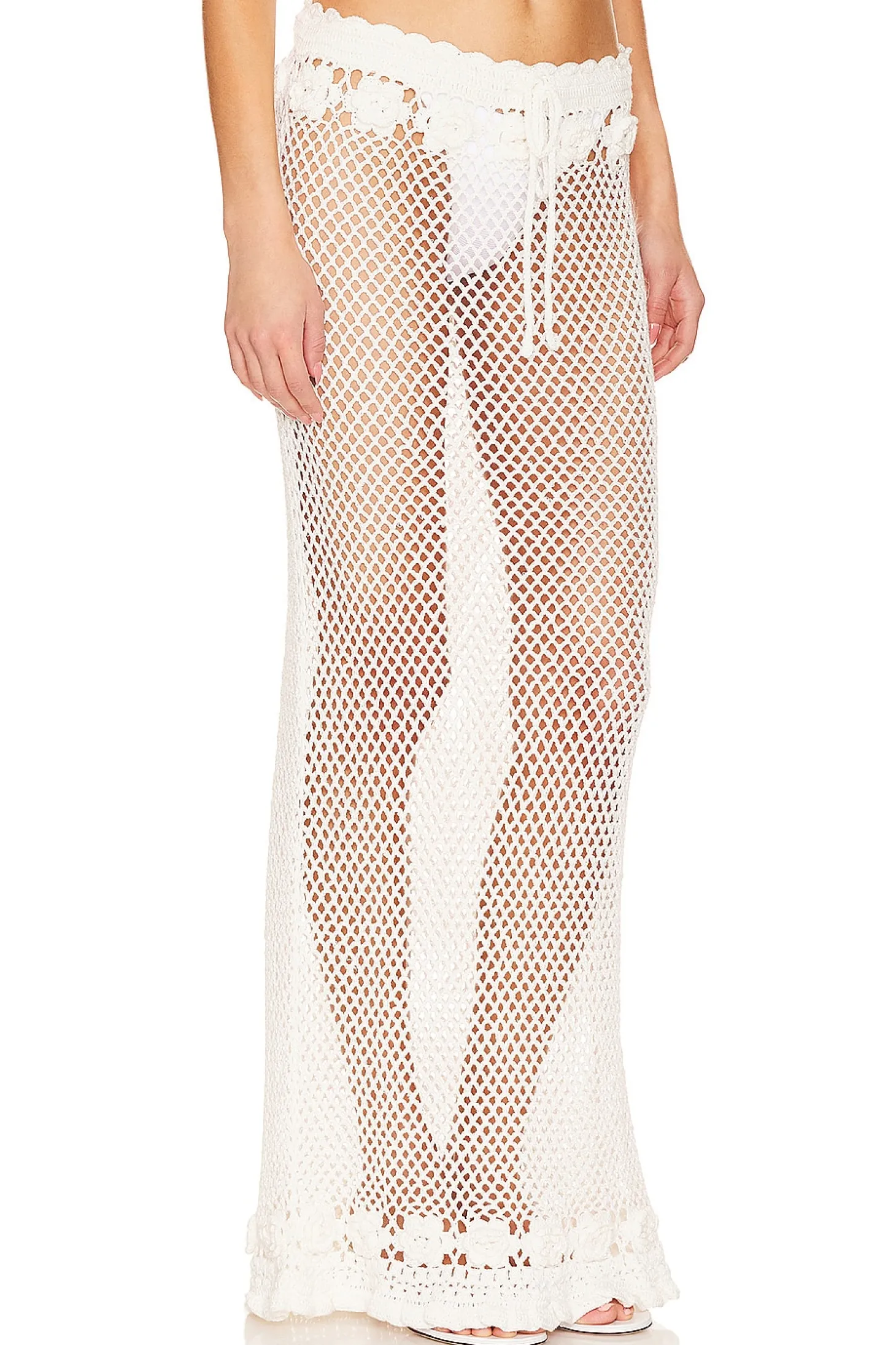 50% cotton 50% rayon.Made in China.Dry clean.Unlined.Pull-on styling with elastic waistband and front drawstring tie closure.Tonal crochet knit rosettes at waist and hem.Open knit fabric Garment is intentionally sheer, undergarments will show through. Please note undergarment not included.Skirt measures approx 43" in length Size XS measures approx 27.5" in waist circumference