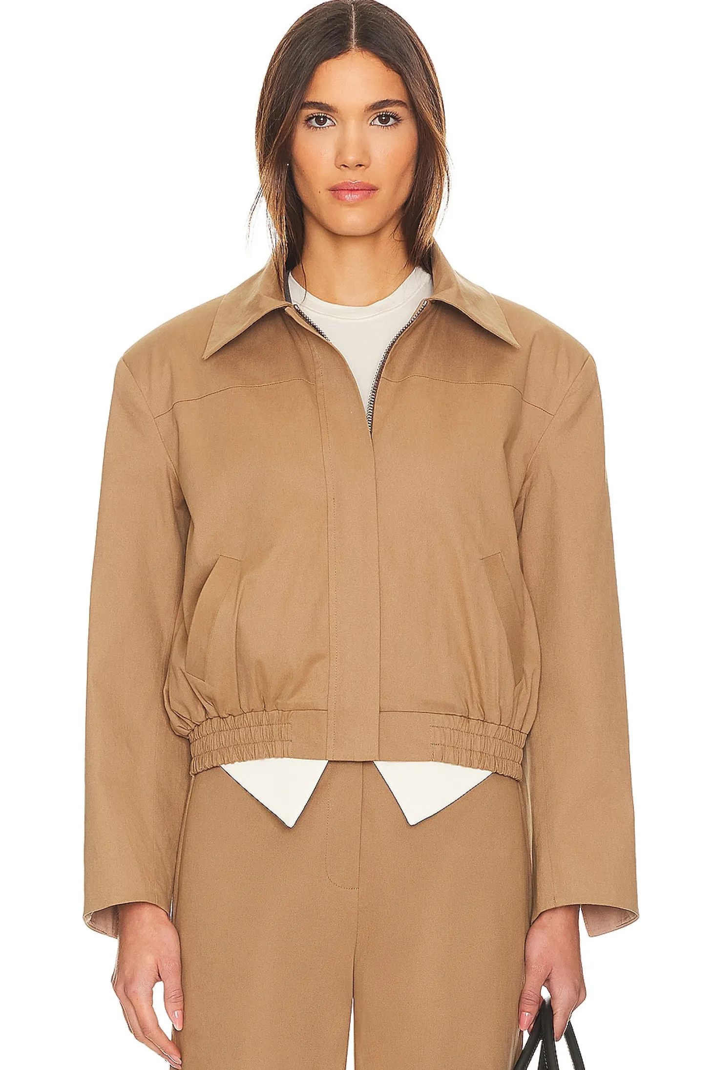 97% cotton 3% elastane.Made in Turkey.Machine wash.Front zipper closure.Padded shoulders.Side slant pockets.Canvas fabric with smocked elastic hem.Item not sold as set