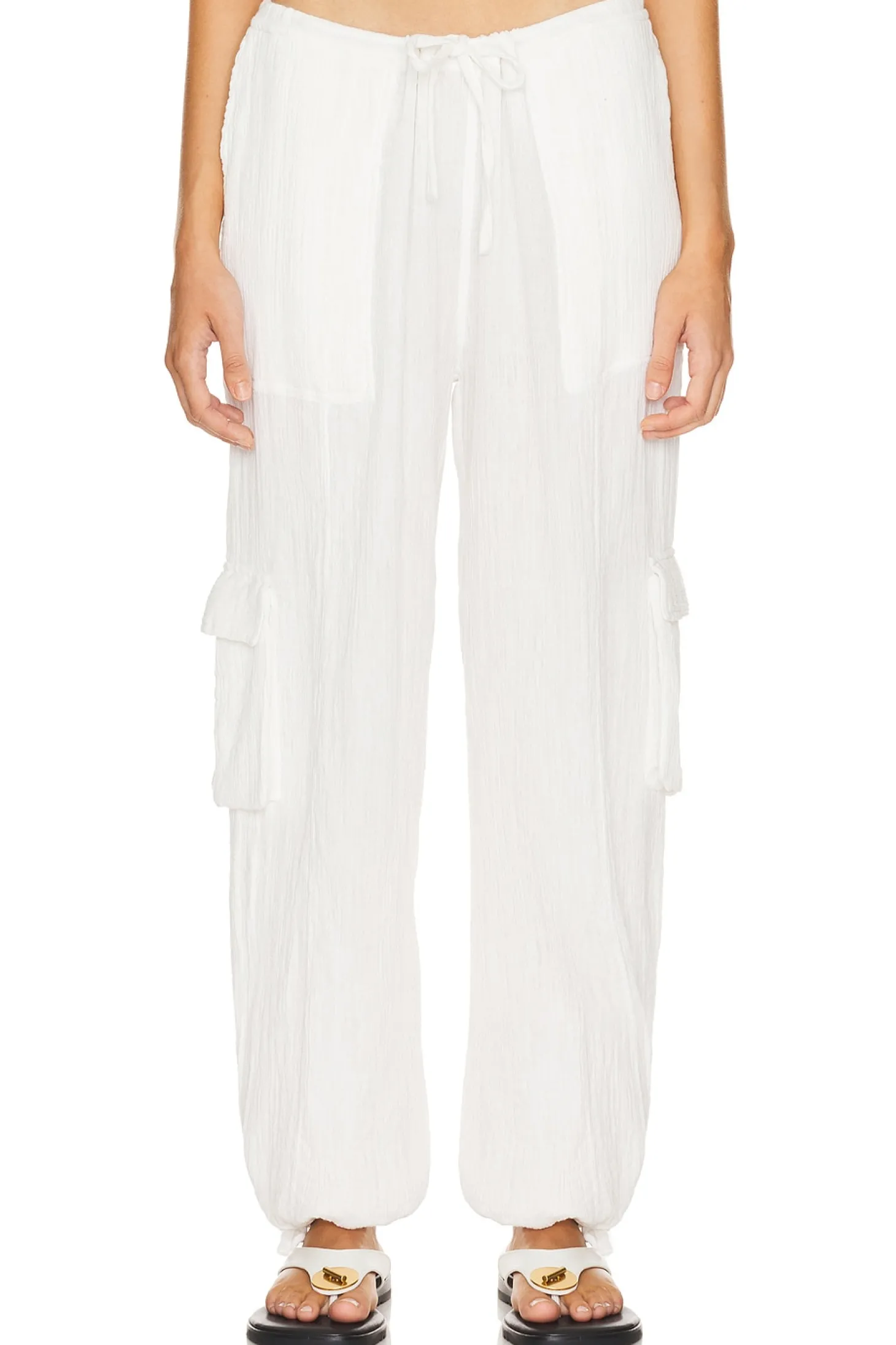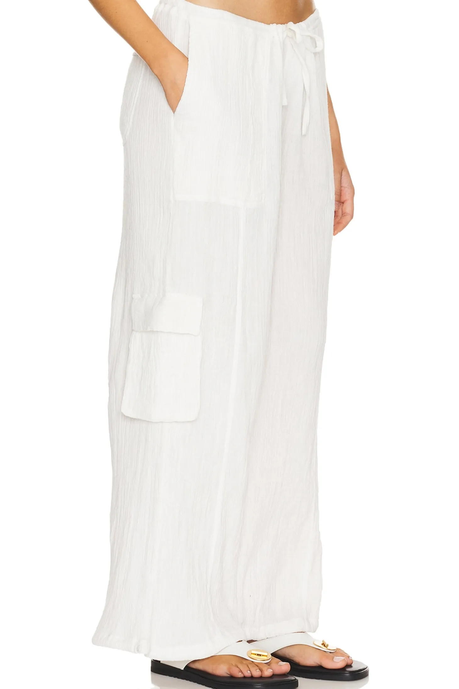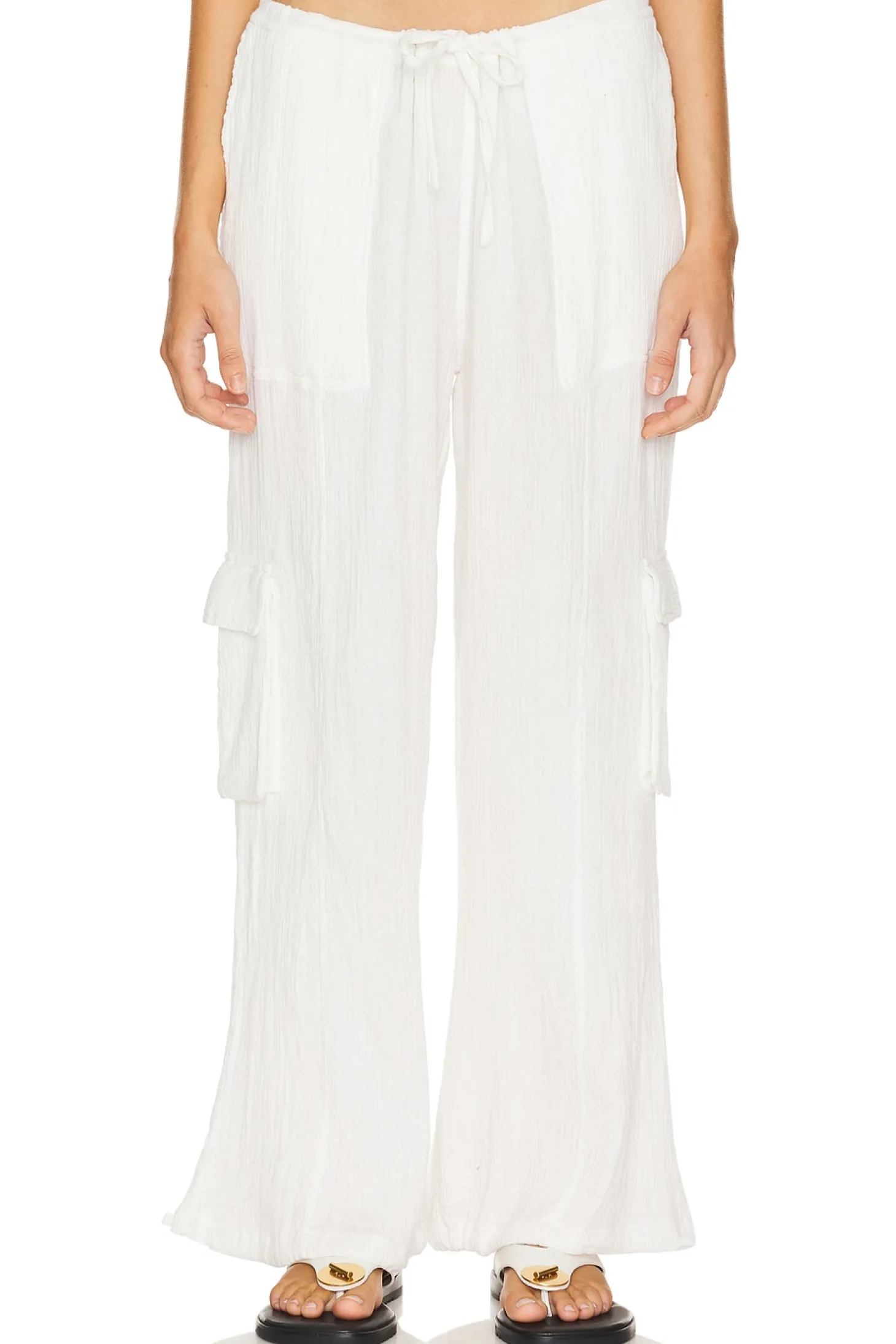 100% cotton.Made in India.Dry clean only.Elastic waistband and drawstring.4-pocket design and side cargo pockets.Slinky linen fabric with drawstring hem.26" at the knee and 26" at the leg opening