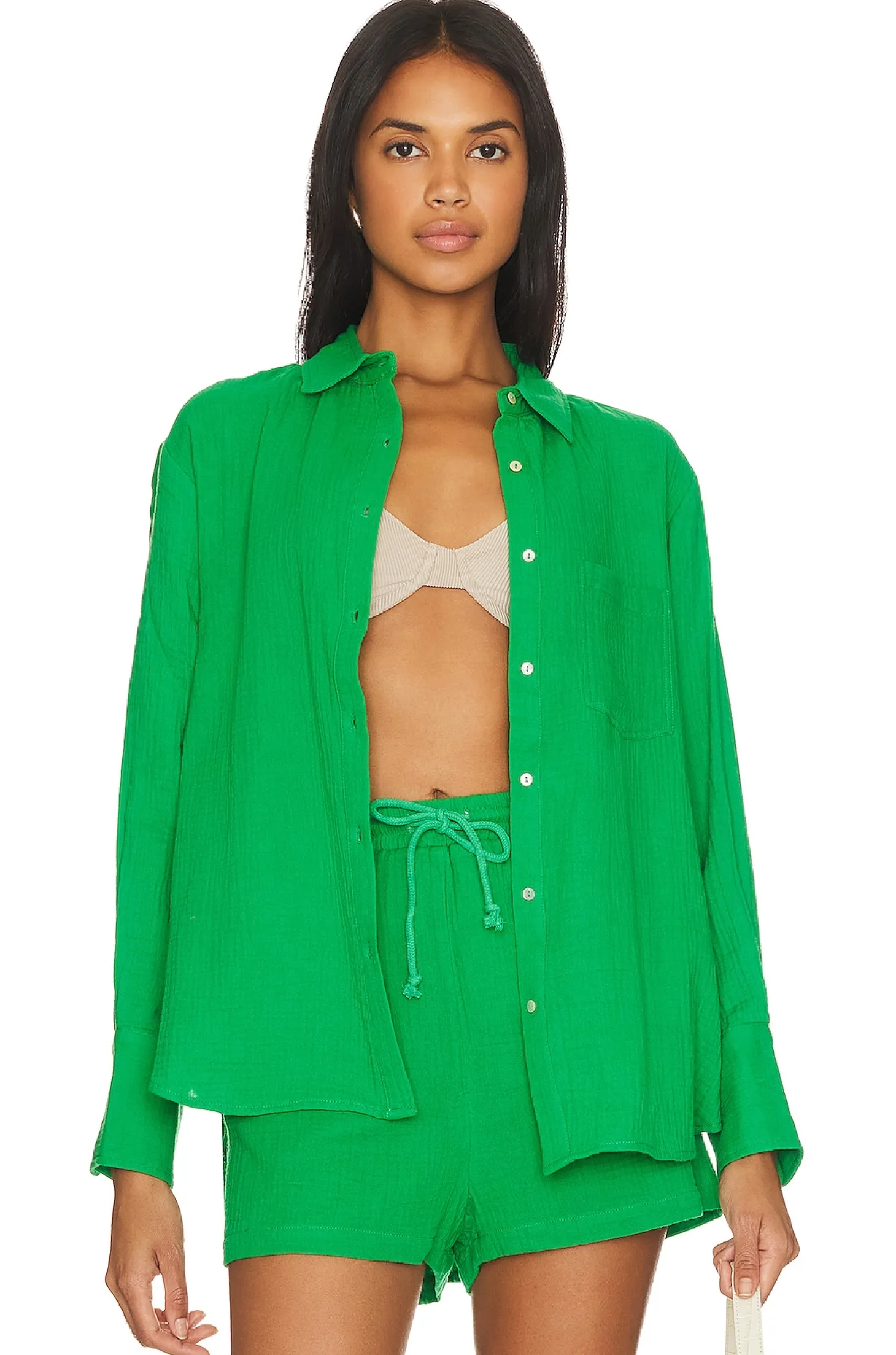 100% cotton.Made in China.Dry clean only.Front button closure.Breast slip pocket.Buttoned cuffs.Lightweight gauze fabric.Item not sold as a set