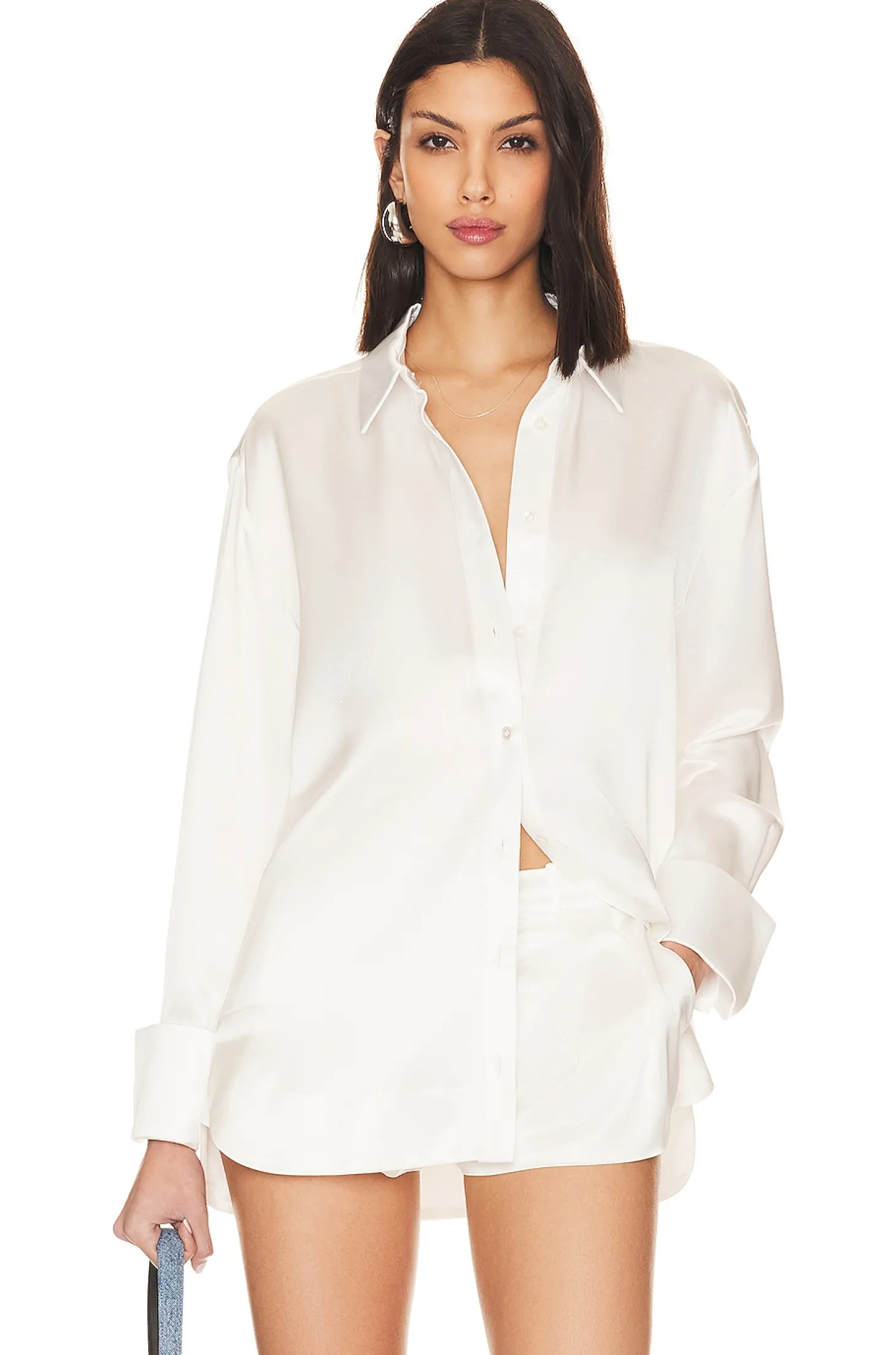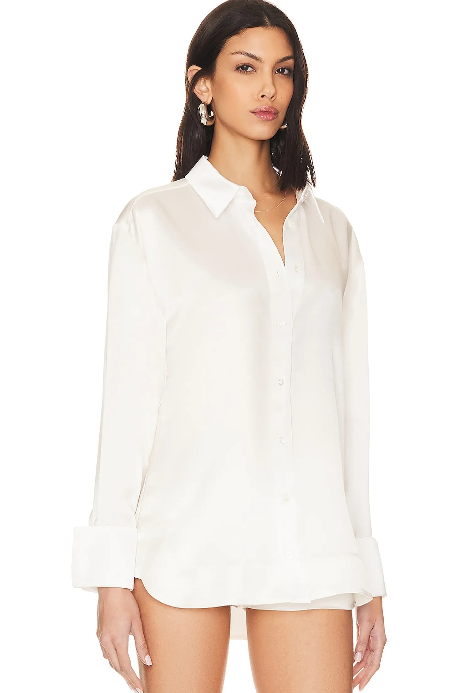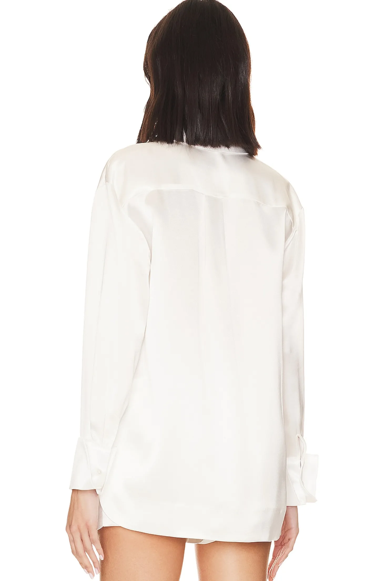 76% acetate 24% polyester.Made in China.Dry clean only.Front button closure.Button cuffs.Lightweight satin fabric.Item not sold as set.The SER.O.YA Zucker Shirt in White is a classic button-down with an easy, loose fit. Style it open or buttoned up.