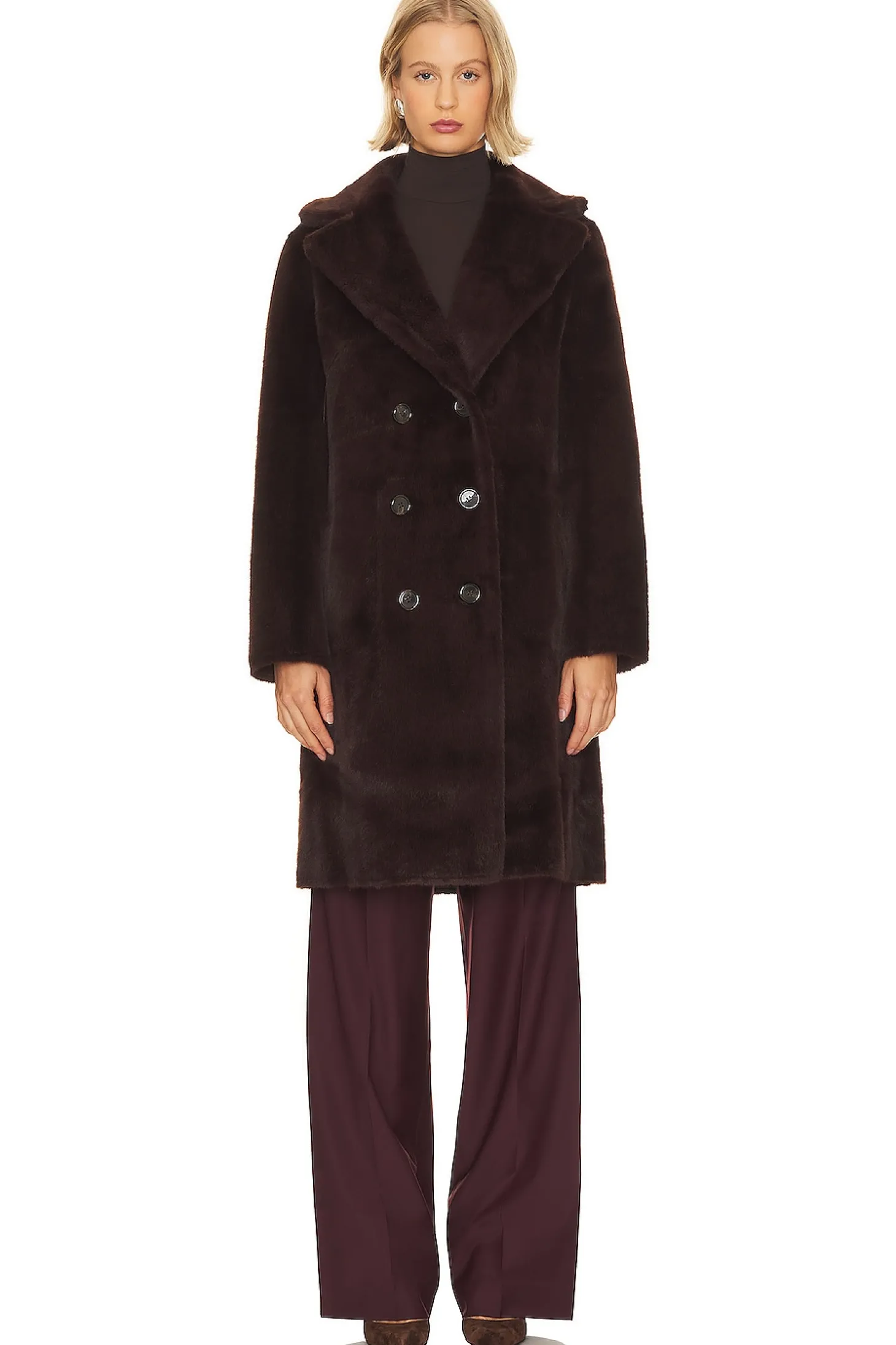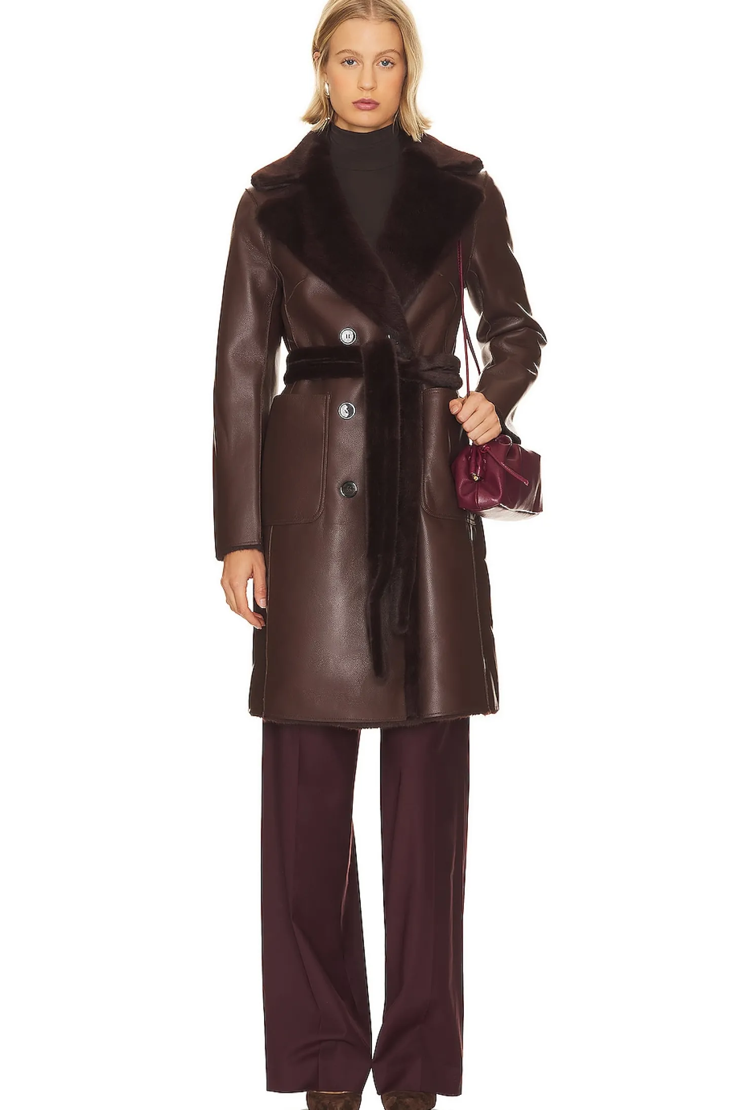 Self 1: 100% polyester Self 2: 100% polyurethane.Made in China.Dry clean only.Double breasted front button closure.Front patch pockets.Removable waist tie.Optional styling.Faux leather and faux fur fabric.The Abigail Faux Shearling Reversible Coat is a versatile piece that offers two stylish looks in one.