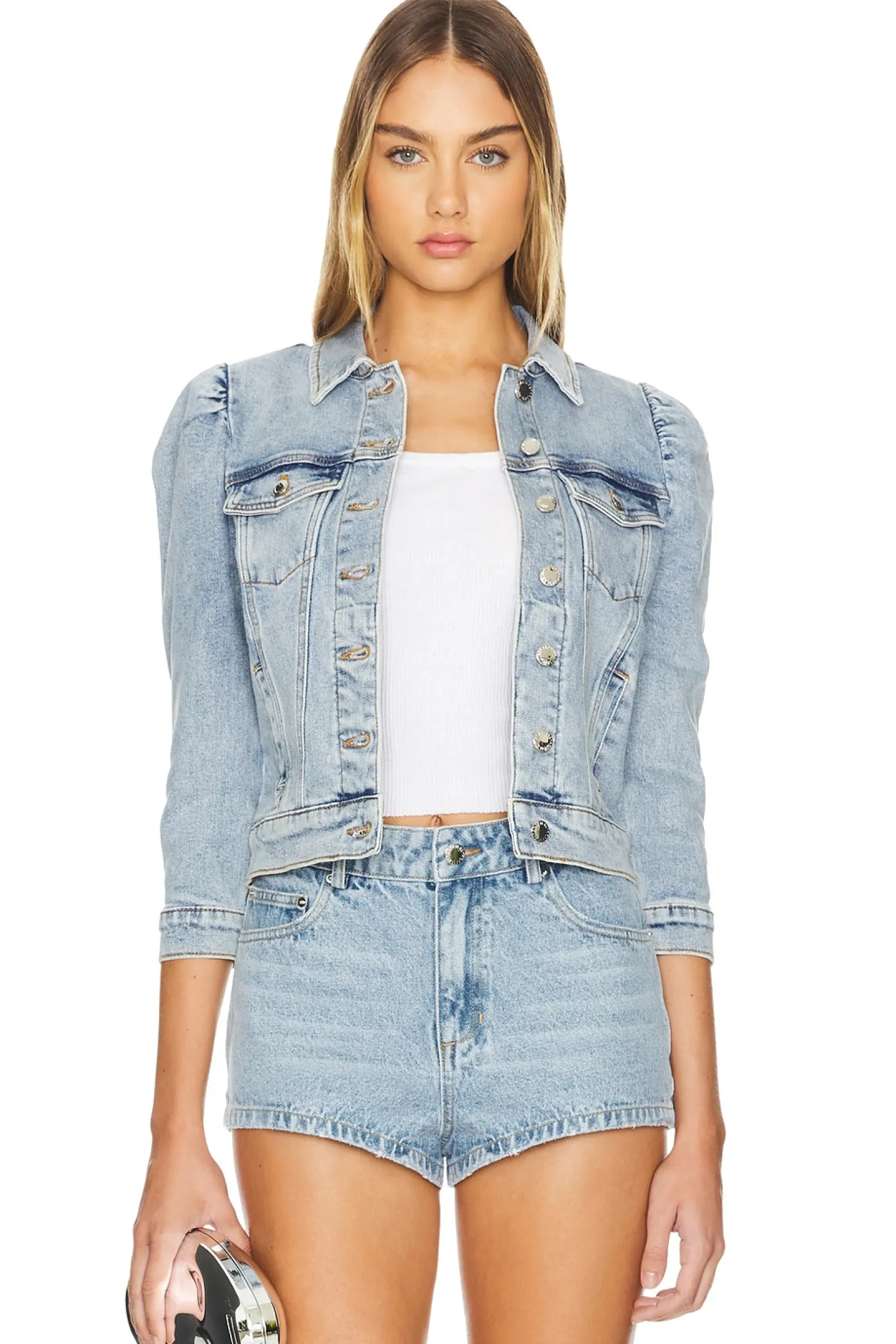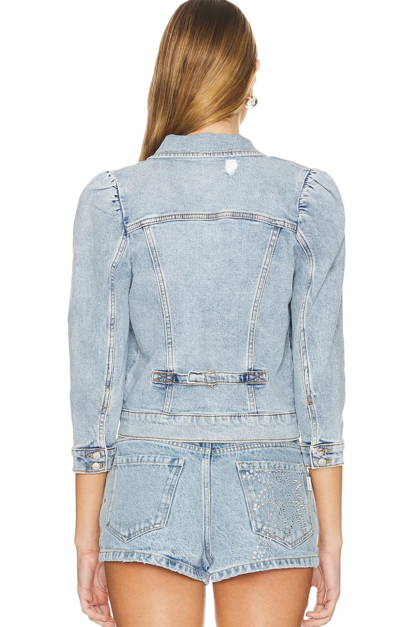 99% cotton 1% elastane.Made in China.Machine wash.Front button closure.Side pockets and breast pockets.Buttoned cuffs and puffed shoulders.Rigid denim with back buckle strap accent