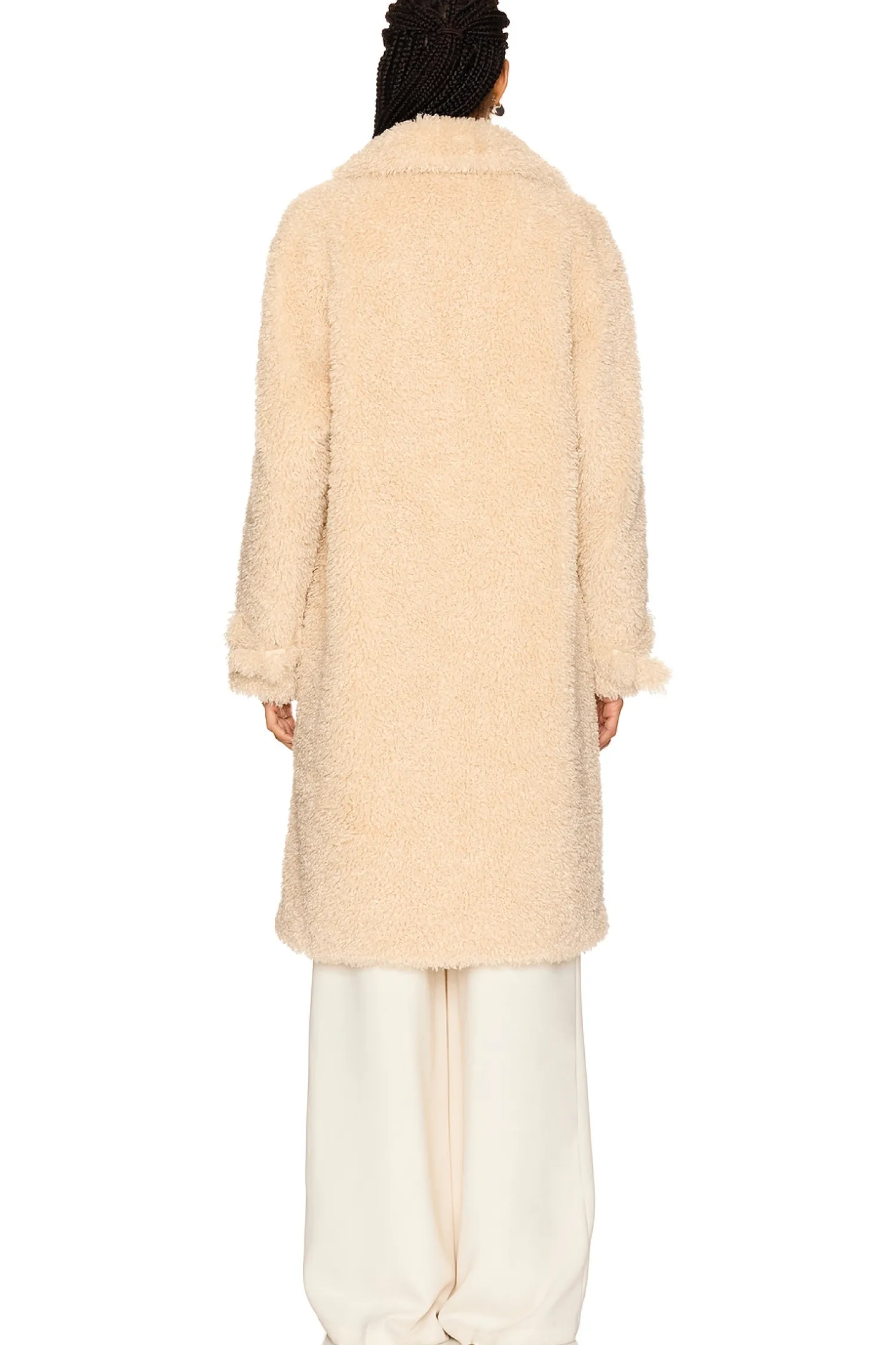 Self & Lining: 100% polyester.Made in China.Dry clean only.Front button closure.Side seam pockets and adjustable buckle cuffs.Heavyweight faux fur fabric with notched lapel collar