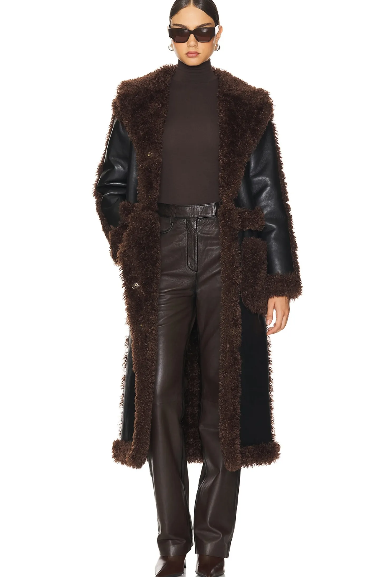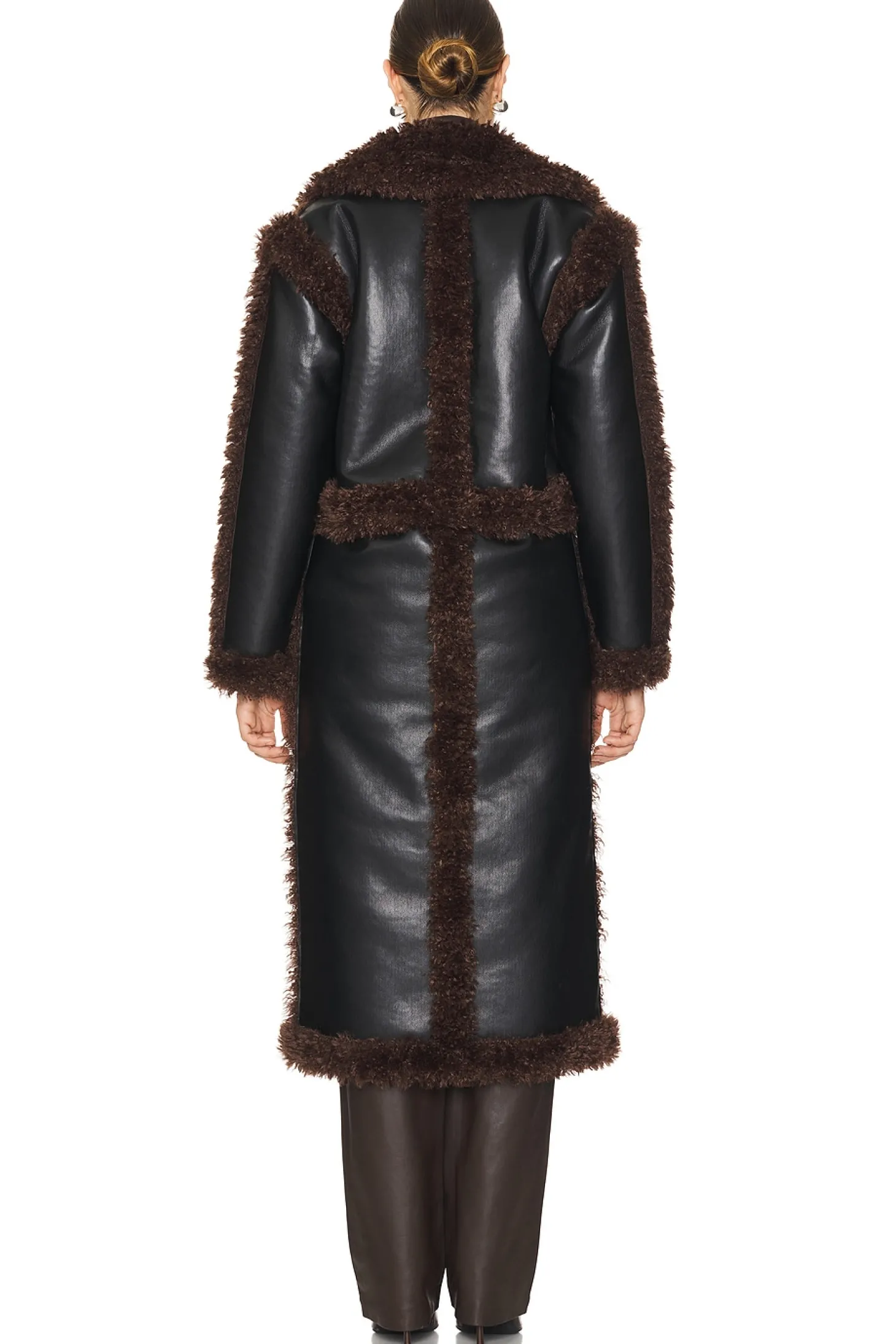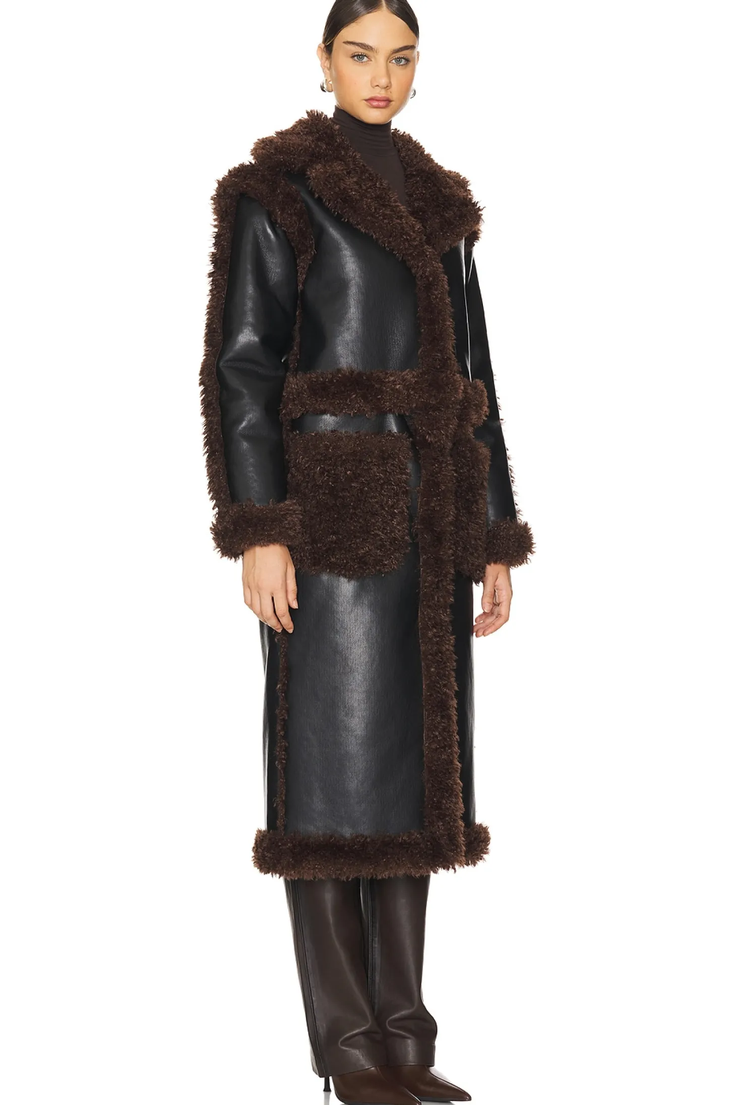 Self 1: 100% polyurethane Self 2 & Faux Fur: 100% polyester.Made in China.Dry clean only.Front button snap closure.Detachable at waist.Faux leather with faux fabric trim detail