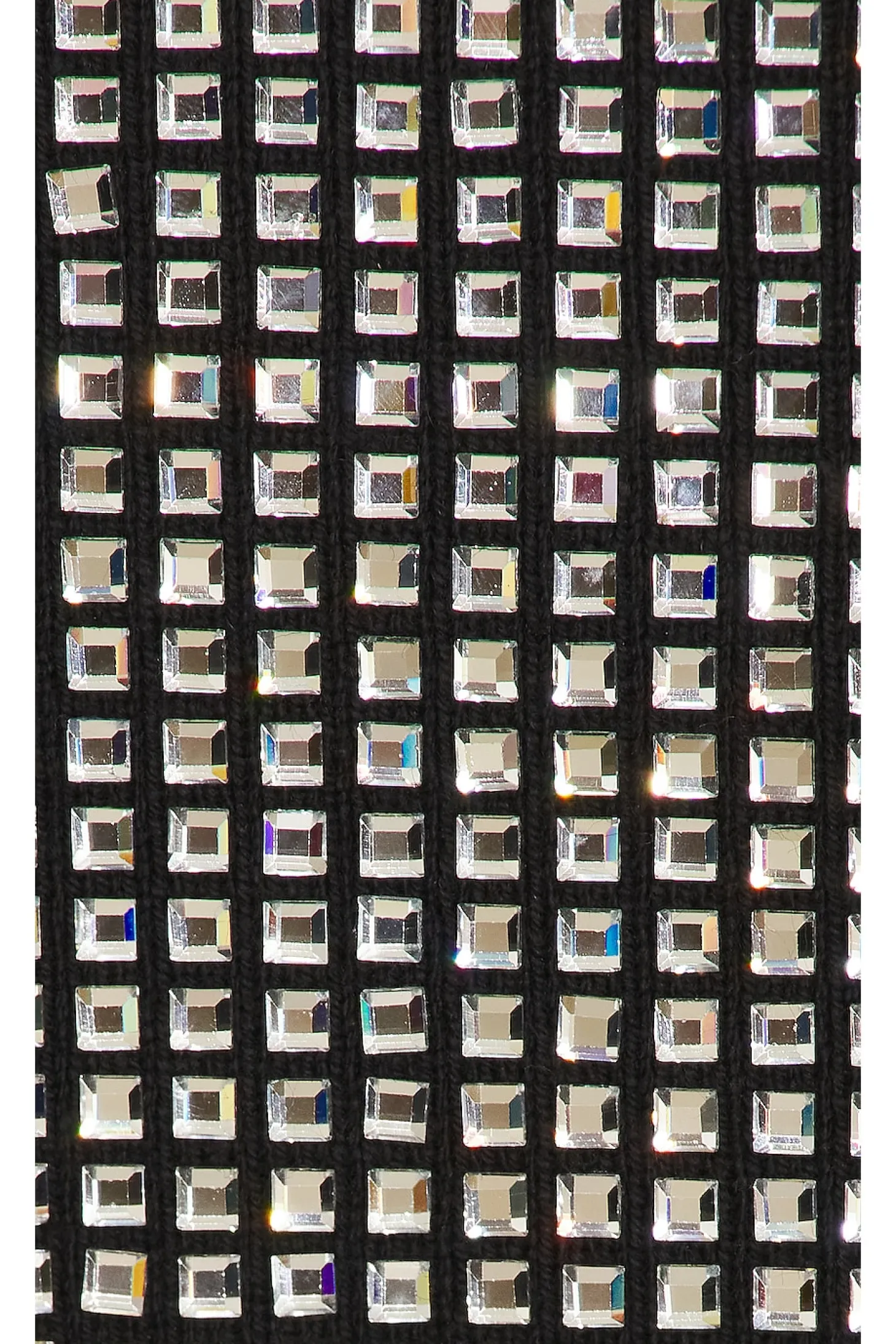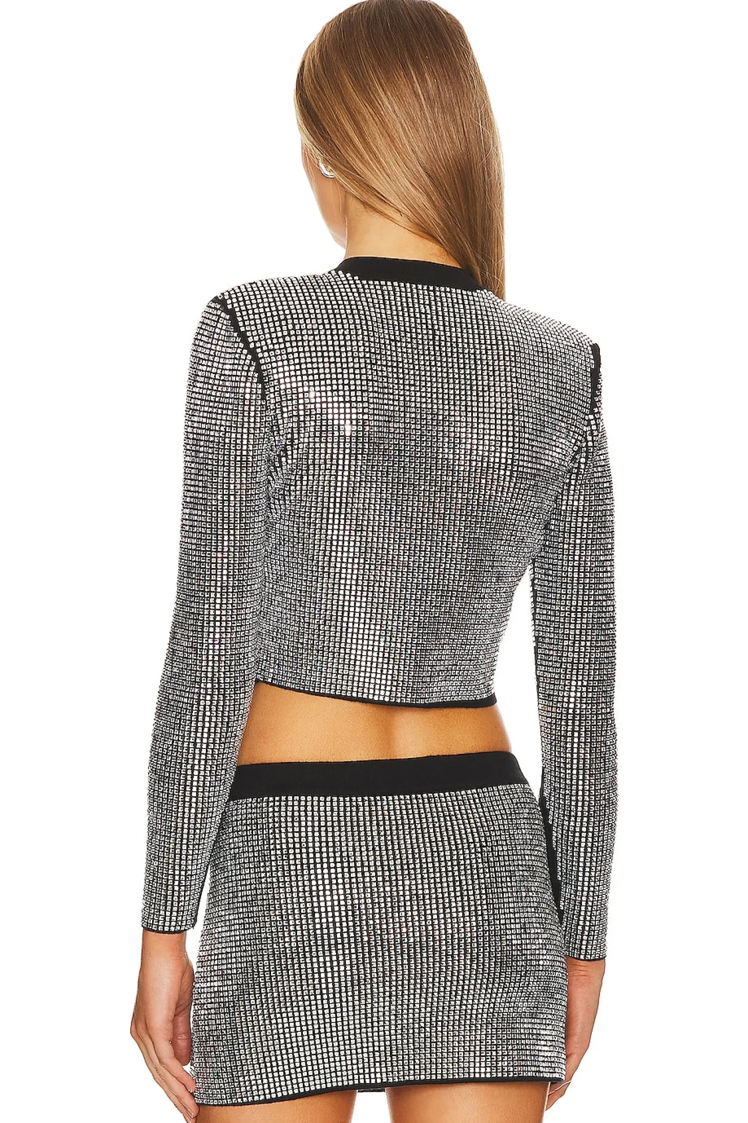92% cotton 8% cashmere.Made in China.Hand wash.Front zipper closure with snap buttons.Padded shoulders.Zippered cuffs.Allover crystal embellishments.Item not sold as a set