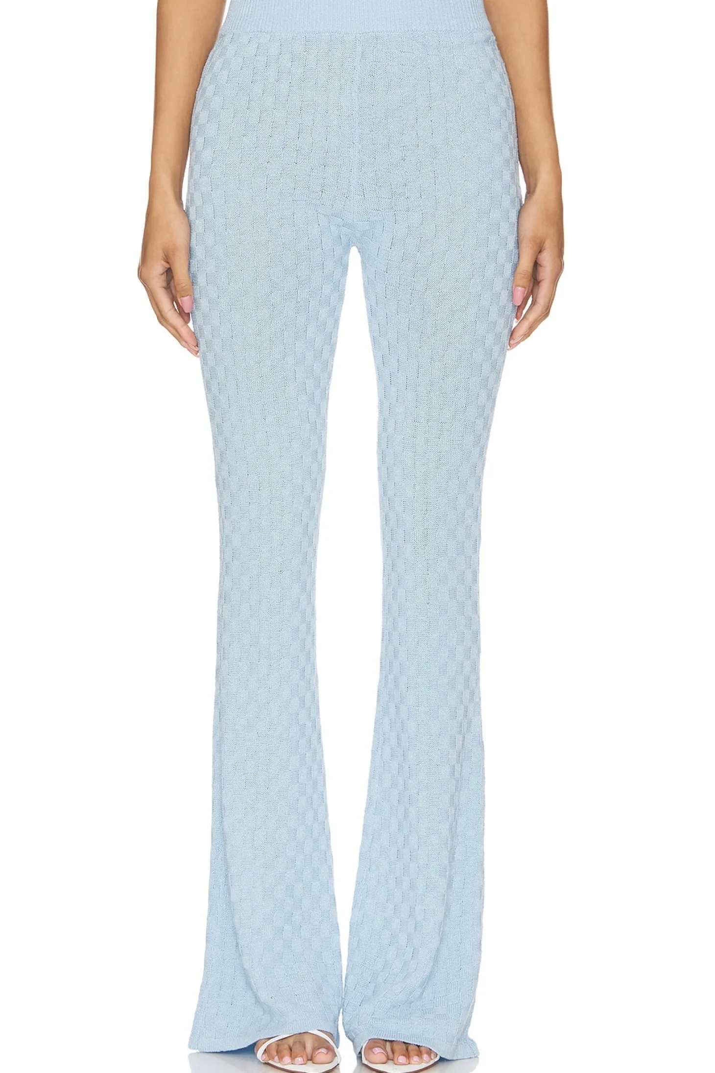 47% viscose 38% cotton 15% linen.Made in China.Dry clean only.Pull-on styling with elastic waistband.Lightweight knit fabric.Item not sold as a set.18" at the knee breaks to 20" at the leg opening