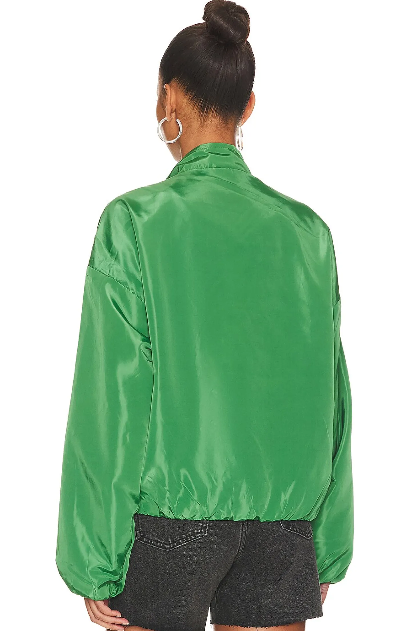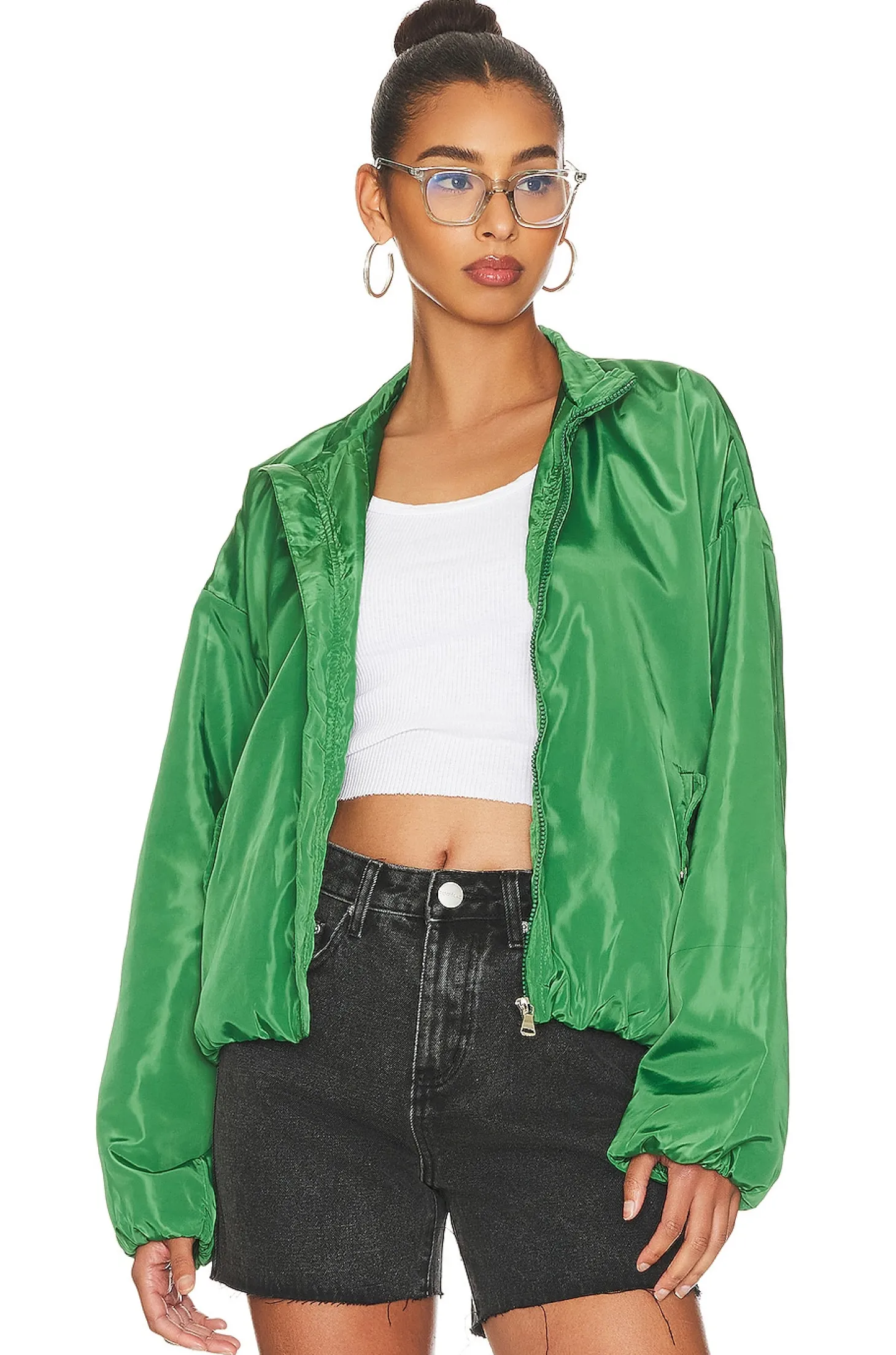 100% polyester.Made in China.Hand wash.Front zipper closure.Side flap pockets with button closure.Elastic waistband and cuffs.Metallic finish