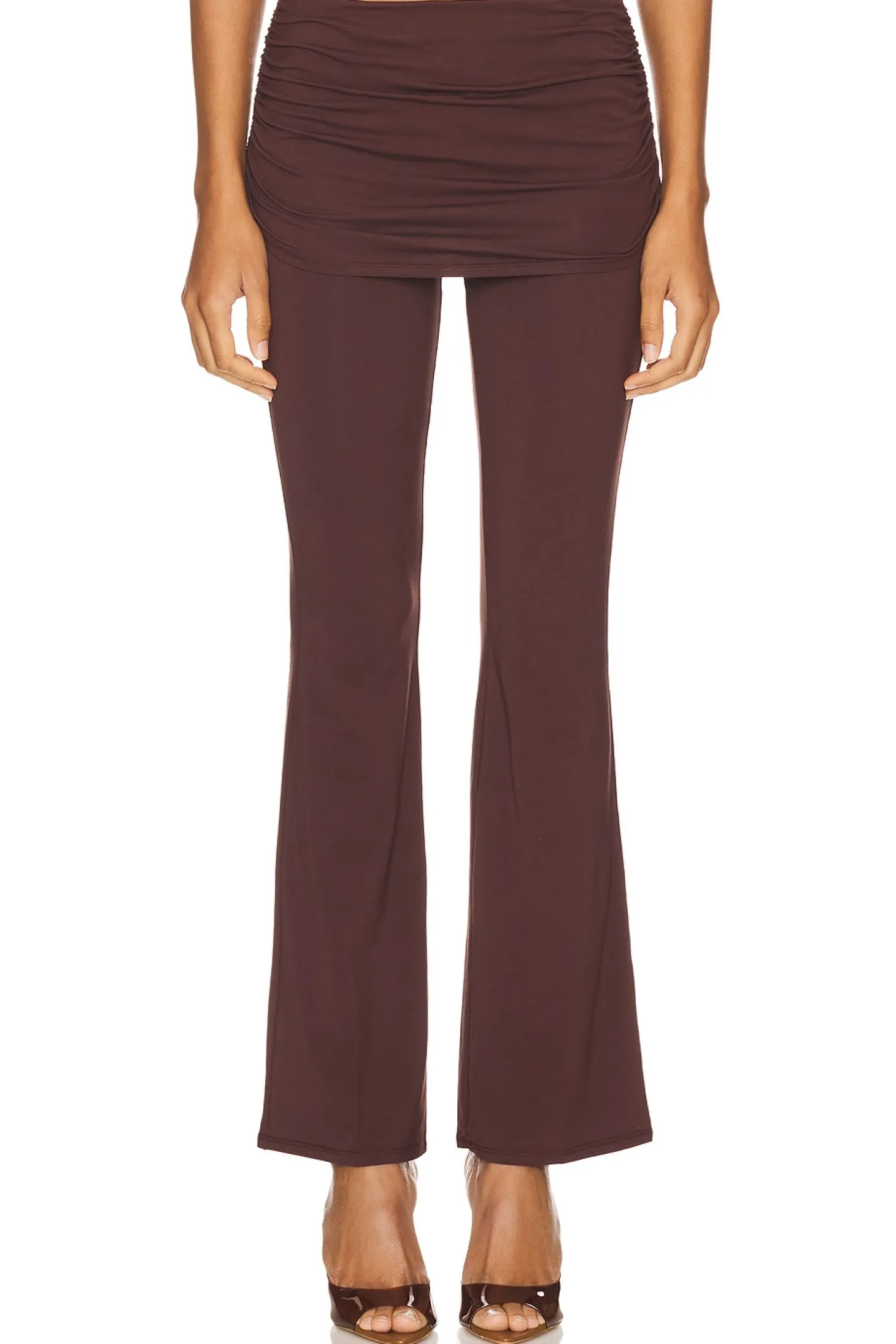 46% modal 46% cotton 8% spandex.Made in China.Machine wash.Pull-on styling with elastic waistband.Jersey fabric with ruched overlay at wait.14" at the knee breaks to 18" at the leg opening