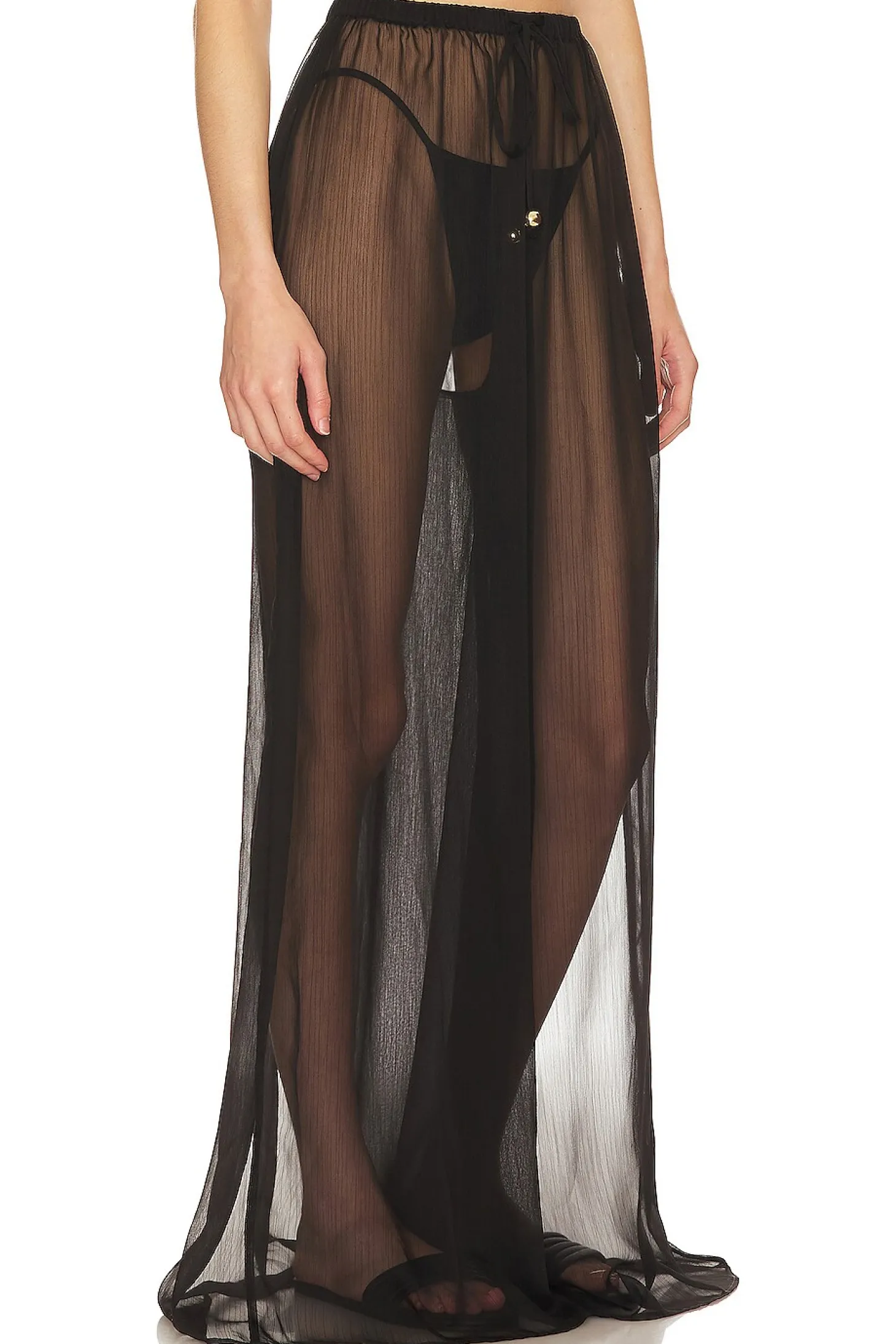 100% polyester.Made in China.Hand wash.Pull-on styling with elastic waistband and front drawstring tie closure with beaded ends.Chiffon fabric.Item not sold as a set.Garment is intentionally sheer, undergarments will show through. Please note undergarment not included.24" at the knee breaks to 44" at the leg opening