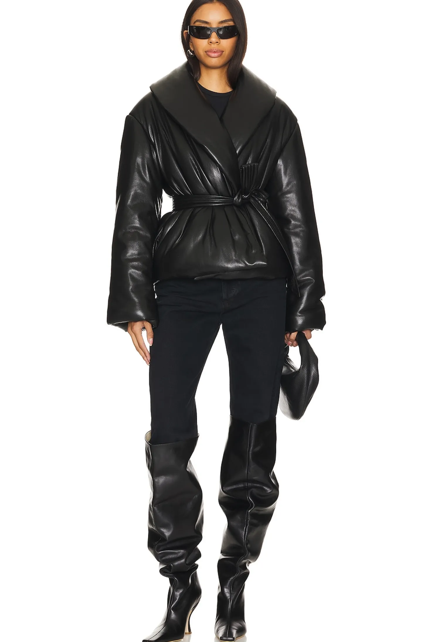 Self 1: 100% polyurethane Self 2: 100% polyester Lining: 100% polyester.Made in China.Hand wash.Detachable waist tie styling