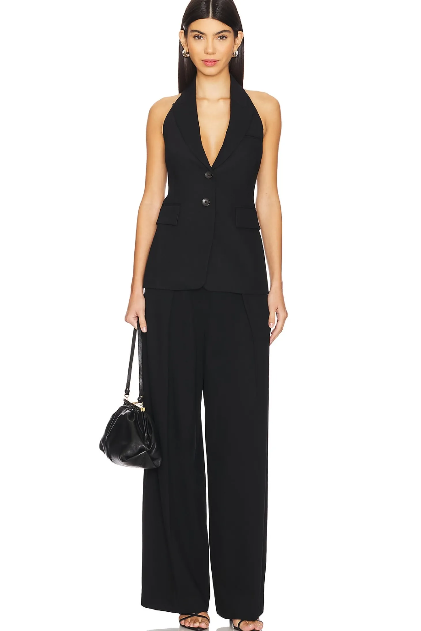 Self: 55% wool 30% viscose 15% polyester Lining: 51% polyester49% cotton.Made in China.Dry clean only.Front button closure.Front flap pockets.Halterneck design.Twill fabric.Item not sold as set