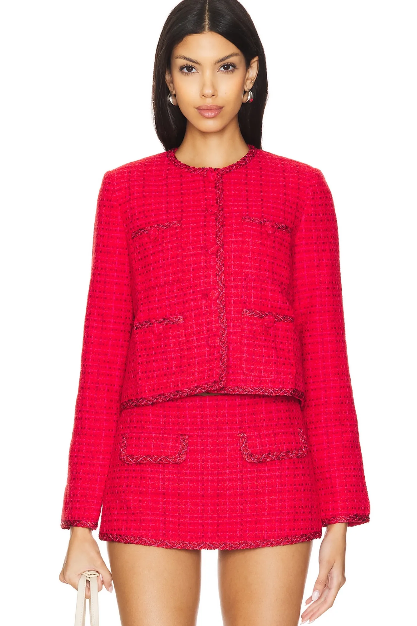 Self: 63% cotton 14% viscose 11% polyester 8% acrylic 4% nylon Lining: 55% polyester 45% viscose.Made in China.Dry clean only.Front button closure.4-pocket design.Padded shoulders.Midweight tweed fabric.Item not sold as a set