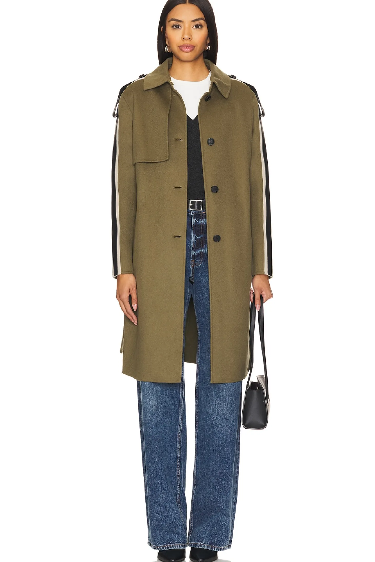 100% wool.Made in China.Dry clean.Front button closure with hook and eye fastening at collar.Angled front welt pockets.Detachable tie belt and back vent