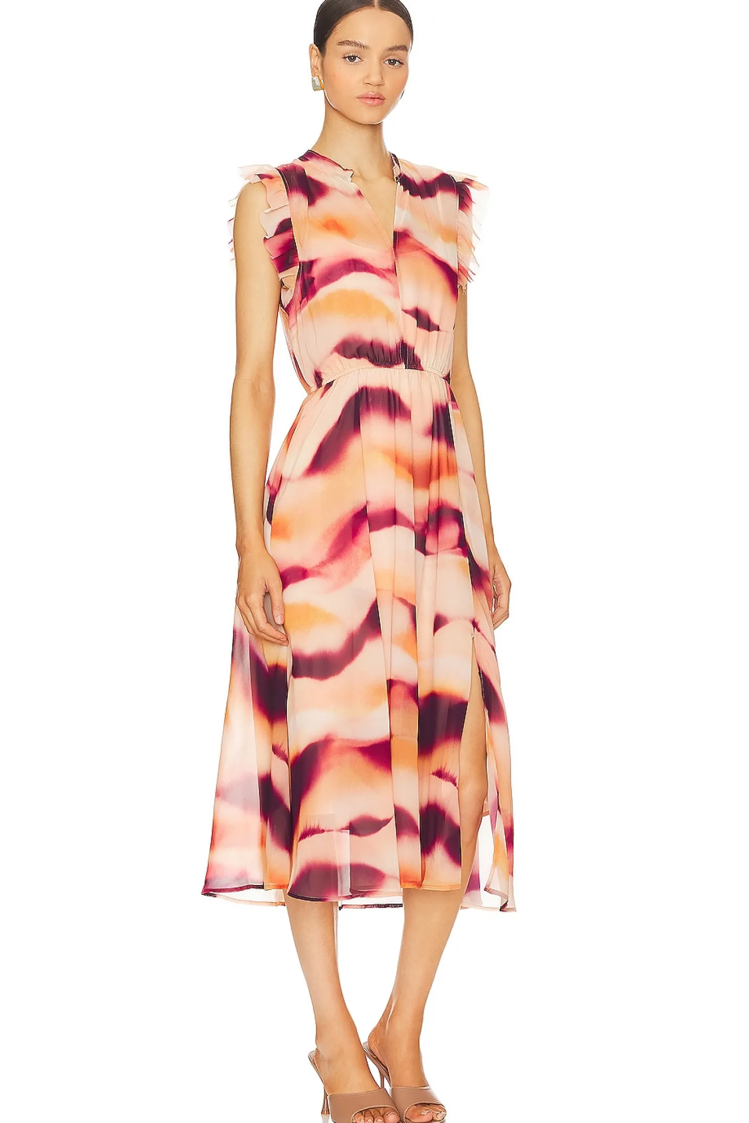 Self & Lining: 100% polyester.Made in China.Hand wash.Partially lined.Pull-on styling with elastic waist.Ruffle sleeves.Chiffon fabric with side slit