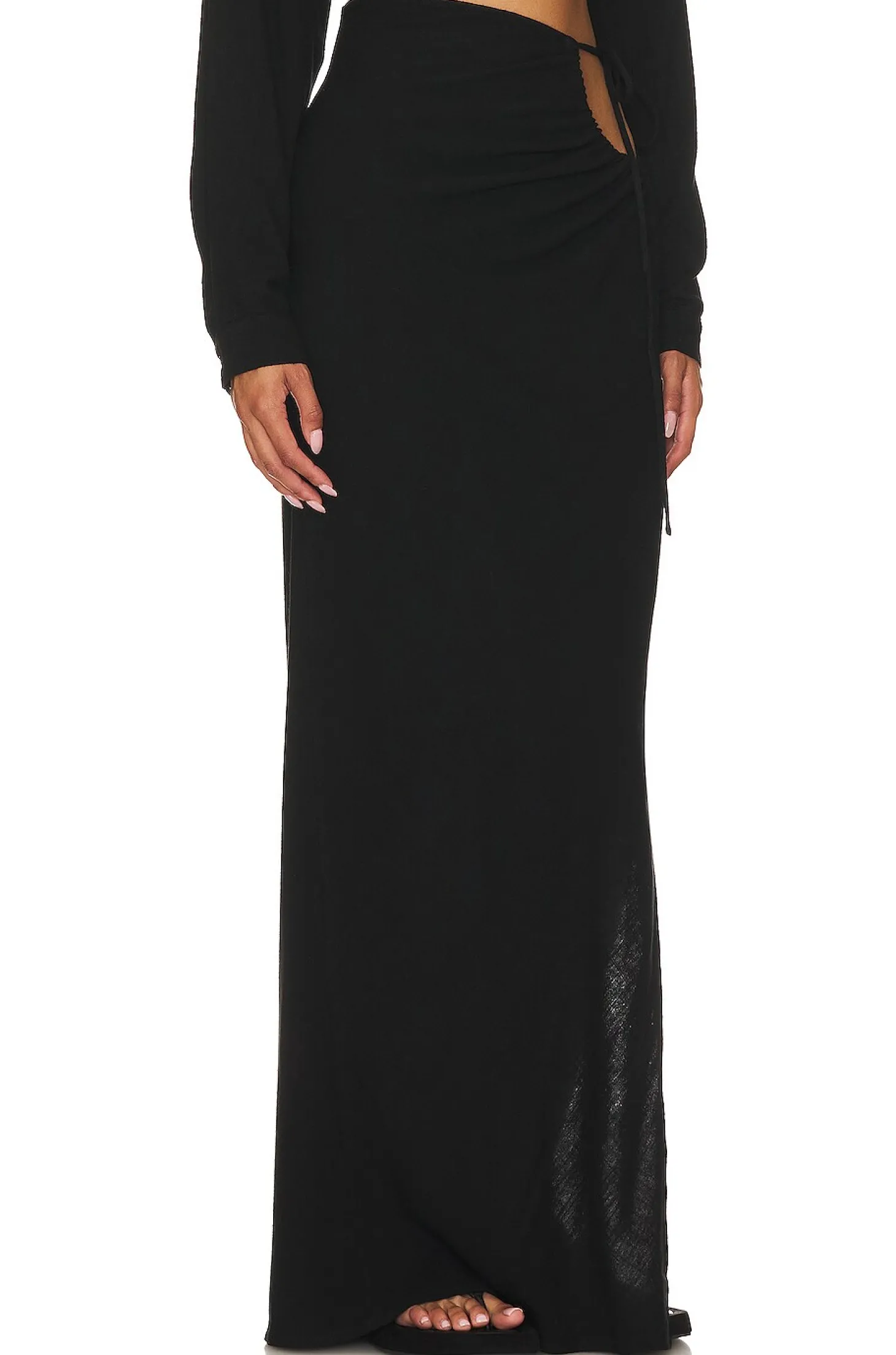 75% viscose 25% linen.Made in Australia.Machine wash.Unlined.Side tie closure.Hip cut-out.Item not sold as a set.Skirt measures approx 47" in length
