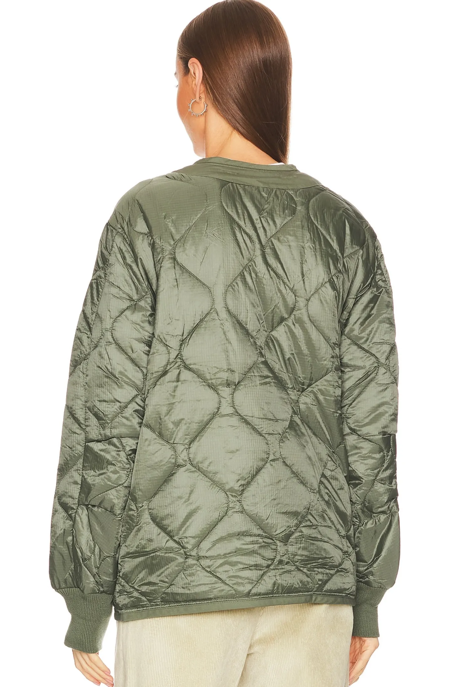 Self & Lining: 100% nylon Filling: 100% poly Knit: 99% poly 1% spandex.Imported.Button front closure.Front patch pockets.Rib knit cuffs.Quilted fabric