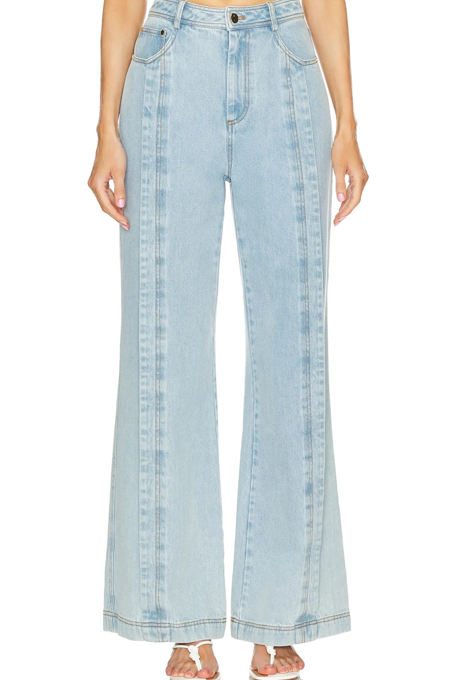 Denim textile.Imported.Machine wash recommended.Zip fly with button closure.5-pocket design.Front pleated detail.21" at the knee breaks to 22" at the leg opening