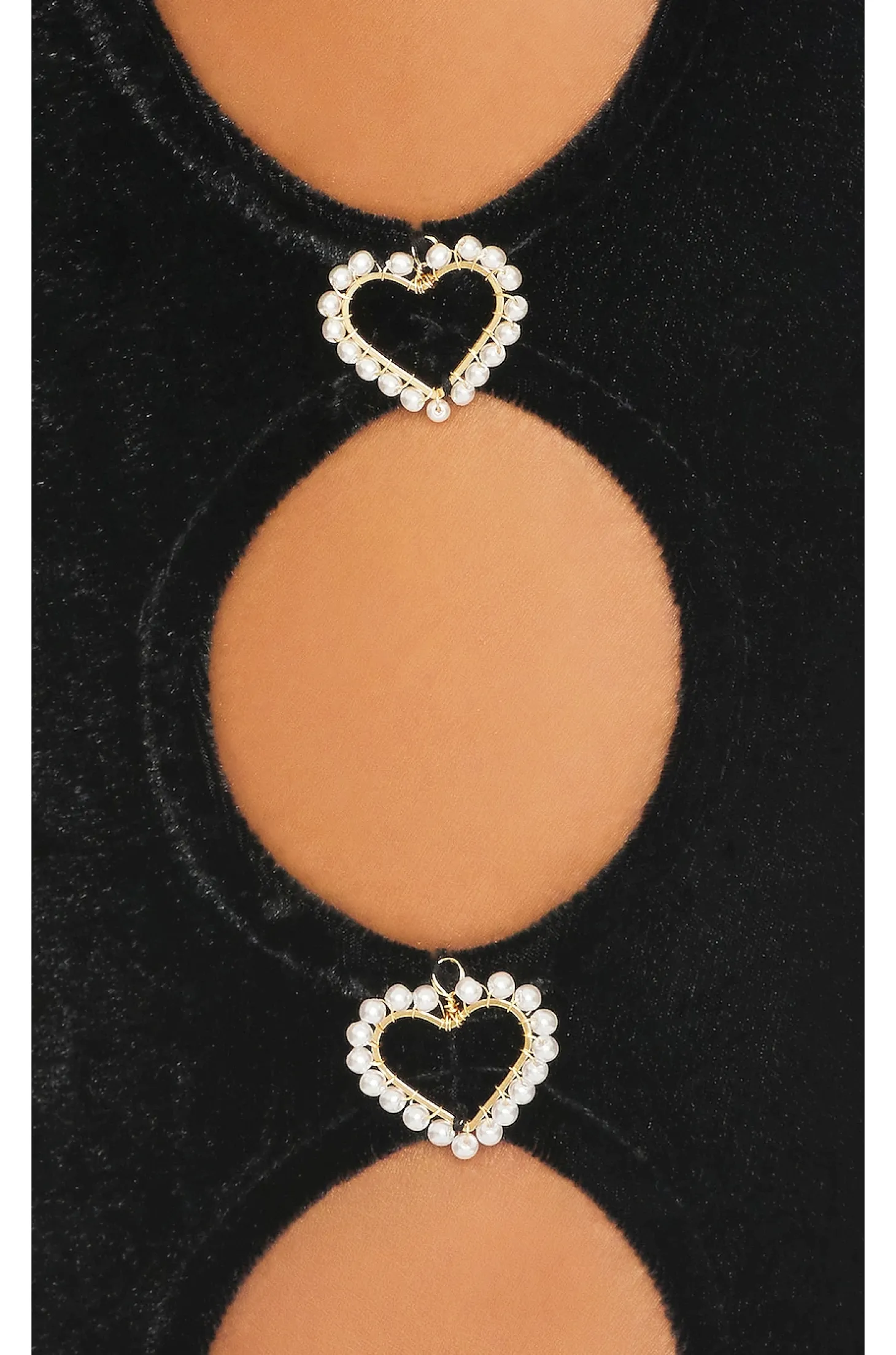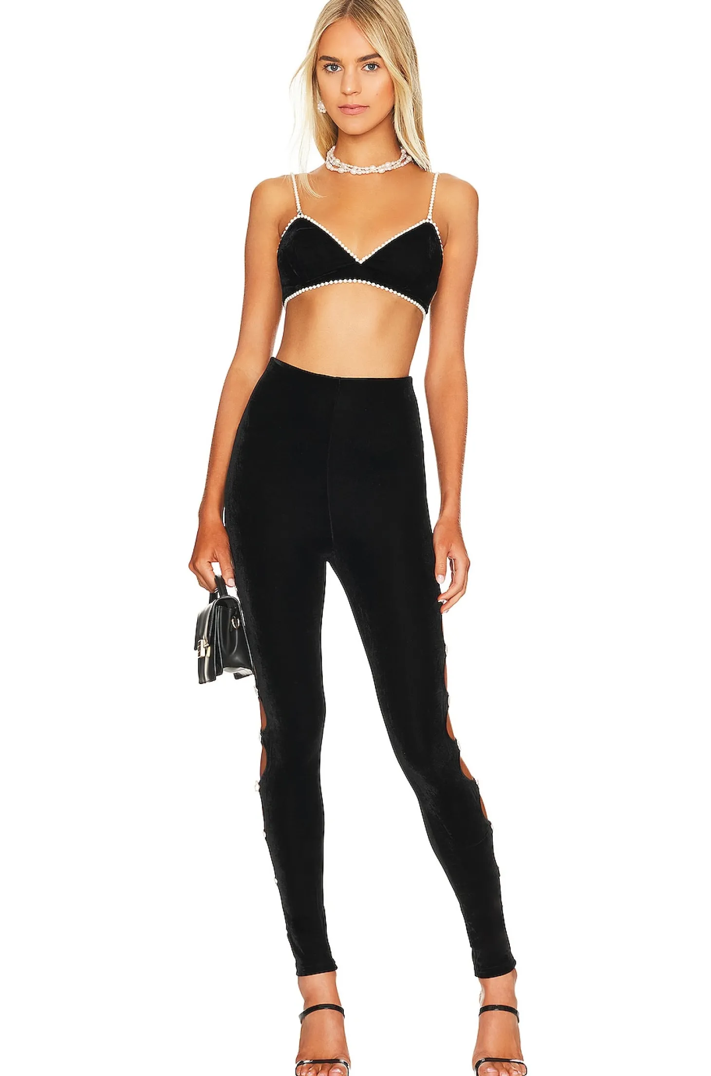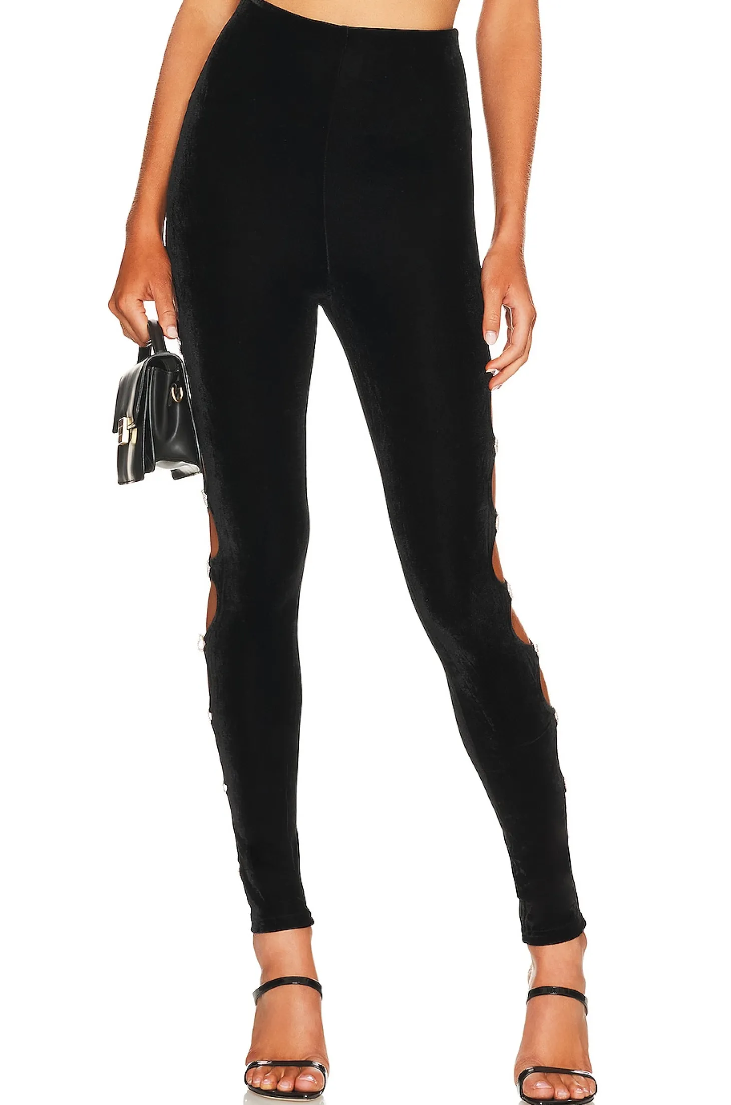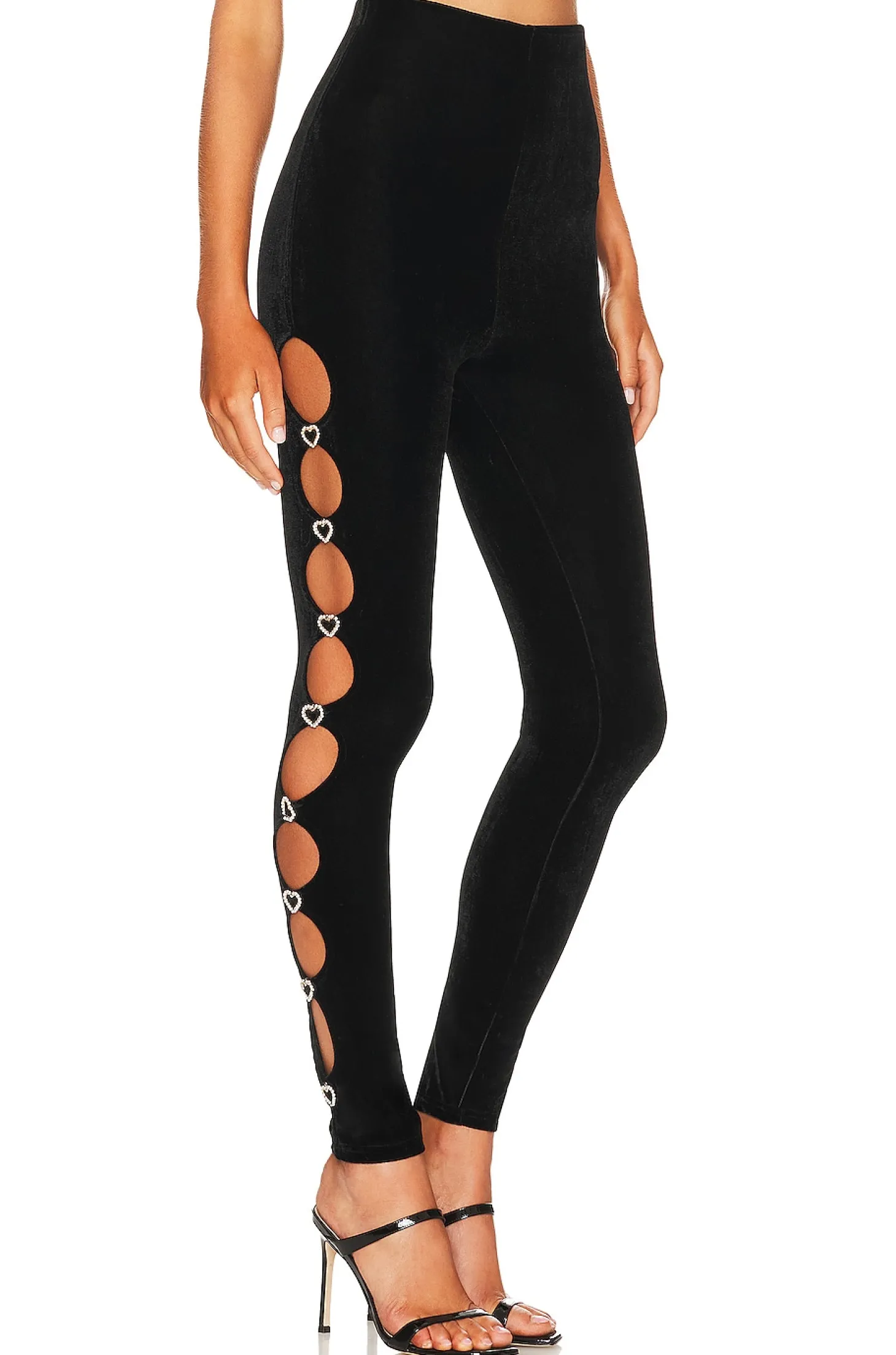 93% polyester 7% elastane.Made in China.Dry clean only.Elastic waistband.Cut-out design at side with faux pearl heart charms.Velvet fabric.Item not sold as a set.10" at the knee narrows to 8" at the leg opening