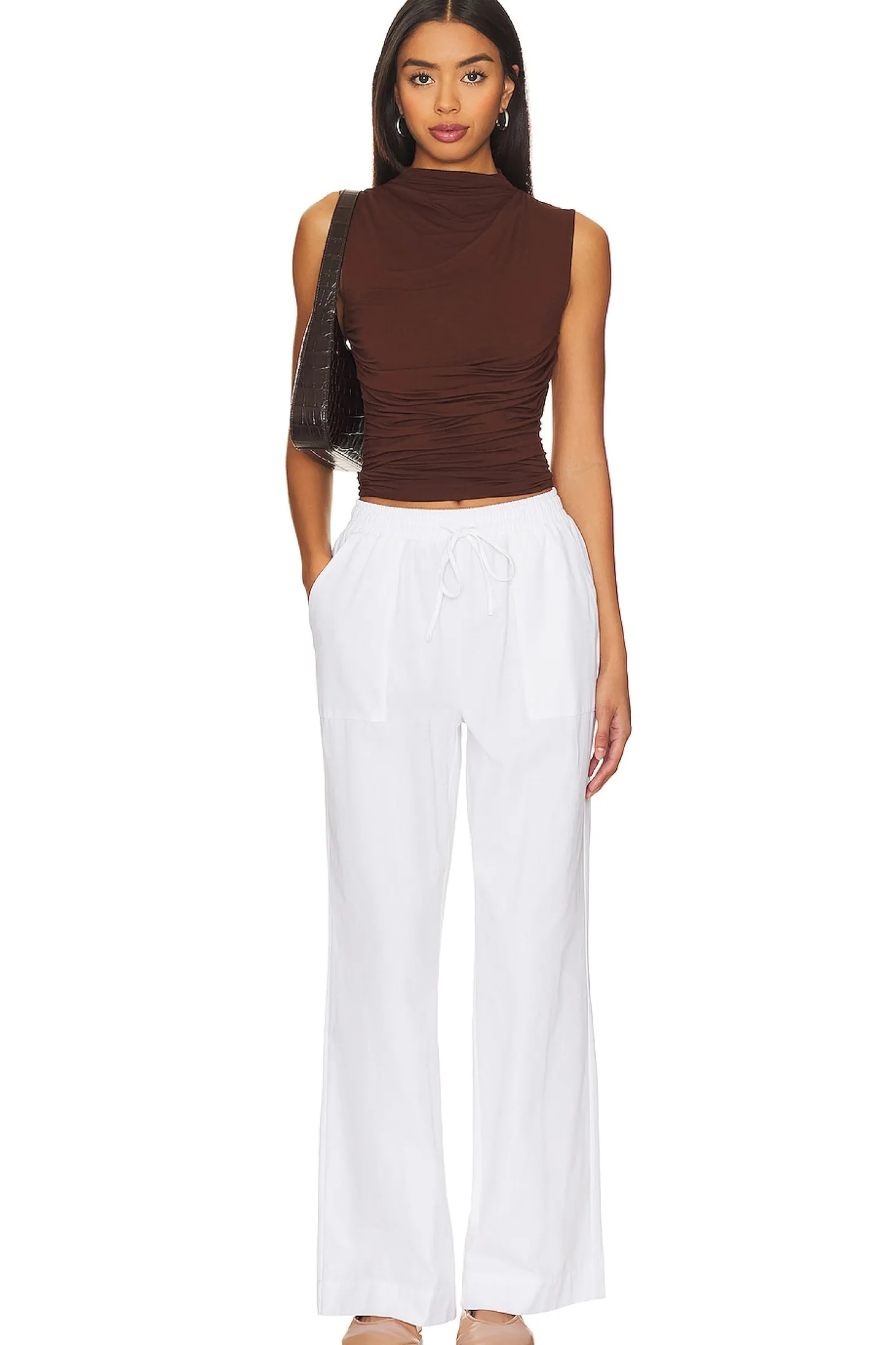 Embrace casual chic with superdown's Amy Cargo Pant in fresh white. Crafted from lightweight linen fabric with an elastic drawstring waistband, these pants offer comfort and style in one..100% cotton.Made in China.Hand wash.Elastic drawstring waistband.Side slant pockets.Lightweight linen fabric.20" at the knee and 22" at the leg opening