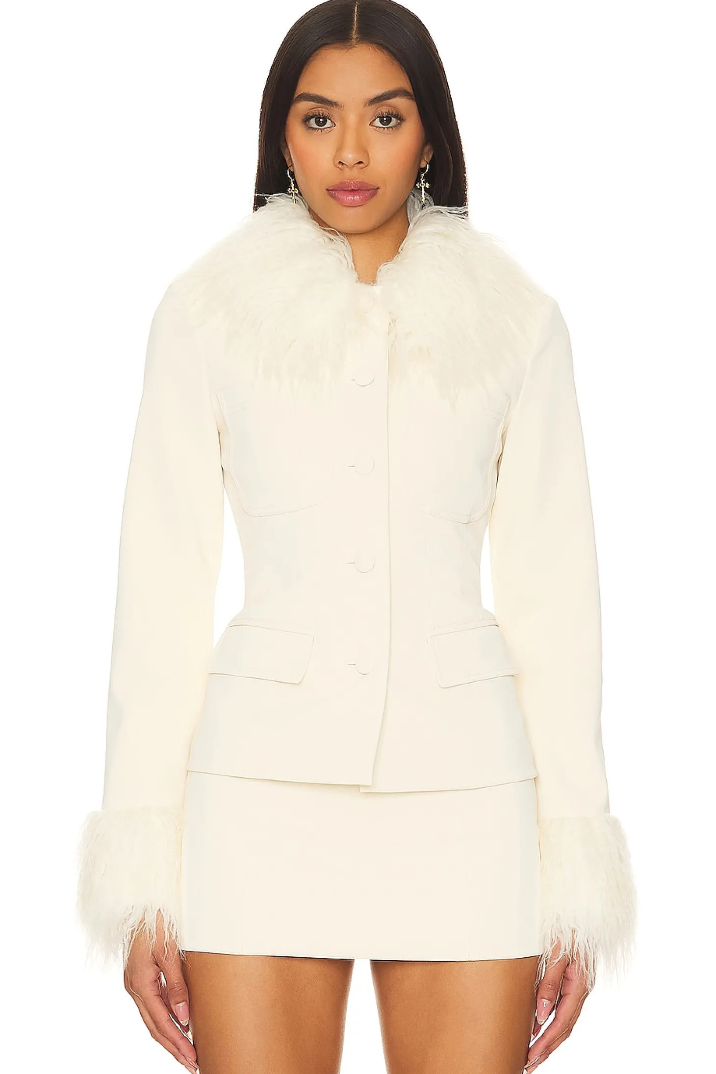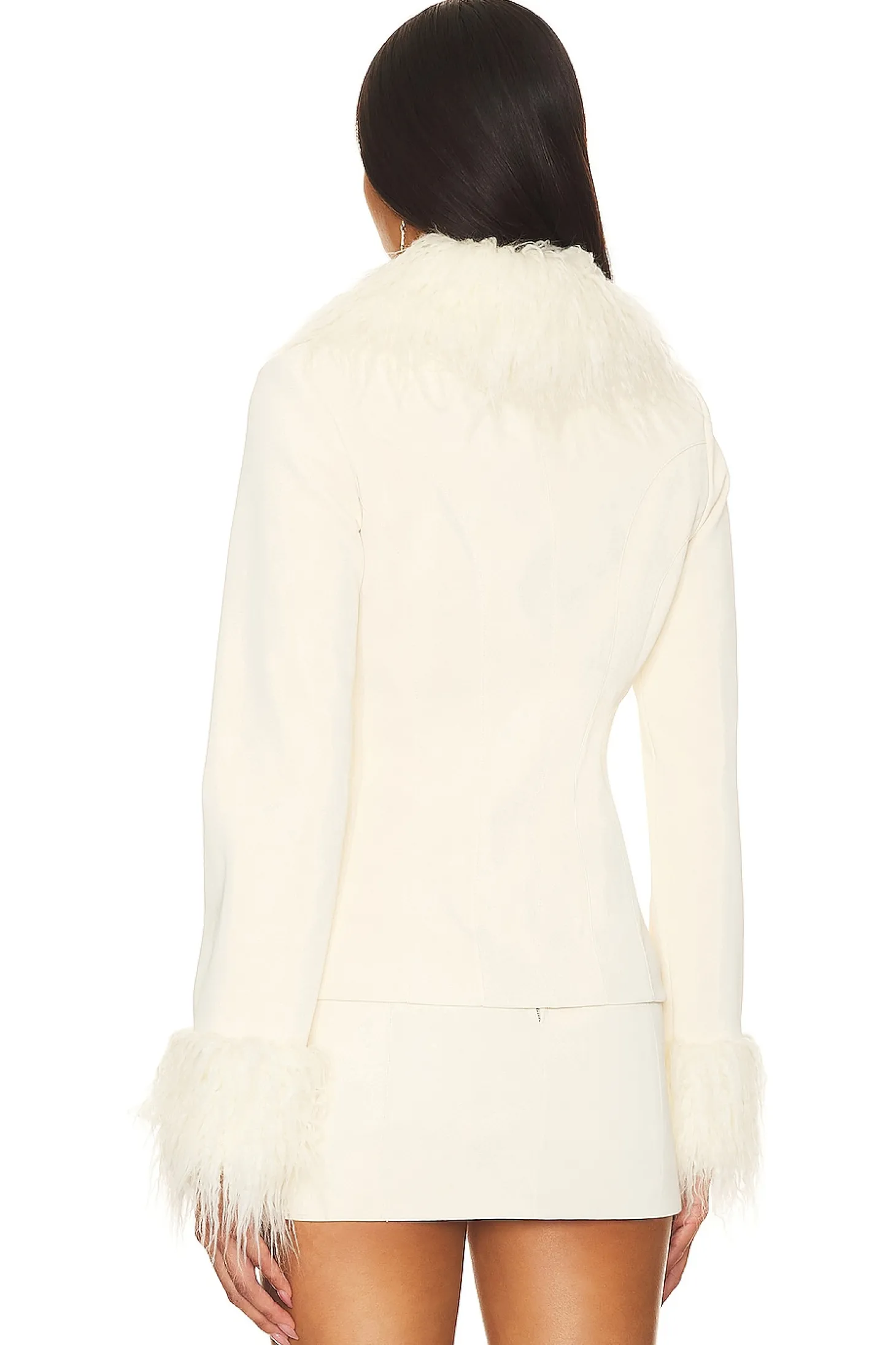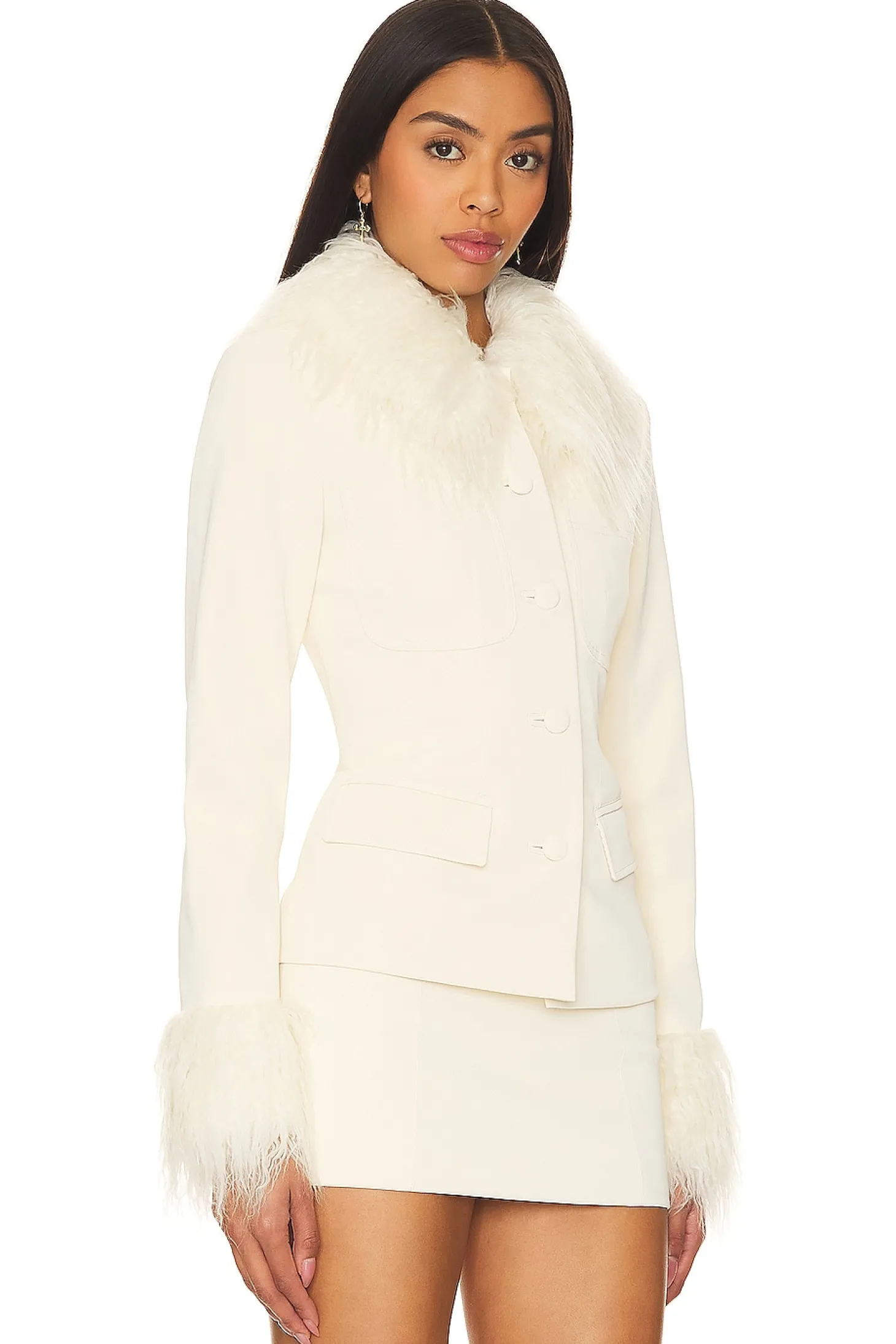 Self: 50% polyester 50% viscose Lining: 55% polyester 45% viscose Trim: 60% modacrylic 40% acrylic.Made in China.Dry clean only.Front button closure.Breast patch pockets.Front flap pockets.Faux leather fabric with faux fur trim.Item not sold as a set