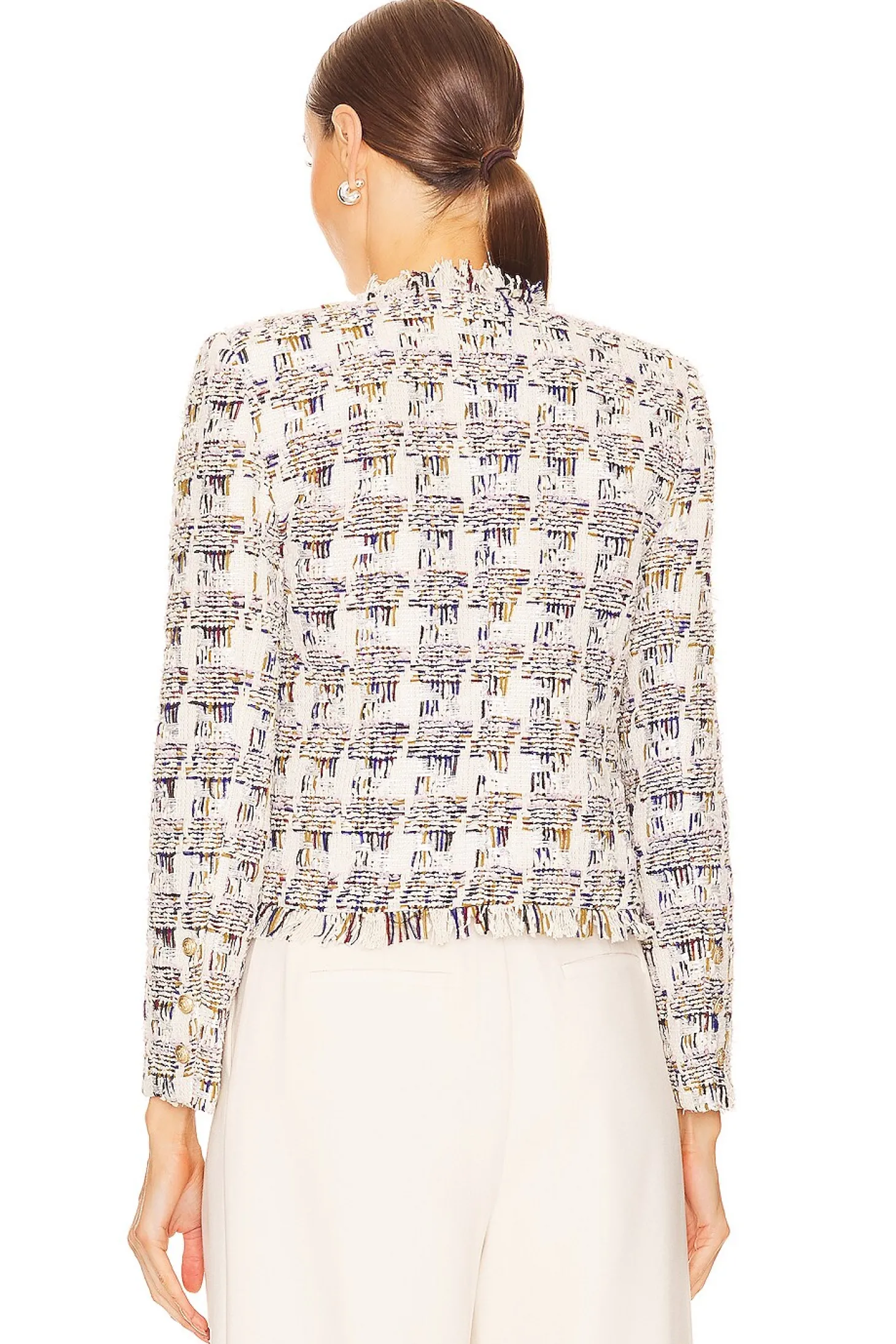 Self: 70% polyester 30% cotton Lining: 100% polyester.Made in China.Dry clean only.Open front.Padded shoulders.Front slip pockets.Midweight tweed fabric with fringe hem