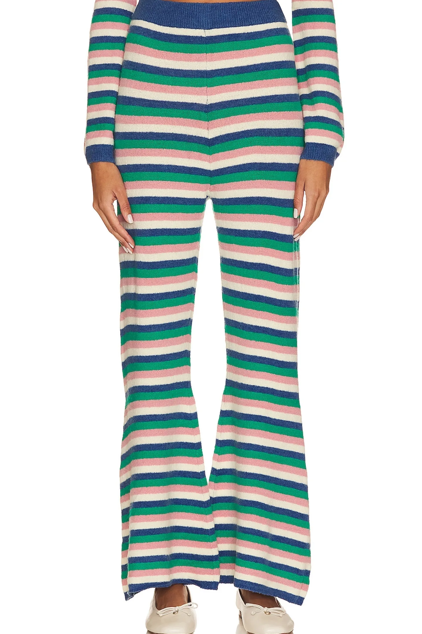 70% acrylic 27% nylon 3% elastane.Made in China.Machine wash.Elastic waistband.Soft knit fabric.Item not sold as a set.18" at the knee breaks to 28" at the leg opening