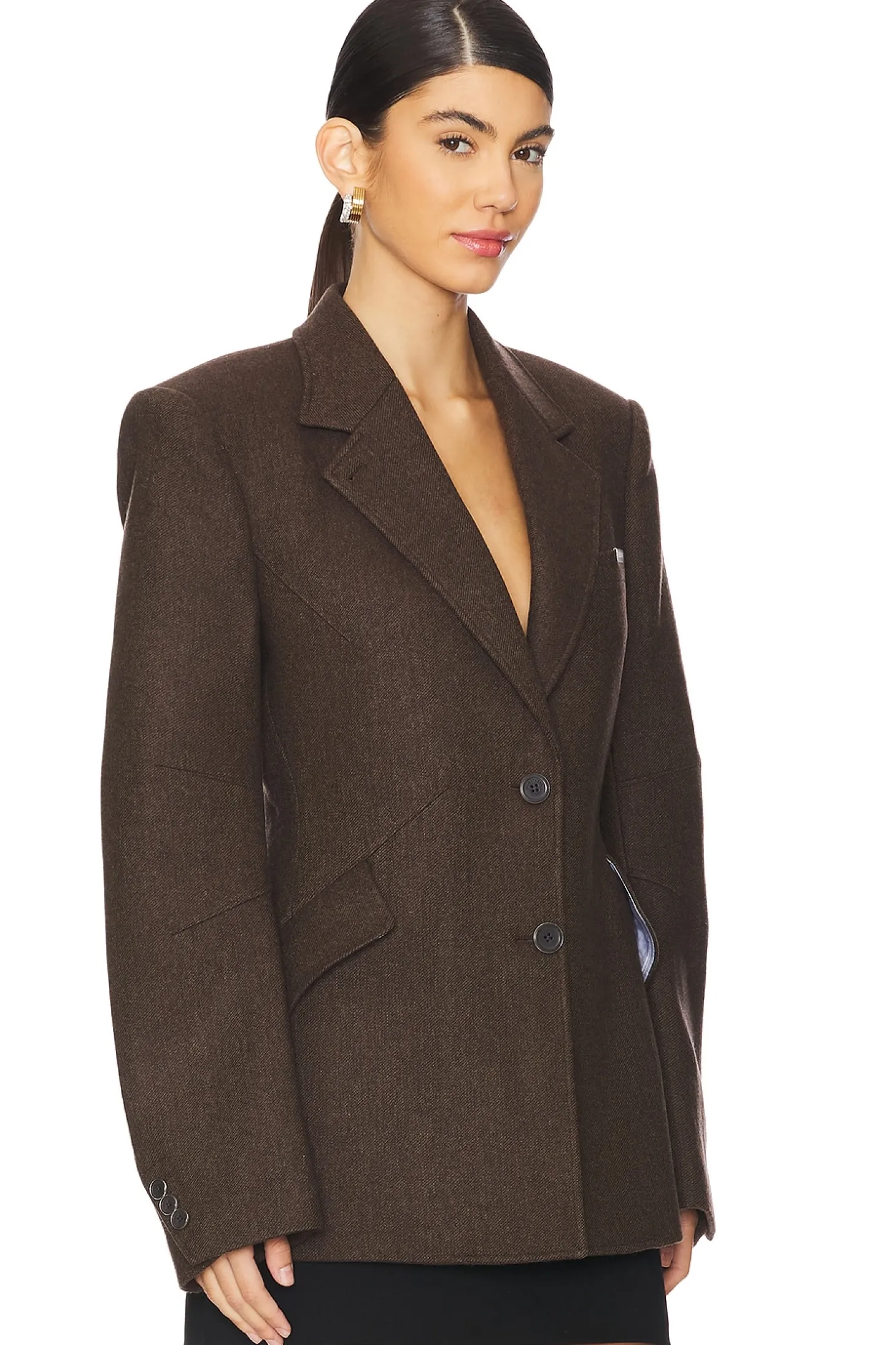 Self 1: 70% wool 30% polyamide Self 2: 50% linen 35% wool 15% viscose.Made in China.Dry clean only.Front button closure.Structured padding at shoulders with buttoned cuffs.Breast welt pocket with silver tone logo embossed hardware.Side flap pockets and darted waist
