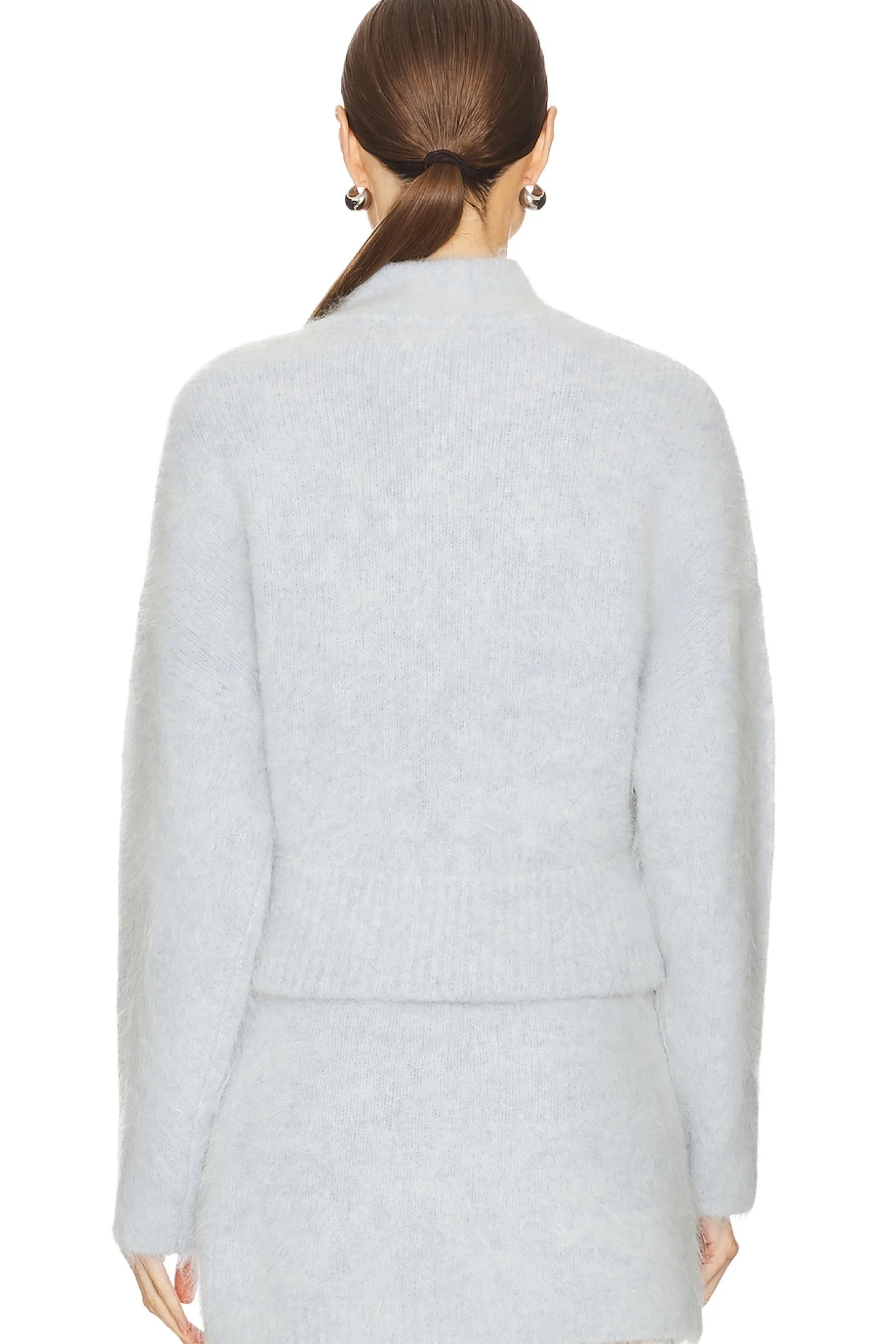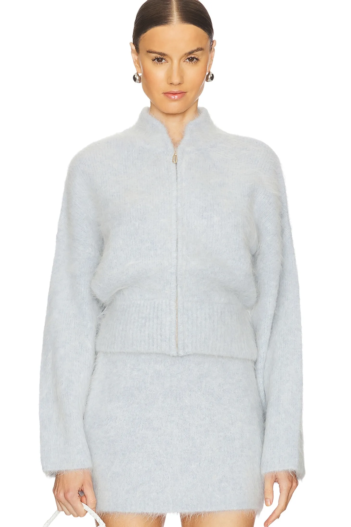 59% alpaca 25% acrylic 15% nylon 1% elastane.Made in China.Dry clean only.Hidden front zipper closure.Fuzzy knit fabric.Item not sold as set
