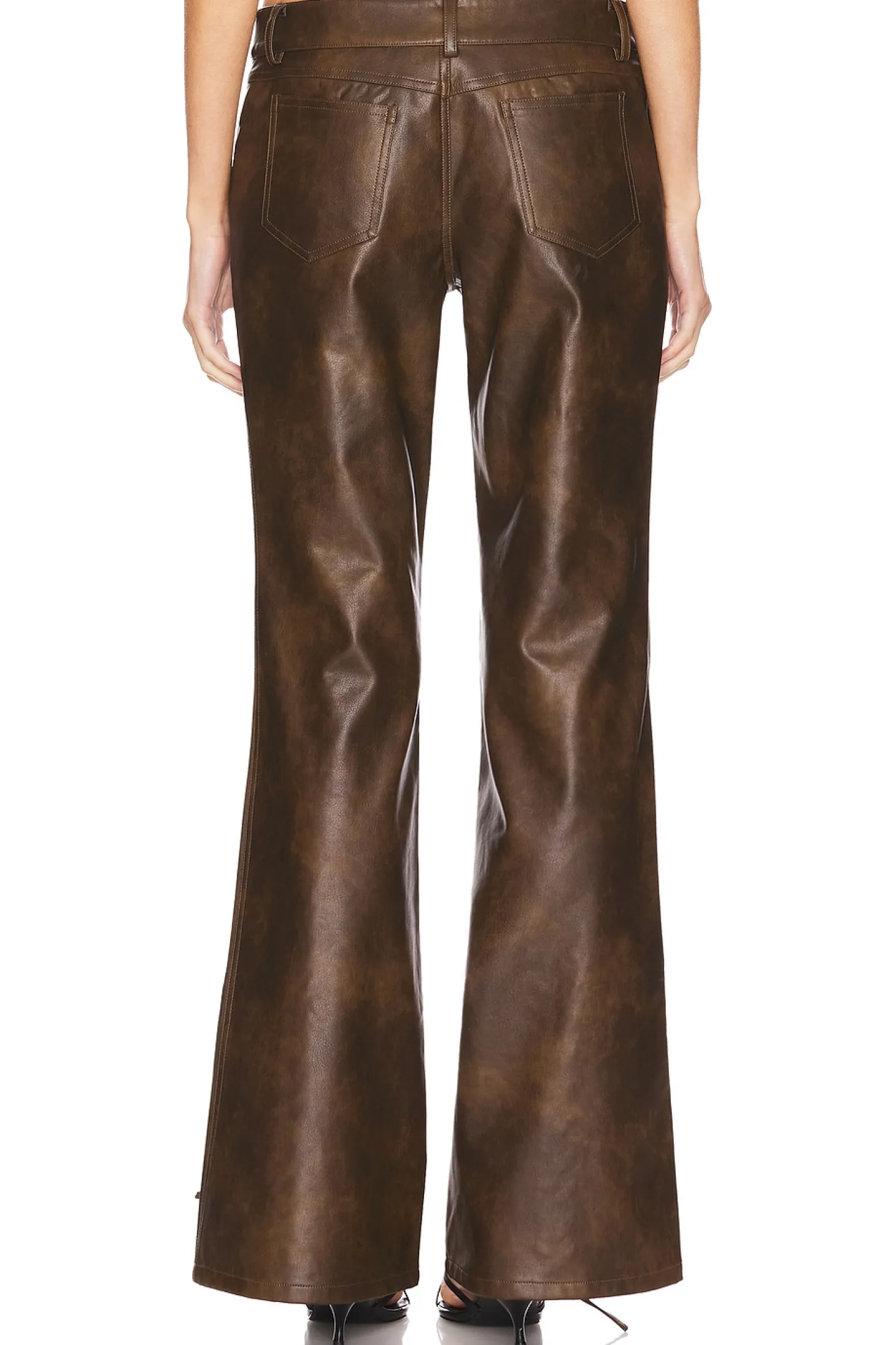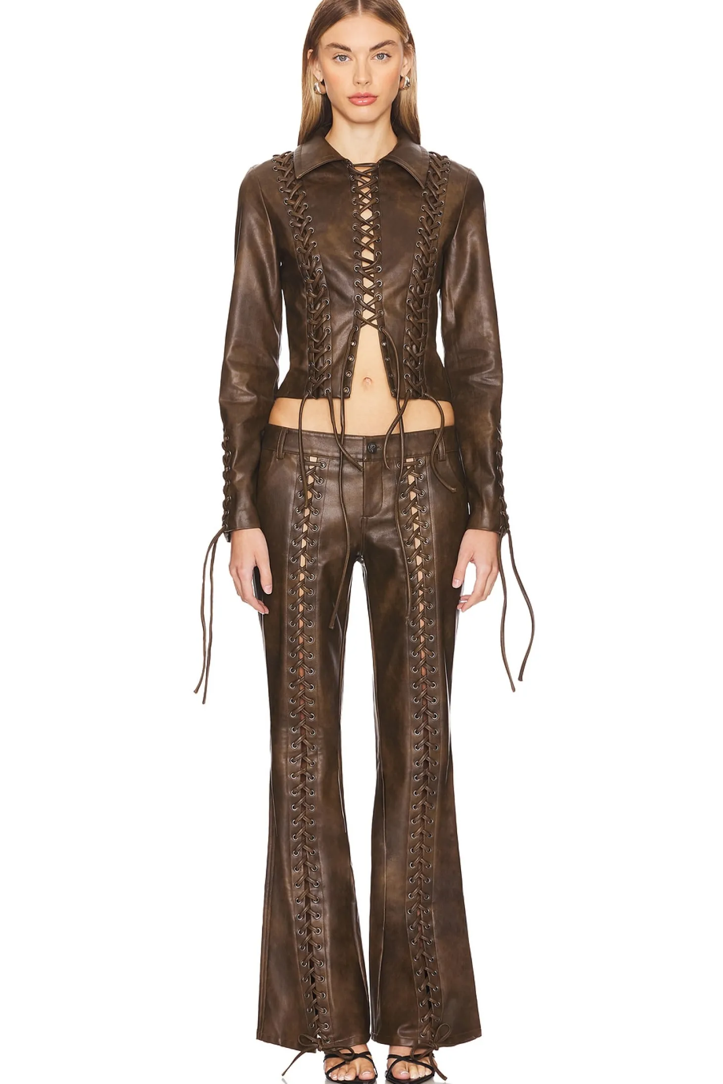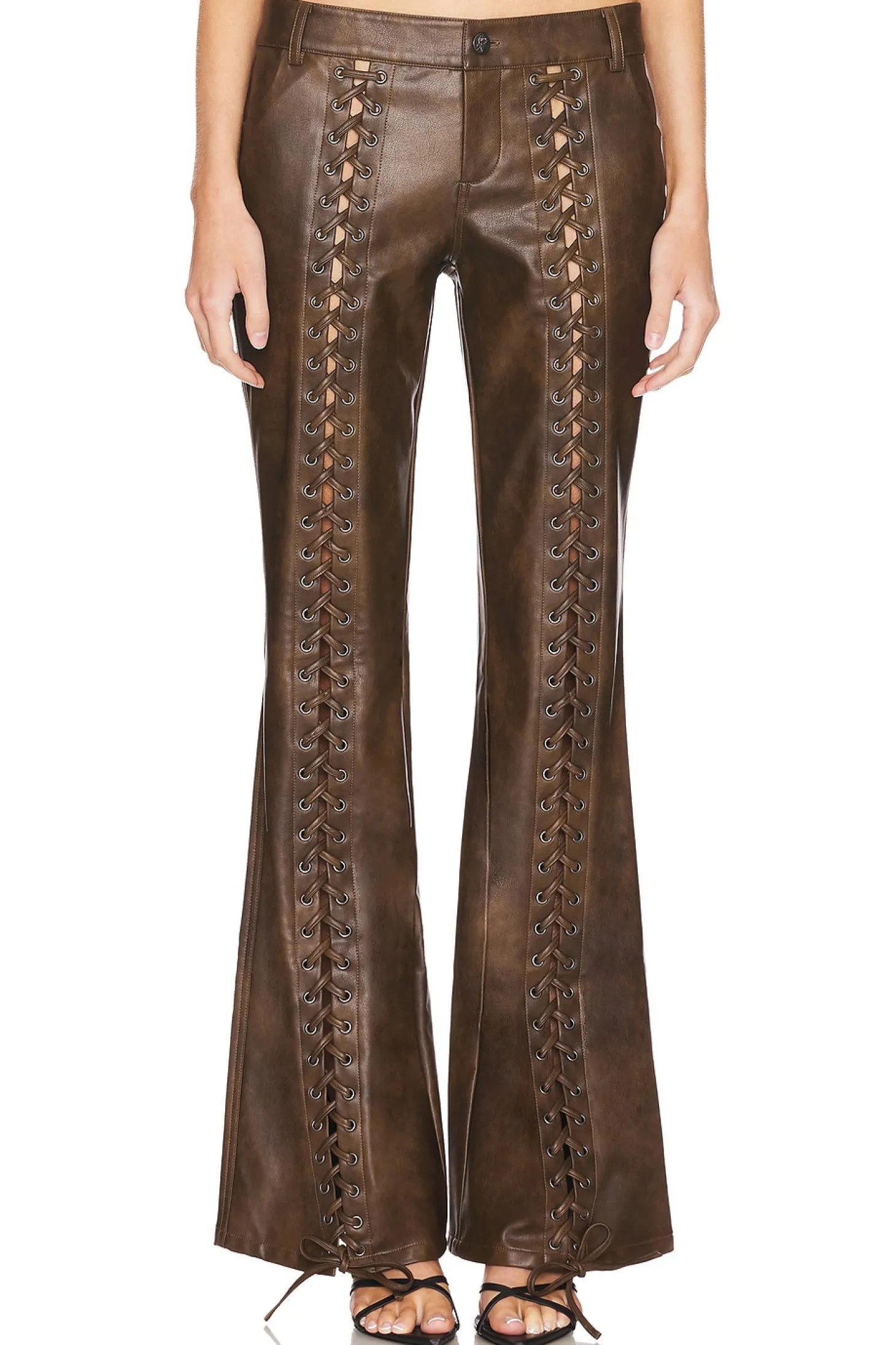 Self: 100% polyurethane Back: 100% viscose Lining: 97% polyester 3% elastane.Made in China.Hand wash.Zip fly and button closure.4-pocket design.Faux leather with lace-up detail.Item not sold as set.18" at the knee breaks to 23" at the leg opening