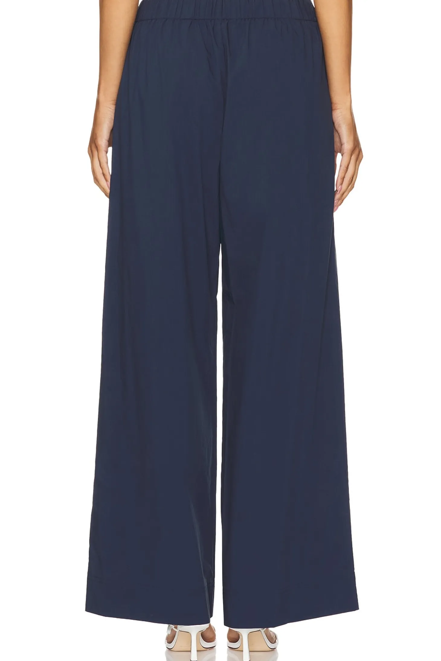 63% cotton 37% polyester.Made in China.Dry clean only.Pull-on styling with elastic waistband.Side slant pockets.Lightweight poplin fabric.22" at the knee breaks to 24" at the leg opening