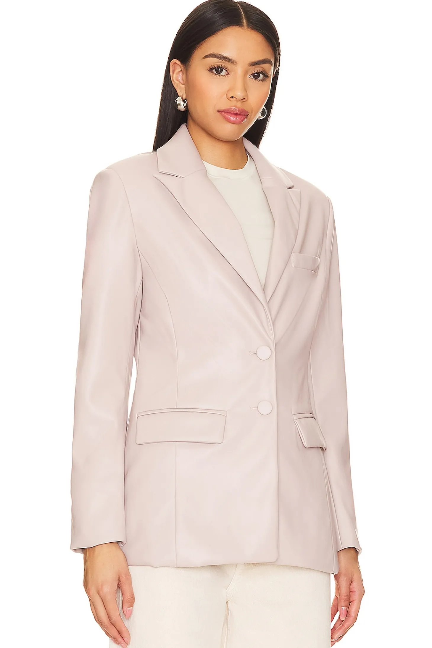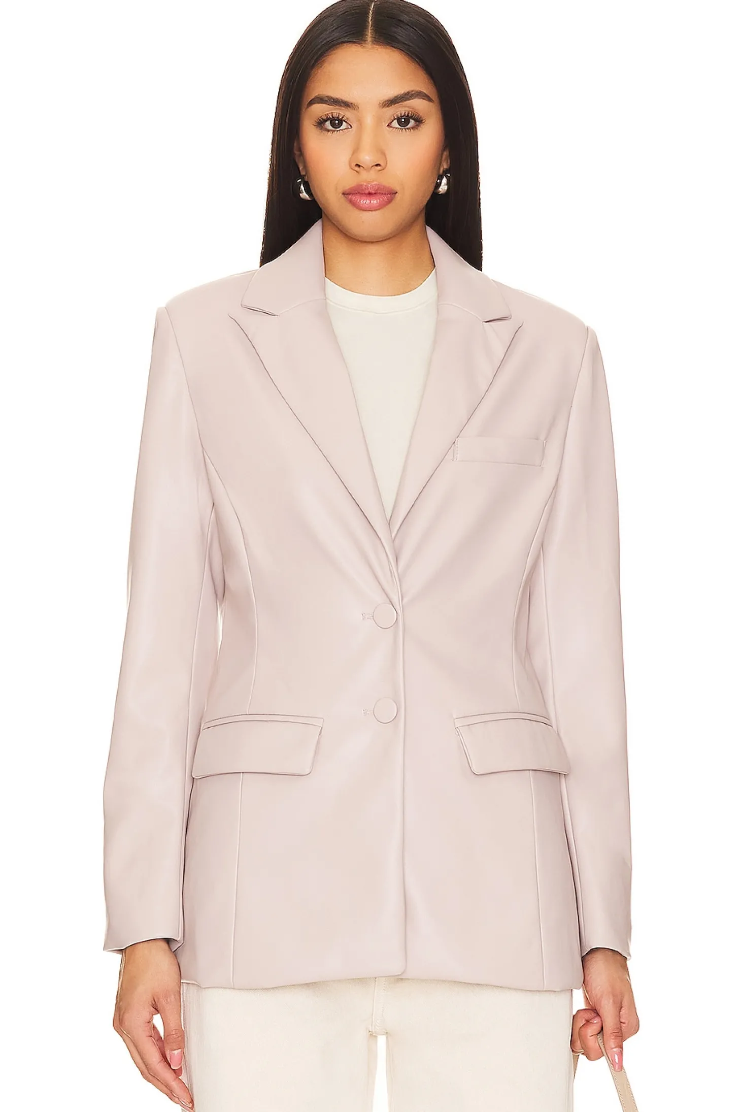 Self: 100% polyurethane Backing & Lining: 100% polyester.Made in China.Wipe clean only.Front button closure.Padded shoulders.Front flap pockets.Lightweight faux leather fabric