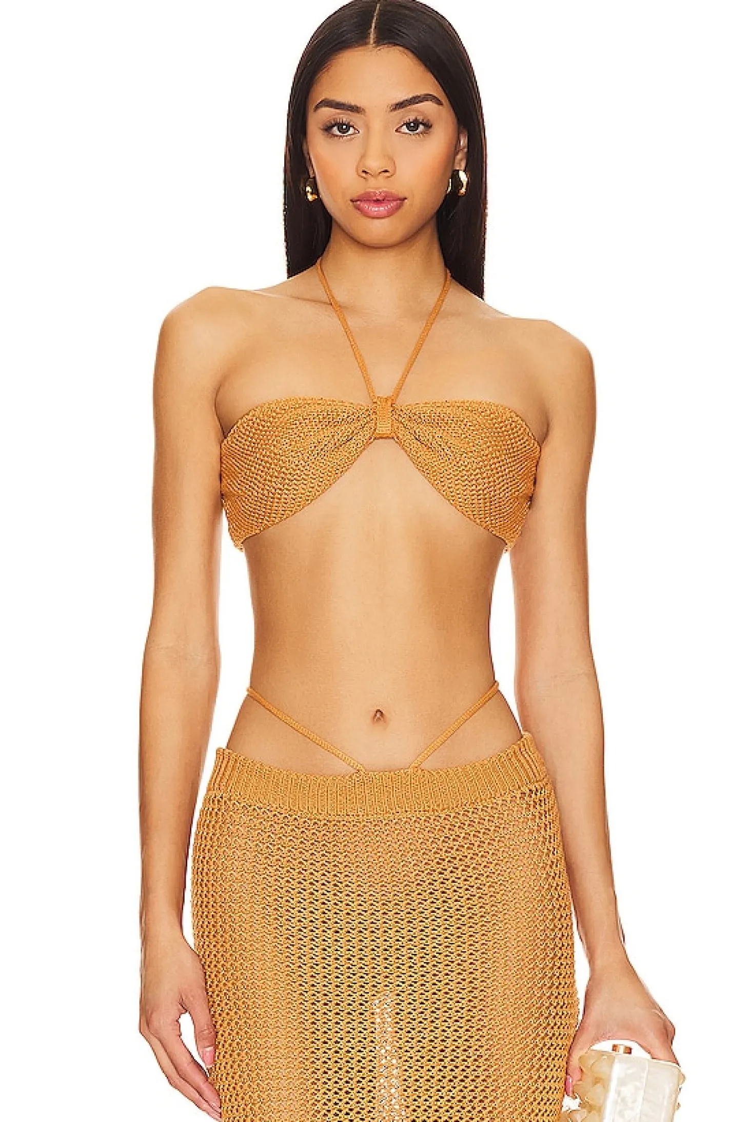100% polyamide.Made in China.Hand wash.Halterneck tie closure.Open crochet knit fabric.Item not sold as set.Garment is intentionally sheer, undergarments will show through. Please note undergarment not included.Item not sold as set