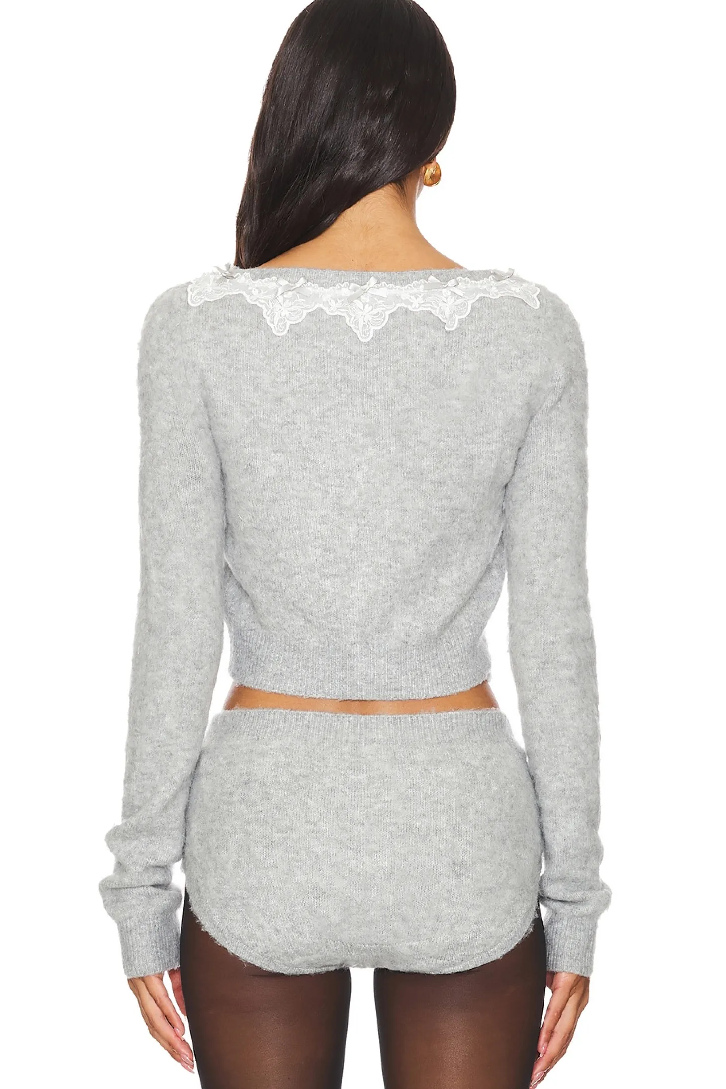 Knit textile.Imported.Hand wash recommended.Front button closure.Lace trim and bow embellishment.Fuzzy midweight knit fabric
