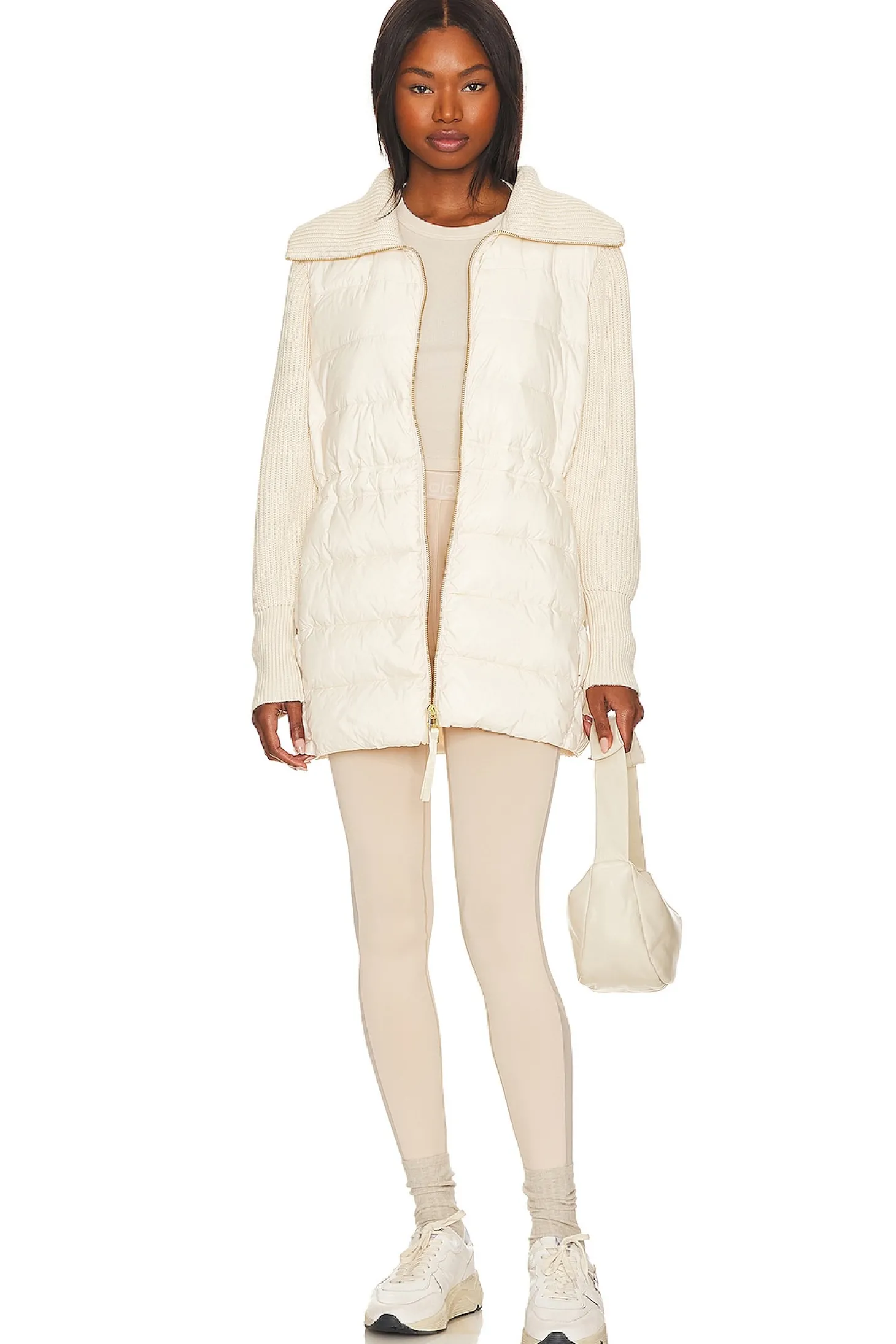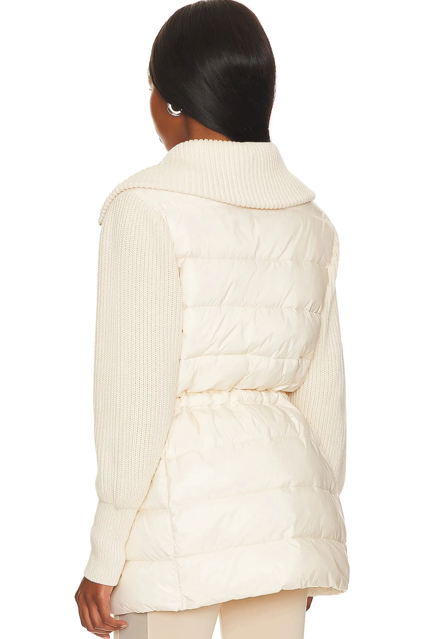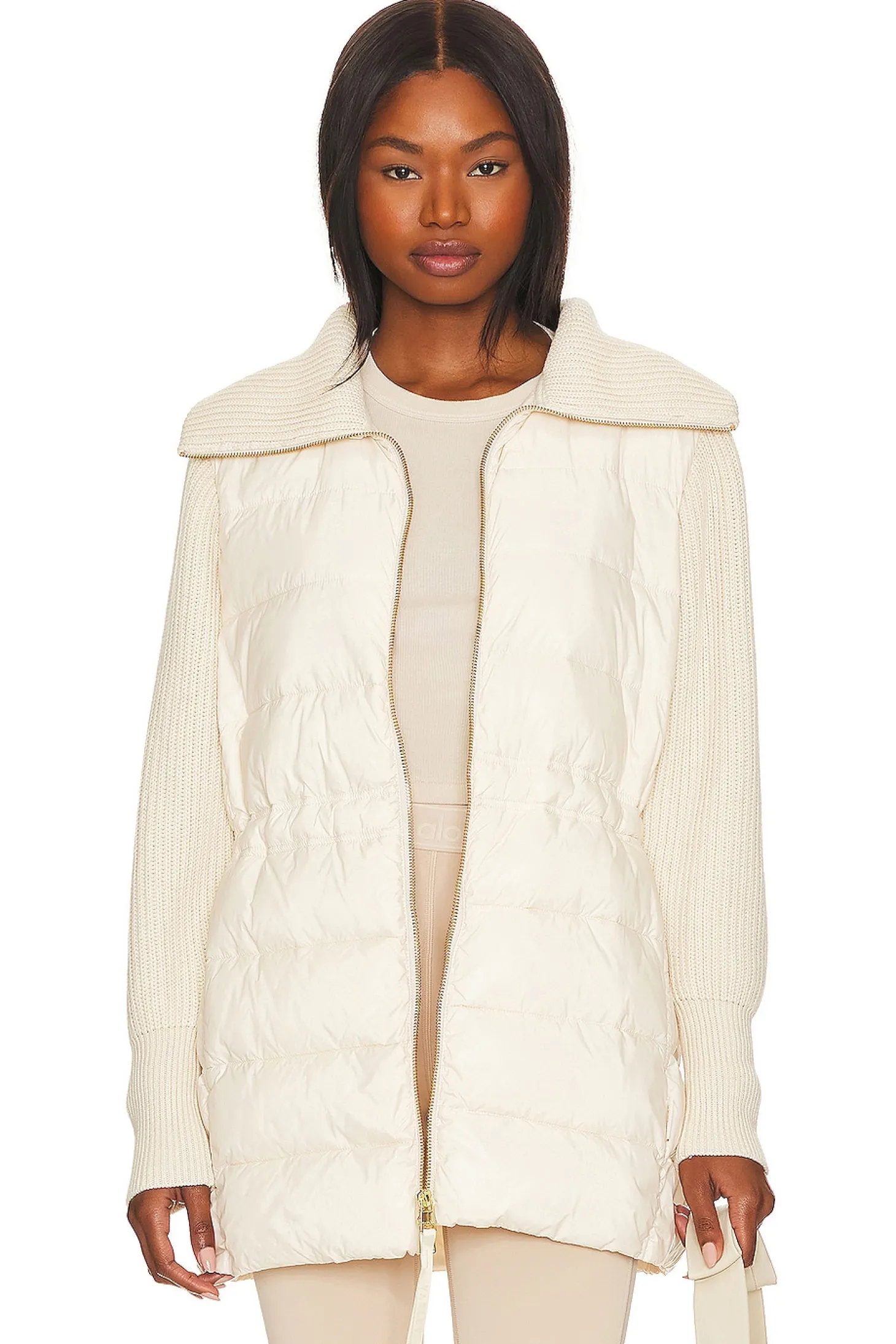 Body: 100% nylon Sleeves or collar: 100% cotton Fill: 100% polyester .Made in China.Hand wash recommended.Two-way front zip closure.Drawstring waist.Ribbed neckline and sleeves