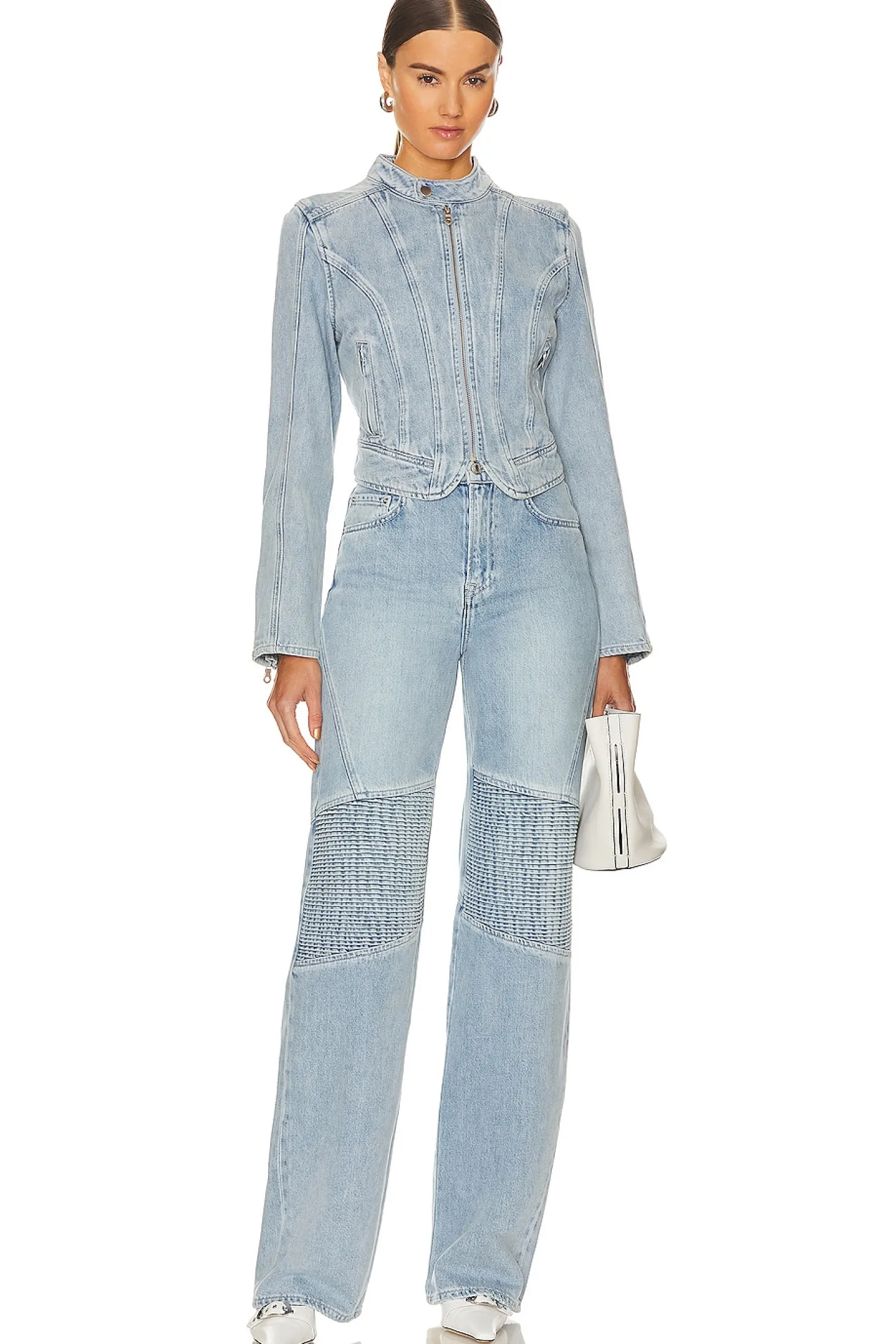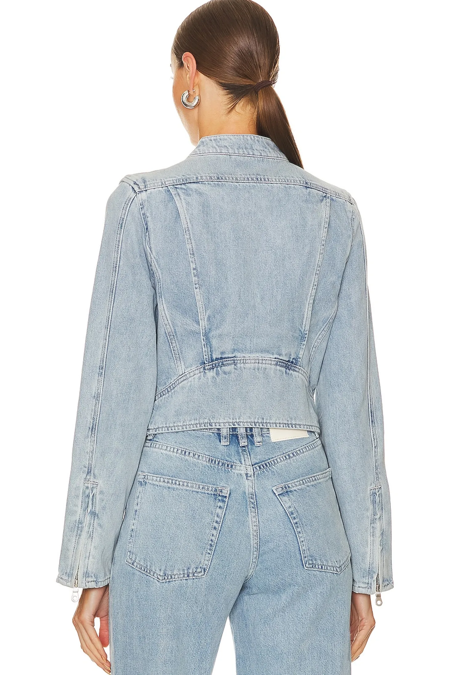 100% cotton.Made in China.Machine wash.Front zipper closure.Side slant zipper pockets.Zipper cuffs.Midweight denim fabric.Item not sold as a set
