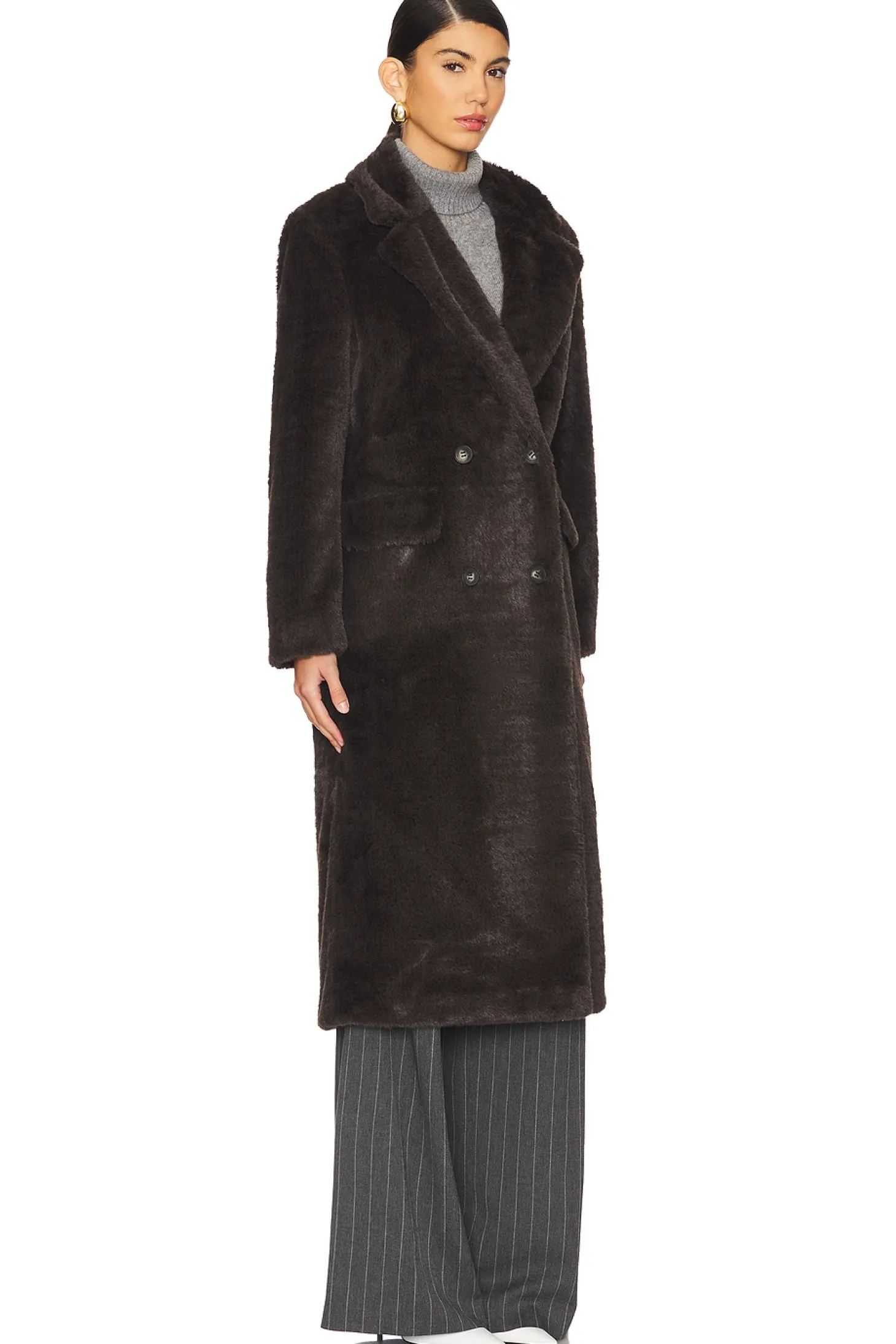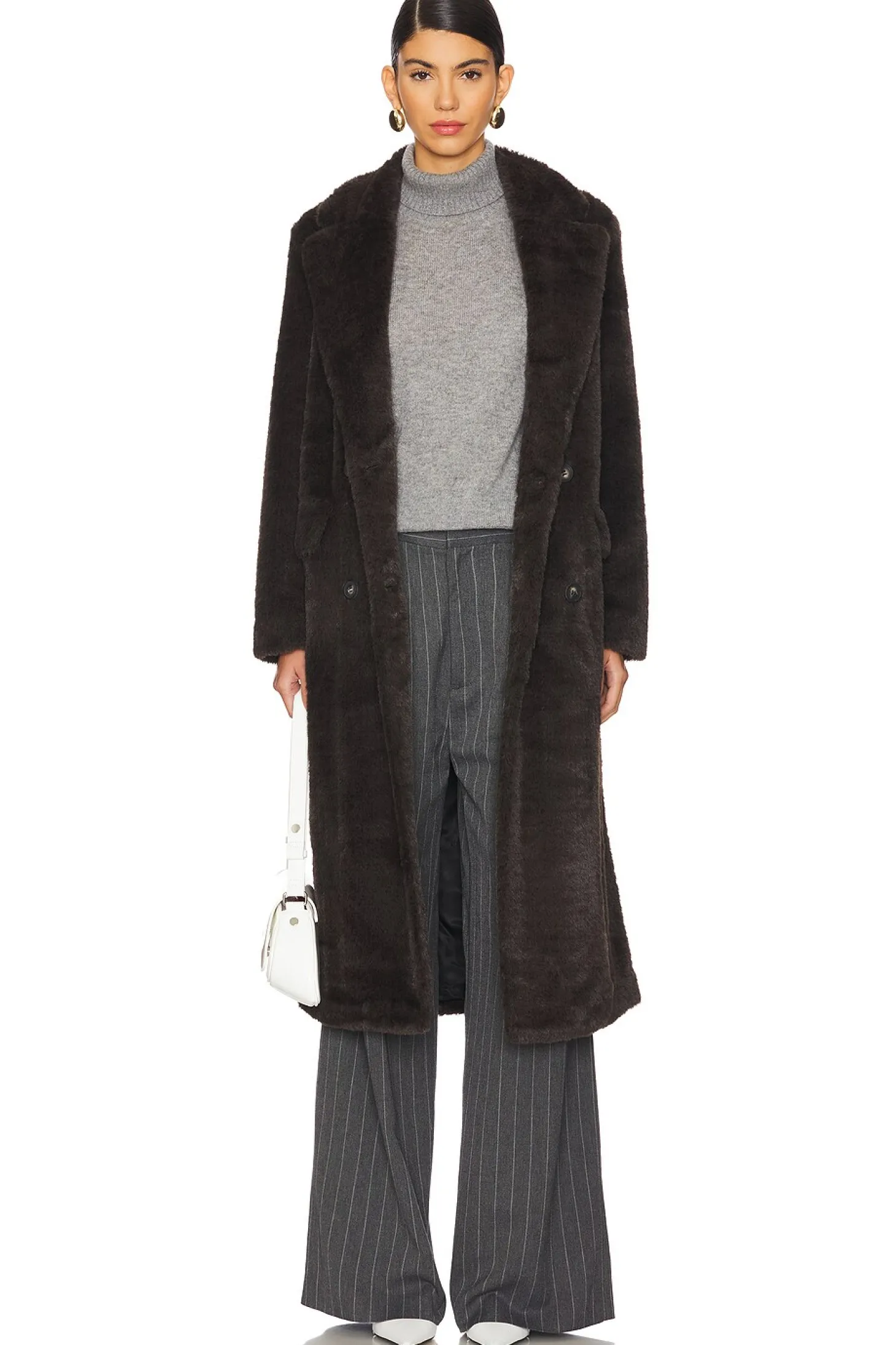 Self: 100% polyester Lining: 100% recycled polyester.Made in China.Dry clean only.Front button closure.Front slip pockets.Heavyweight faux fur fabric with notched lapel collar