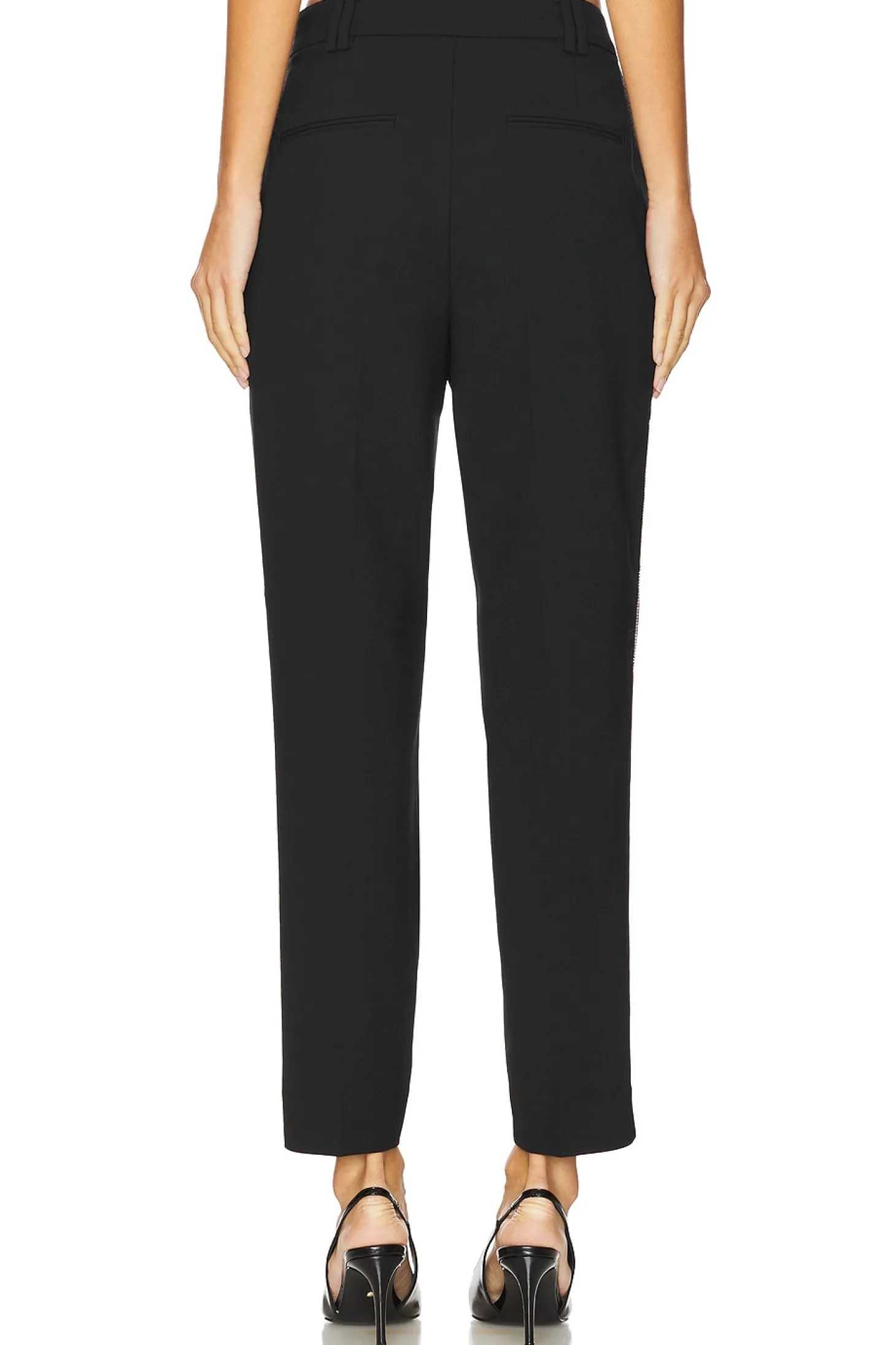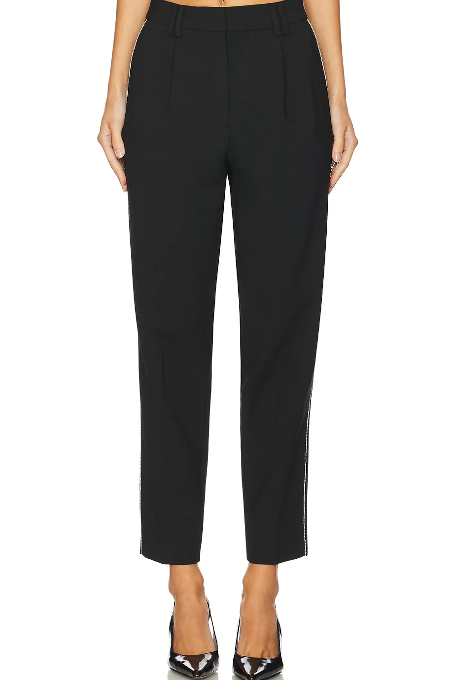 Self: 43% recycled polyester 32% viscose 23% wool 2% elastane Pocket Lining: 100% recycled polyester.Made in China.Dry clean.Zip fly with dual hook and bar closure.4-pocket styling.Front pintuck detailing.Suiting fabric with crystal embellished trim at sides Item not sold as a set.16" at the knee narrows to 12" at the leg opening