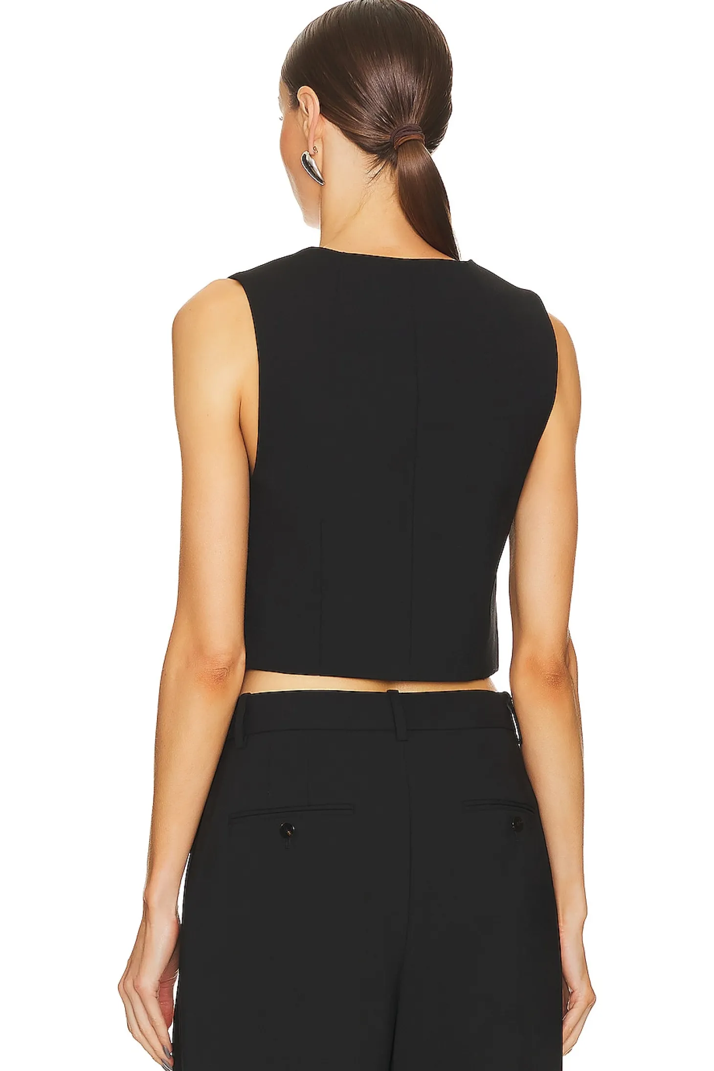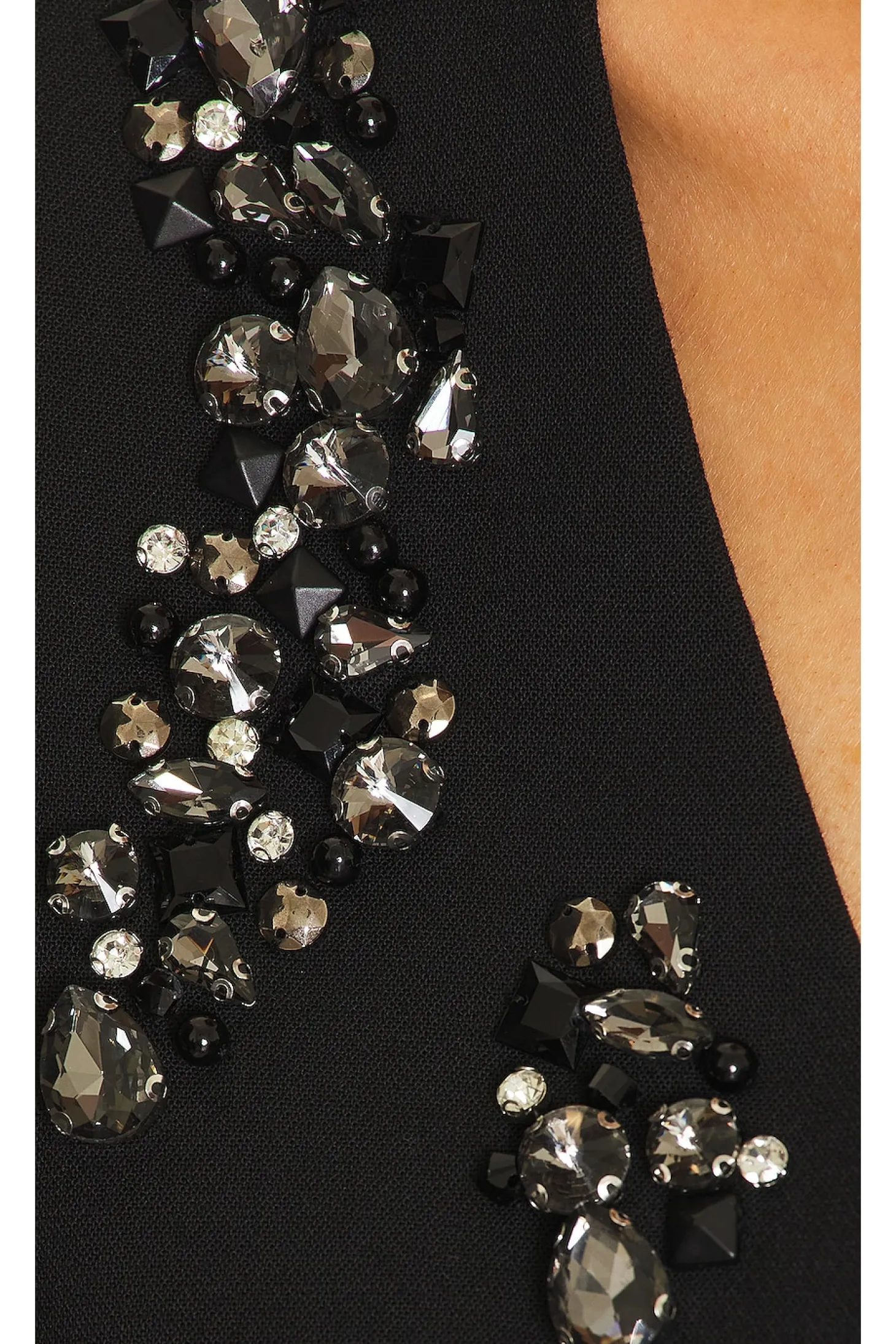 Self: 43% polyester 32% viscose 23% wool 2% elastane Lining: 100% polyester.Made in China.Machine wash.Front button closure.Crystal and tonal stud embellishments.Twill suiting fabric
