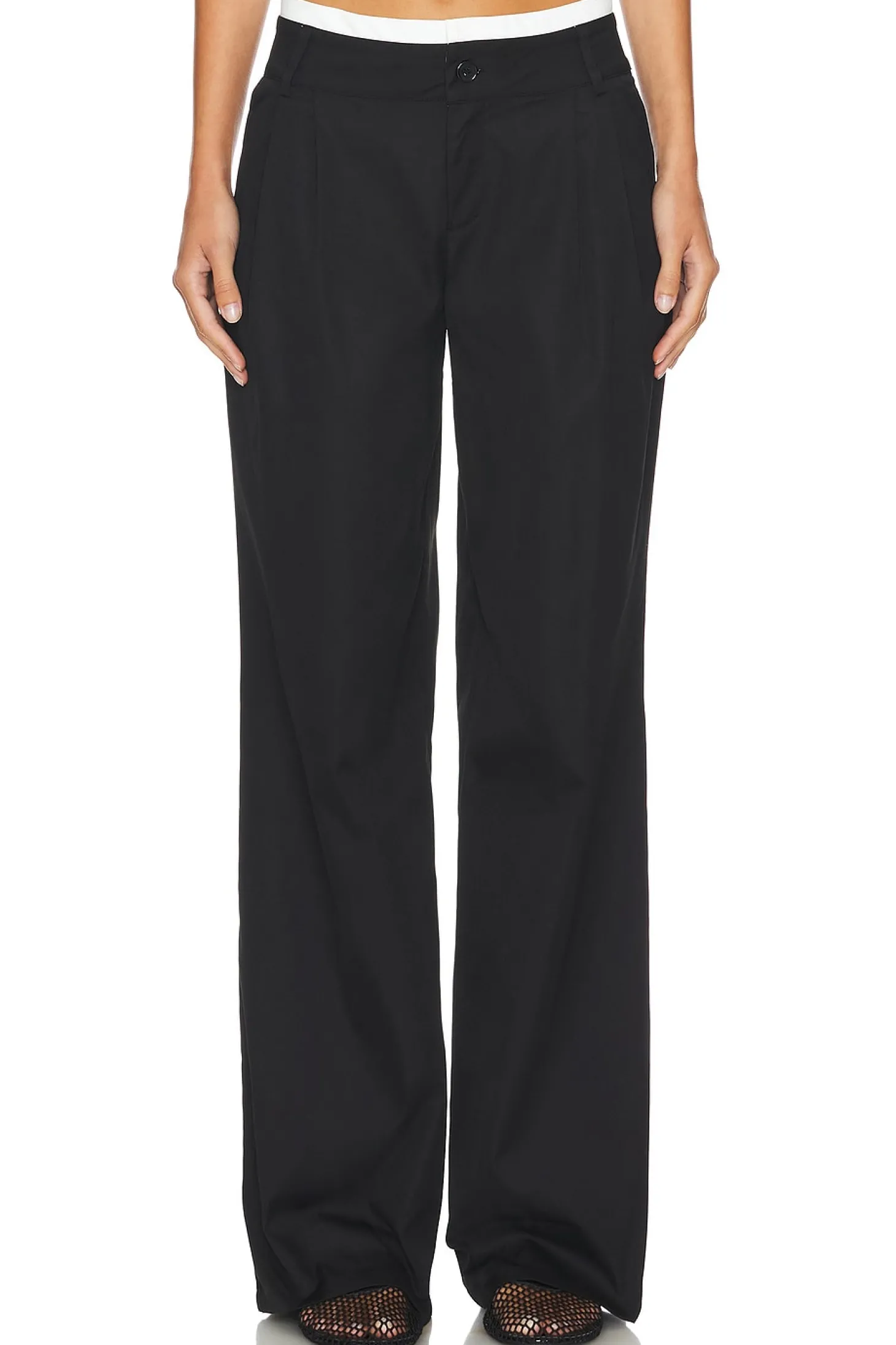 100% polyester.Made in China.Hand wash.Zip fly and button closure.4-pocket style.Lightly pleated detail.Poplin fabric with contrast at waist.22" at the knee and 22" at the leg opening