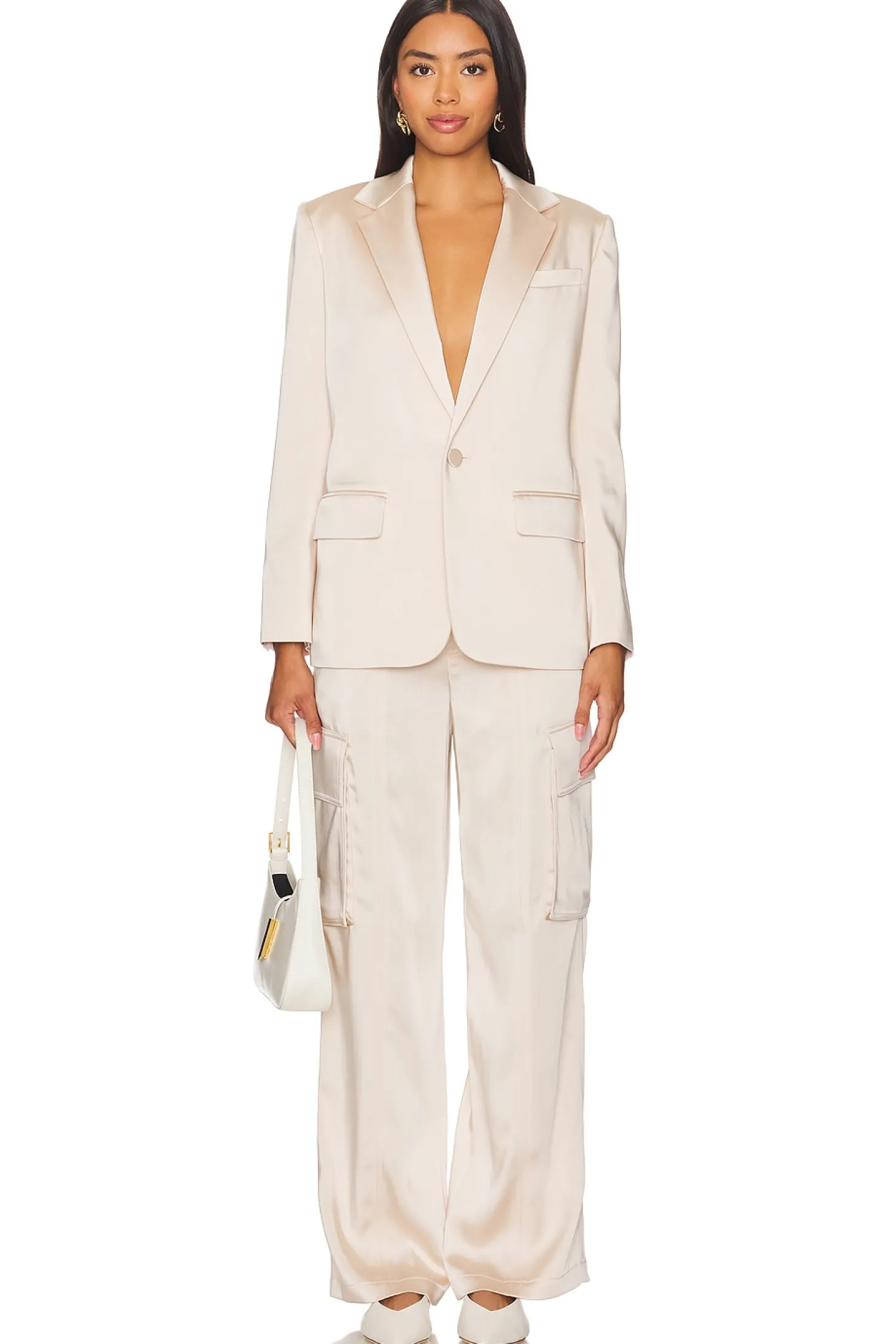 Self: 88% triacetate 12% polyester Lining: 51% polyester 49% cotton Sleeve Lining: 100% polyester.Made in Vietnam.Dry clean only.Singular front button closure.Side flap pockets.Padded shoulders with buttoned cuffs.Satin finish.Item not sold as a set