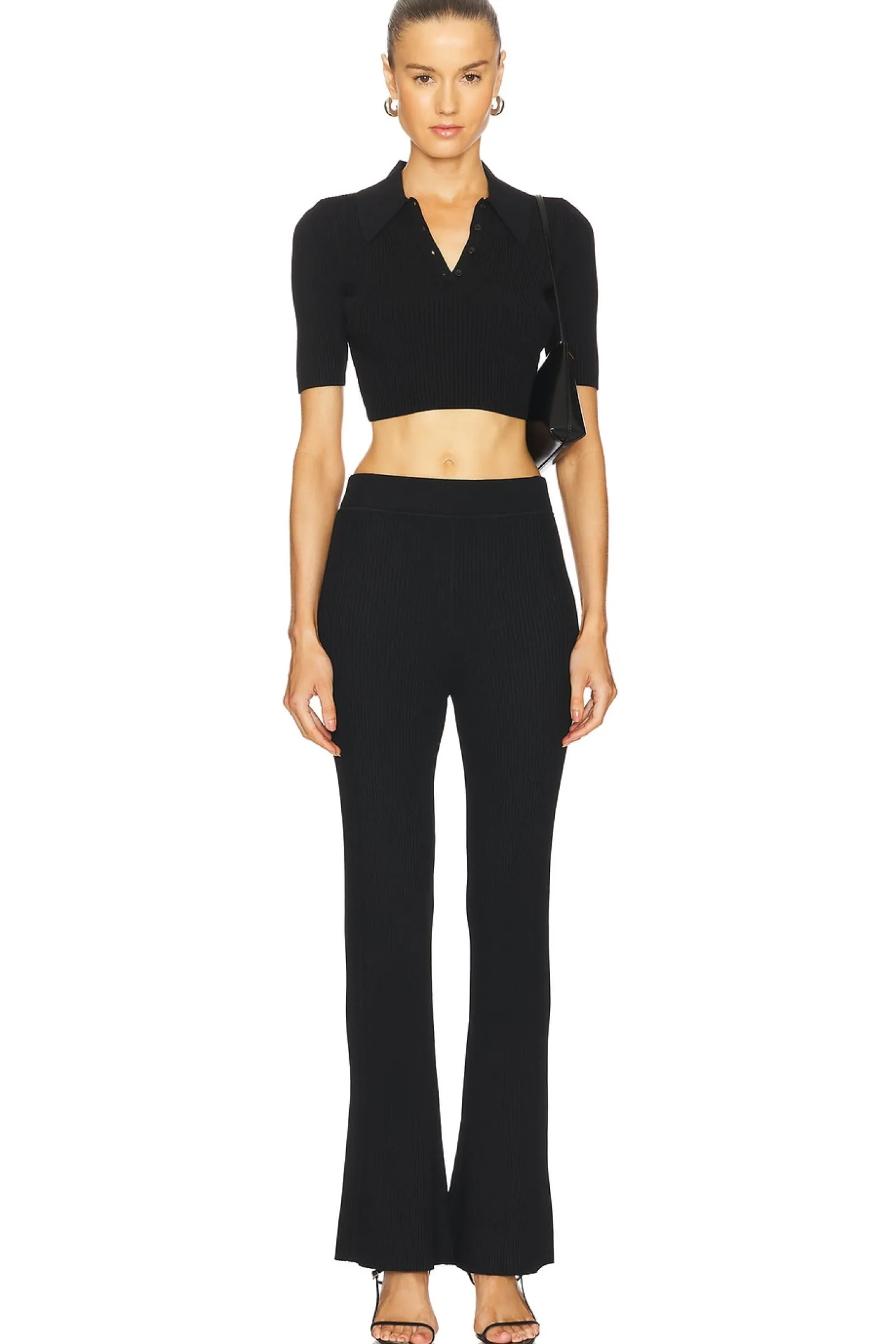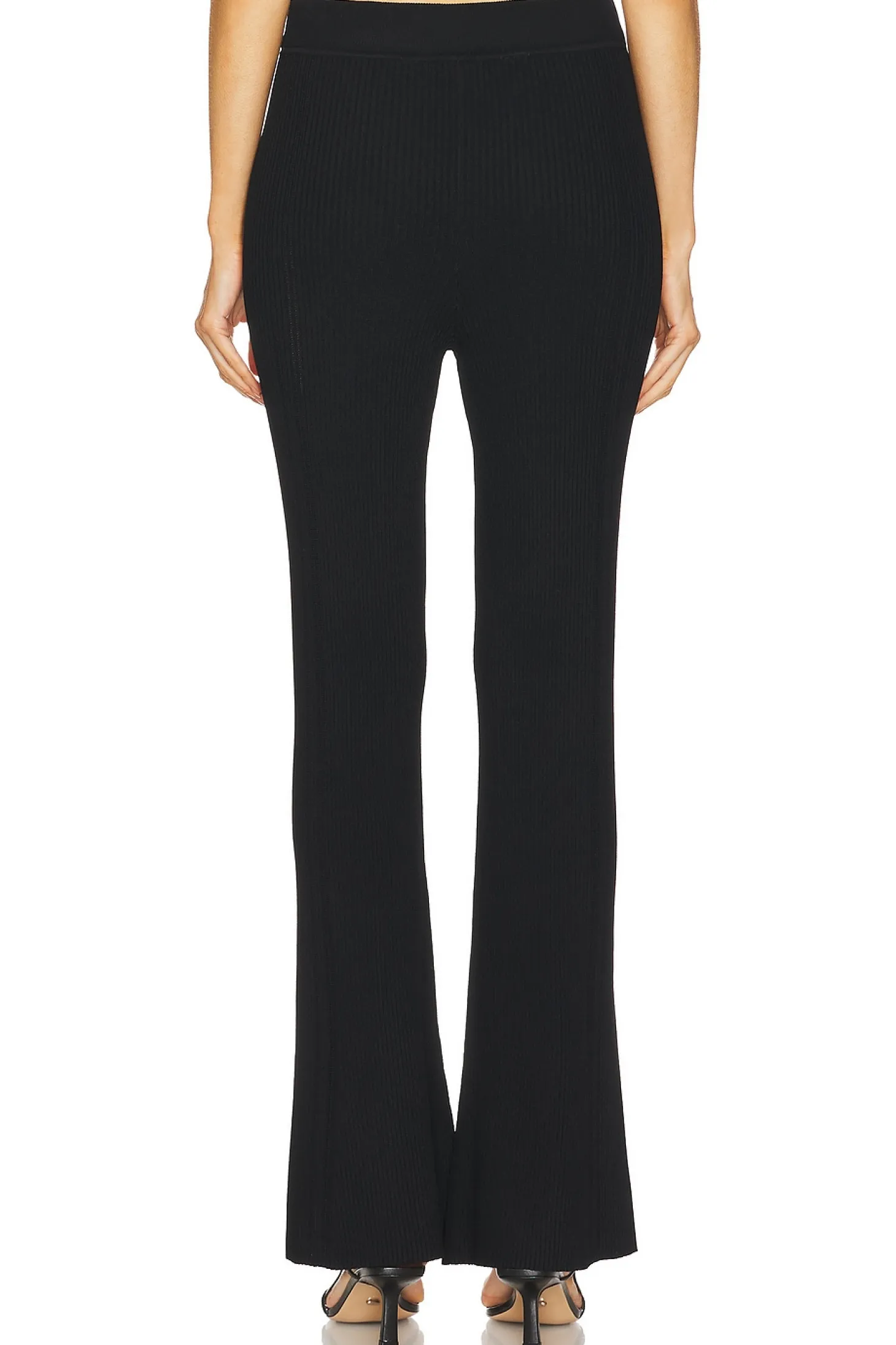 68% viscose 32% nylon.Made in China.Dry clean only.Pull-on styling.Ribbed midweight knit fabric.14" at the knee breaks to 22" at the leg opening