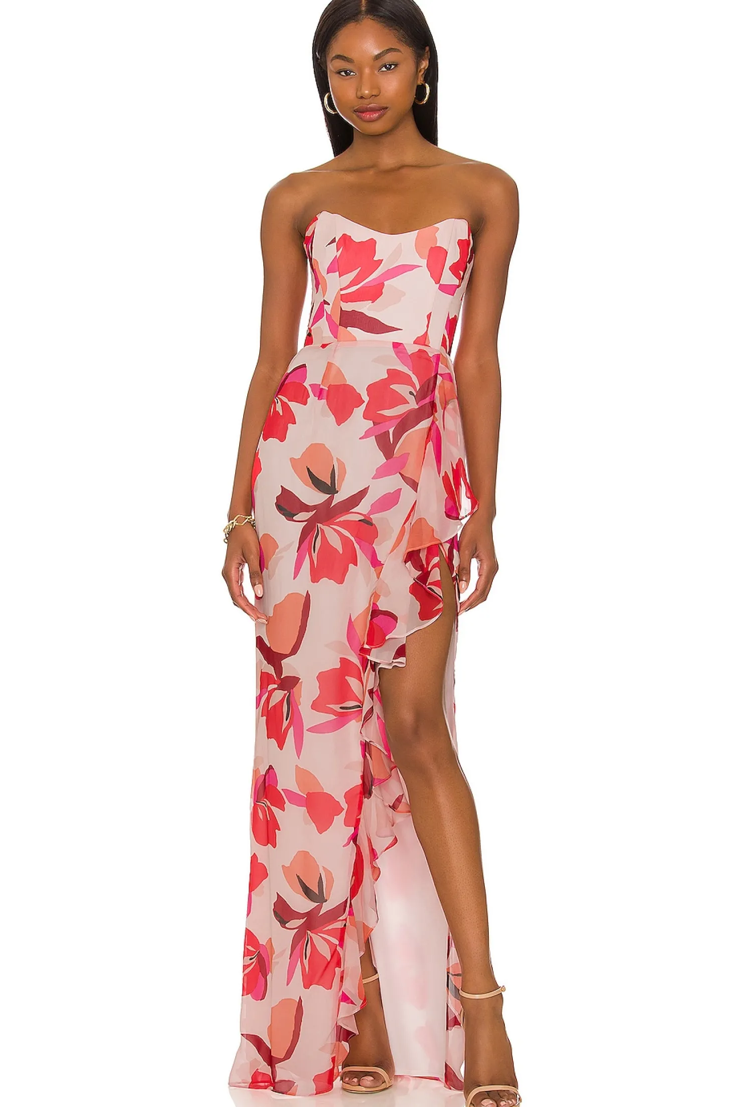 Viscose blend.Imported.Dry clean recommended.Fully lined.Hidden back zipper closure Non-slip silicone grip lining at neckline with boned bodice.Lightweight chiffon fabric with cascading ruffle trim at side seam slit