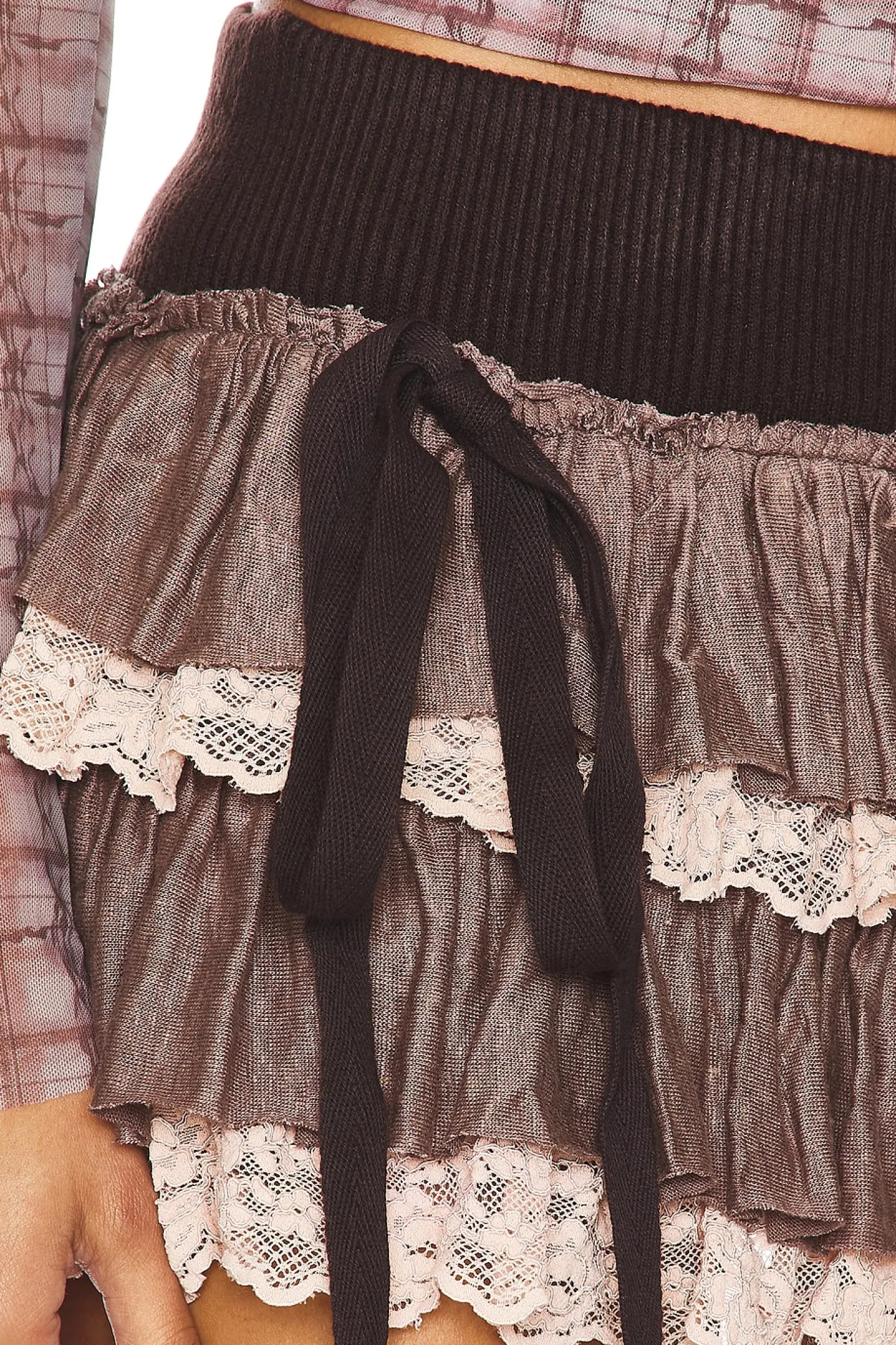 50% linen 50% polyester.Made in China.Machine wash.Fully lined.Pull-on styling with elastic waistband.Knit waistband with tiered linen and lace fabric skirt.Item not sold as set.Skirt measures approx 11" in length